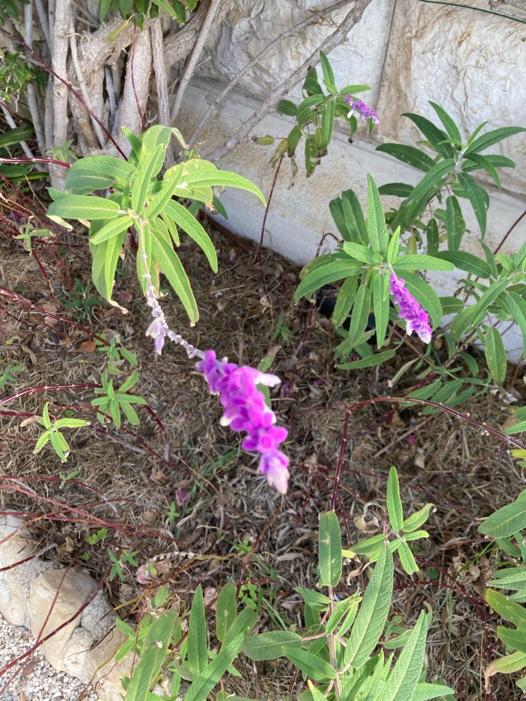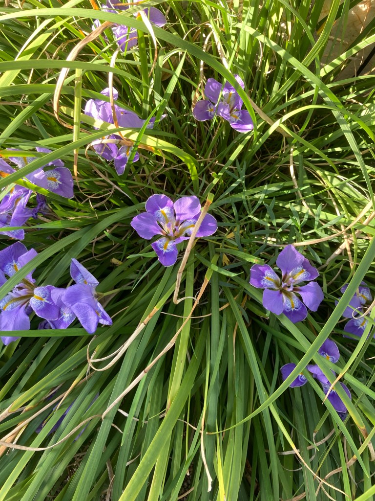 Puis regardant les jolis massifs de fleurs et de pelouse rasée j’ai découvert une fleur dite Iris d’Alger de taille petite et entourée d’autres formant un mini massif violet. L’intérieur de la fleur avait trois pétales mauves uniformes et trois autres irisées de jaune et de traits de pinceaux mauve foncé avec trois autres minuscules langues mauves recourbées. Cela composait un bouquet magnifique et joyeux.