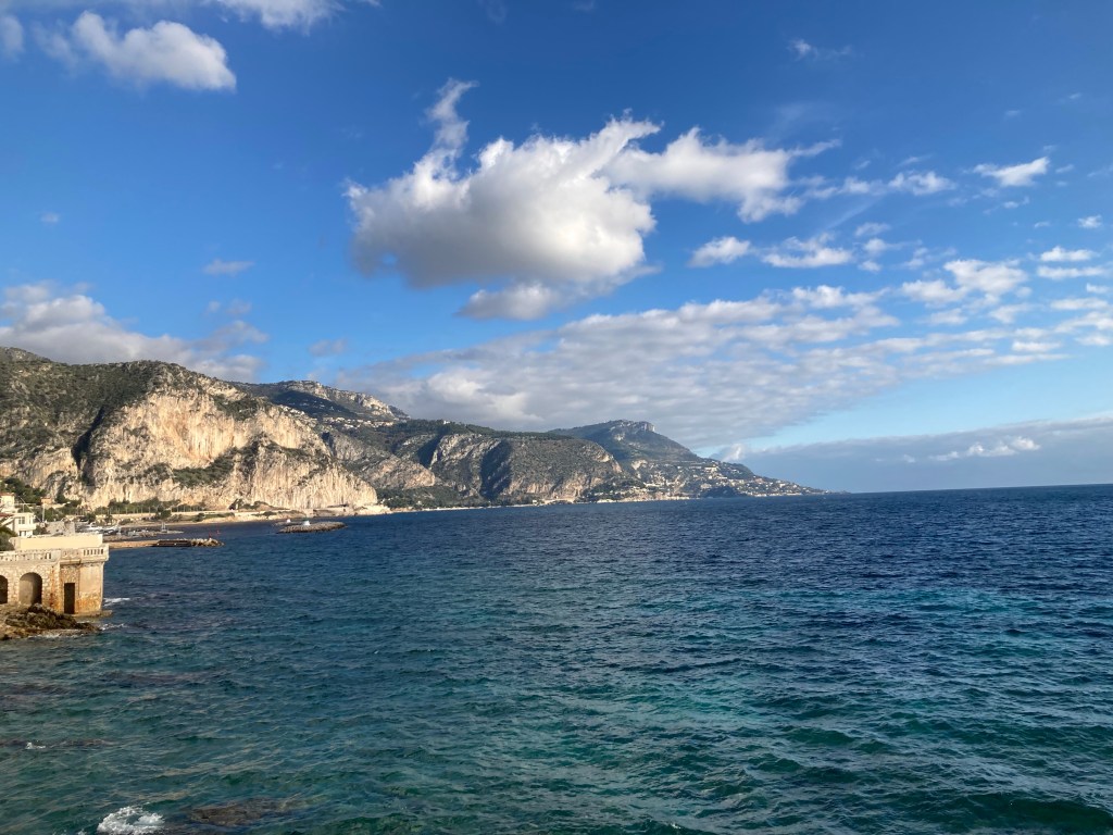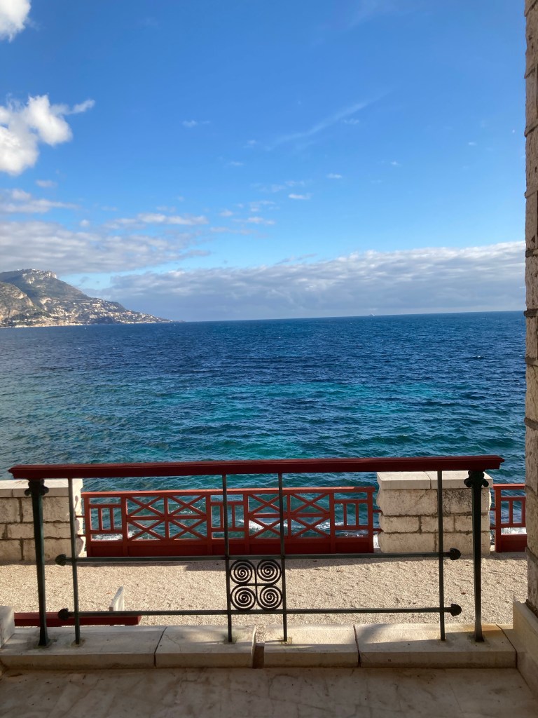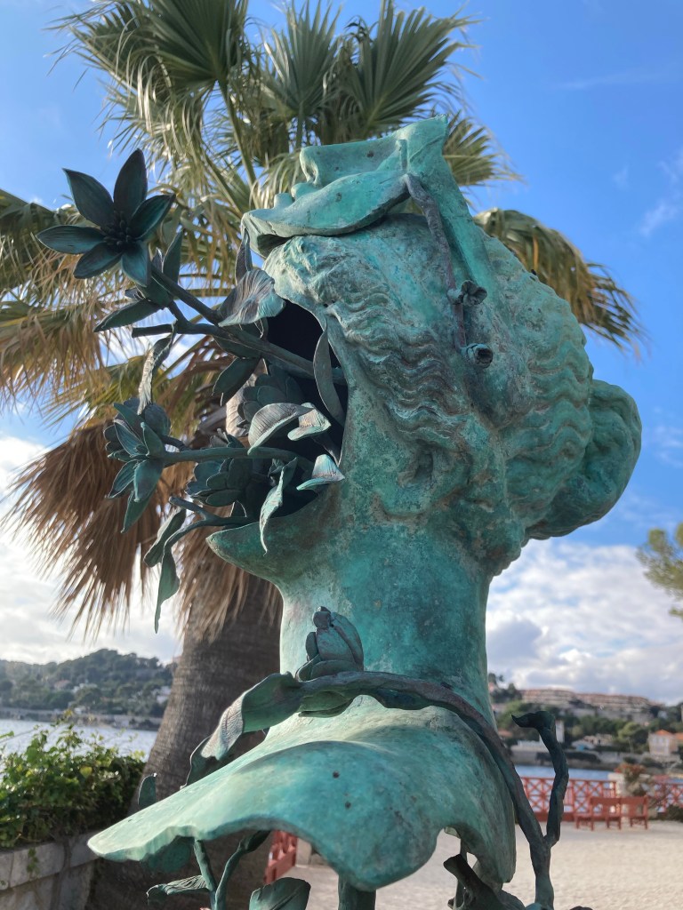 Le jardin était aussi agrémenté de très belles sculptures en pierre ou bien en bronze vert turquoise. Dont cette tête qui dégueulait des fleurs dardant le soleil. Et puis de là on pouvait voir l’autre côté de la baie avec vue sur la côte jusqu’à Menton.