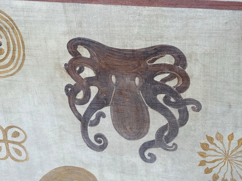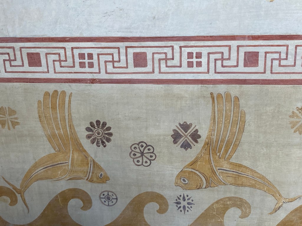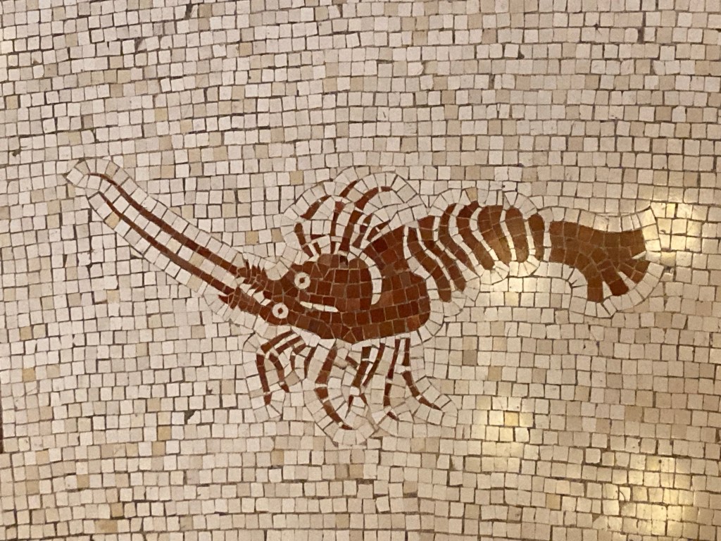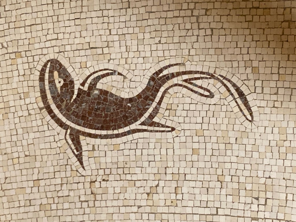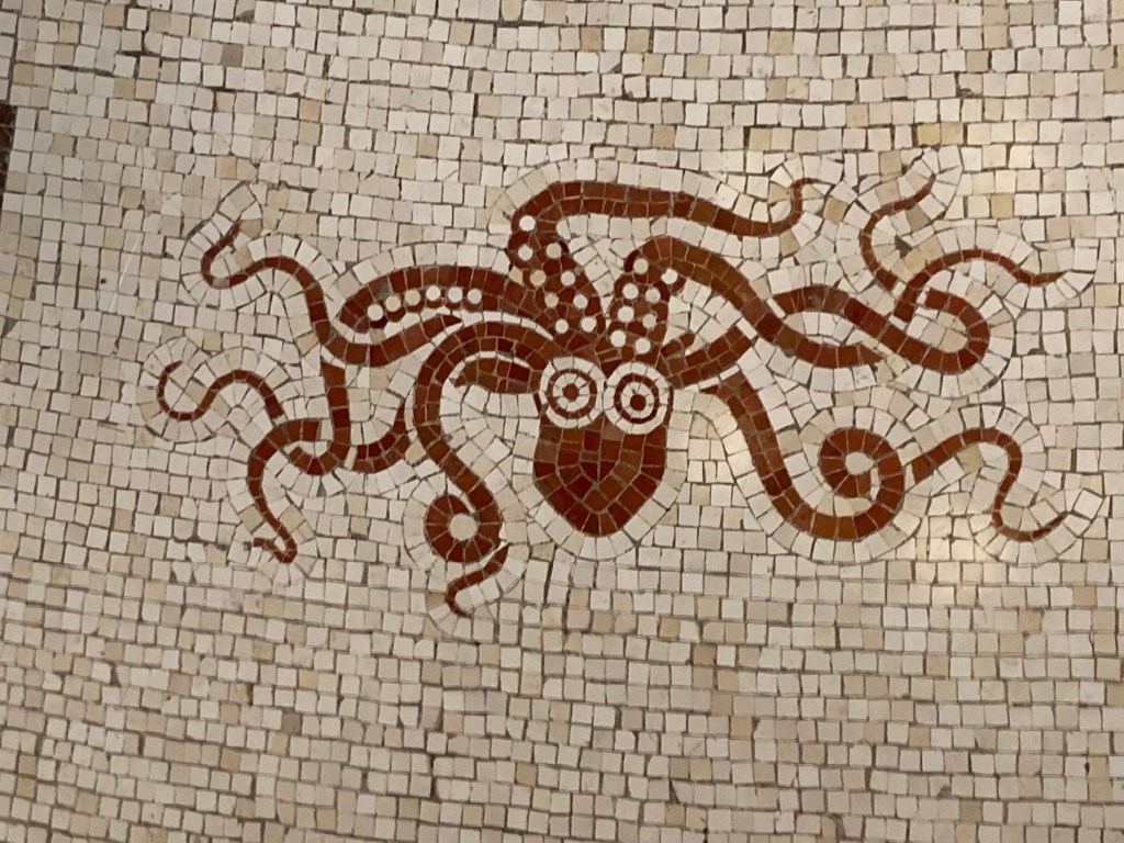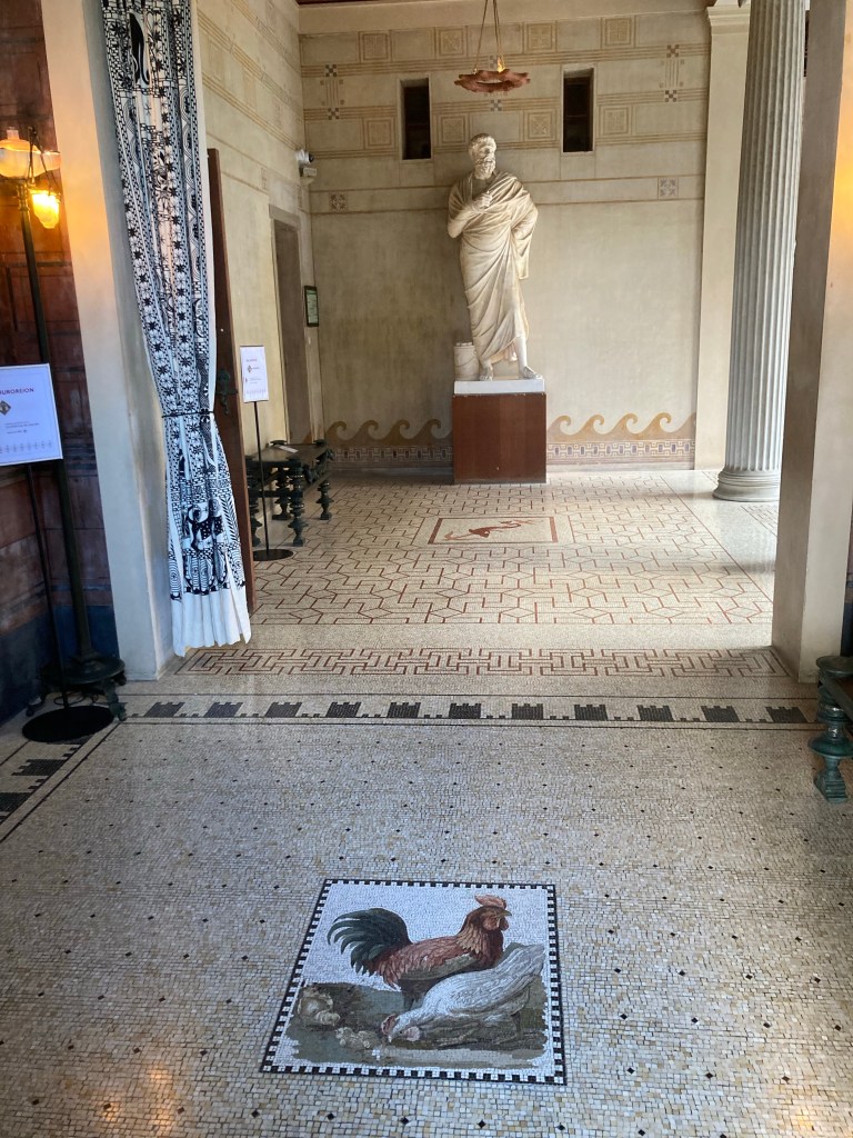 Tout d’abord l’entrée qui offre une fresque au mur marron avec une coupe où l’eau coule pour les oiseaux ; au sol un coq avec sa poule collée contre lui qui vous regarde droit dans les yeux – représente la famille ; et à la gauche les thermes ou salle des naïades. A juste regarder le sol des thermes et on est transporté vers la mer et ses habitants, les poissons !
