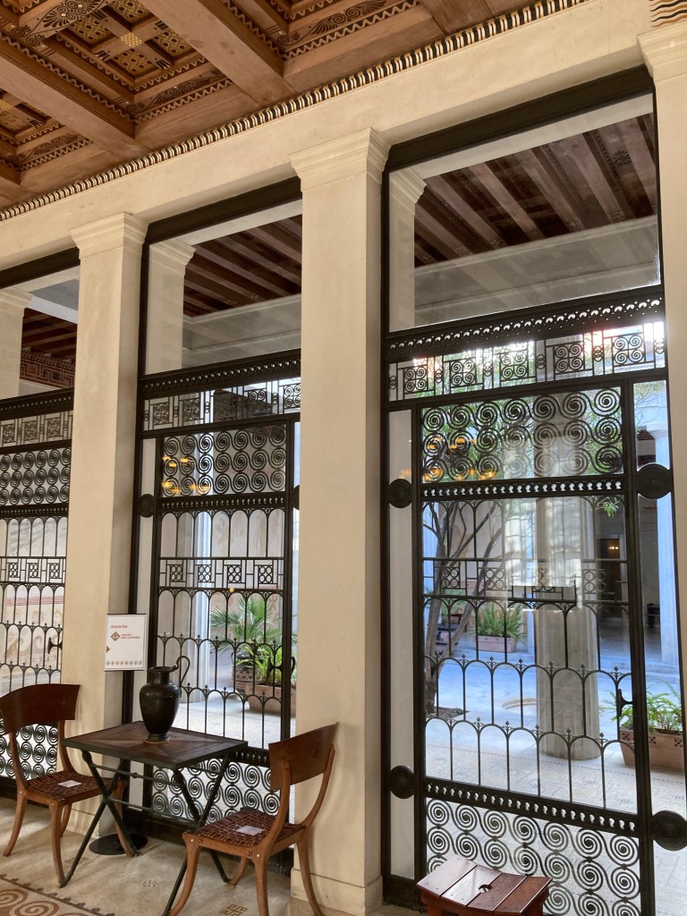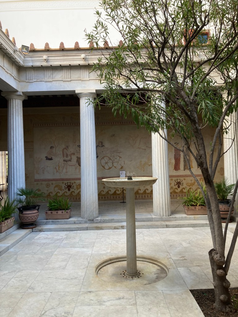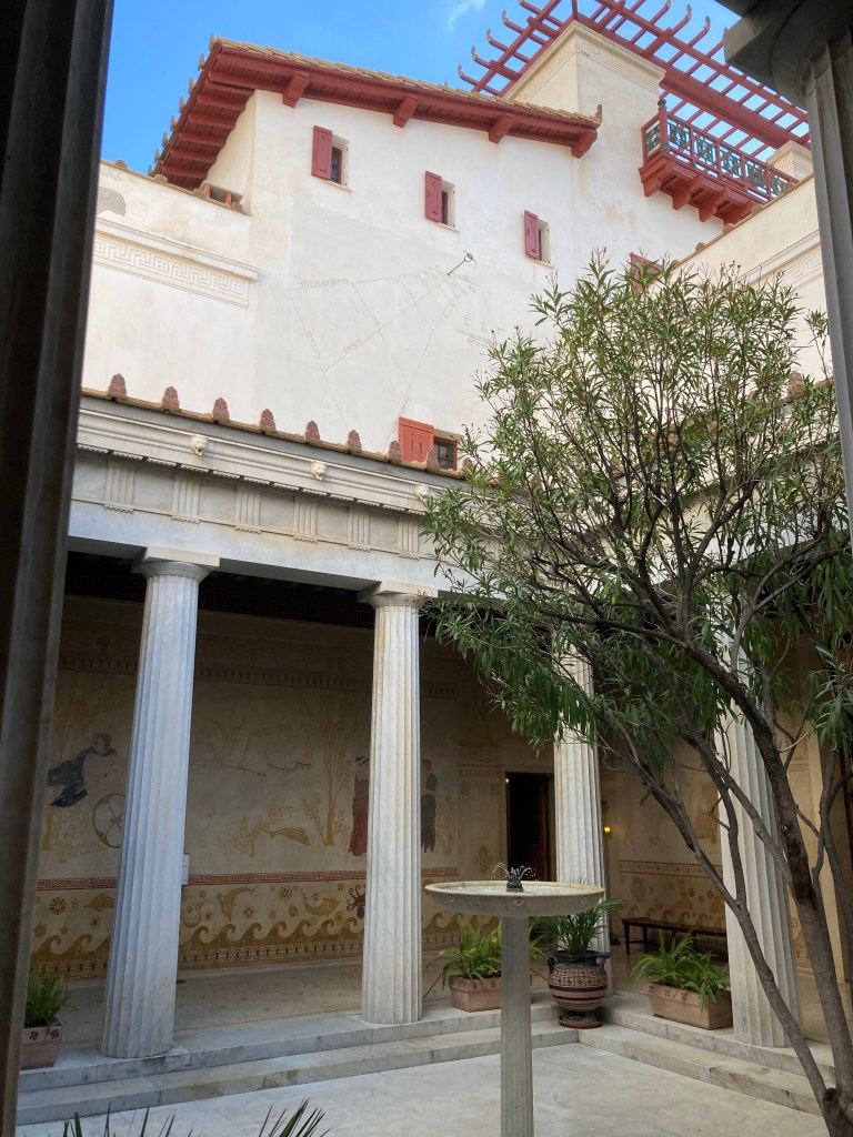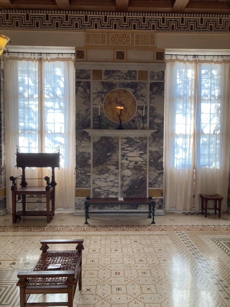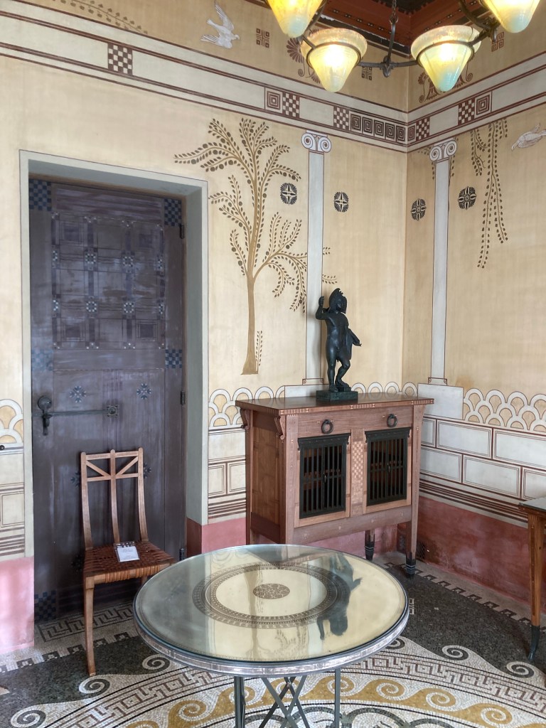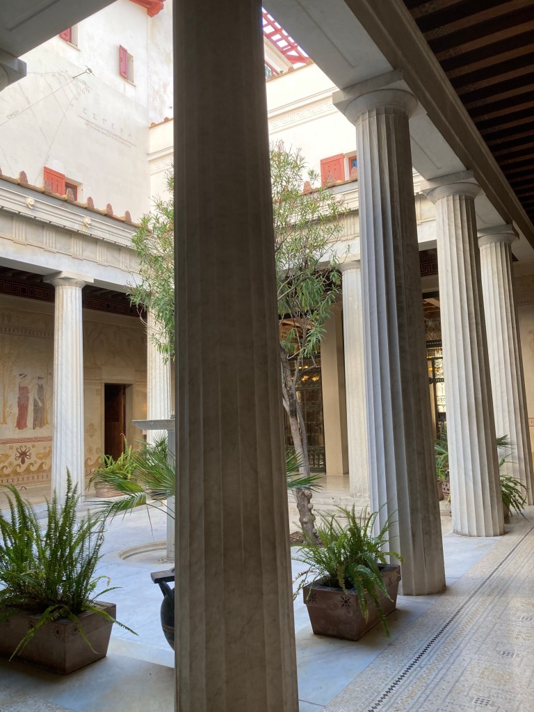 Et là on arrive dans le péristyle où des colonnes doriques grecques font le pourtour et au milieu une vasque où coule de l’eau rafraichit votre esprit. Des plantes, des arbres sont posés pour vous reposer et les sols et murs sont décorés de mosaïques représentant des dauphins, des poulpes, des poissons volants et tout autour les murs sont ornés de fresques. Quant aux murs des fresques du retour d‘Apollon ou d’Héphaïstos couronnent le tout. Et surtout la merveille des merveilles est de pouvoir voir à travers les fers forgés le salon.