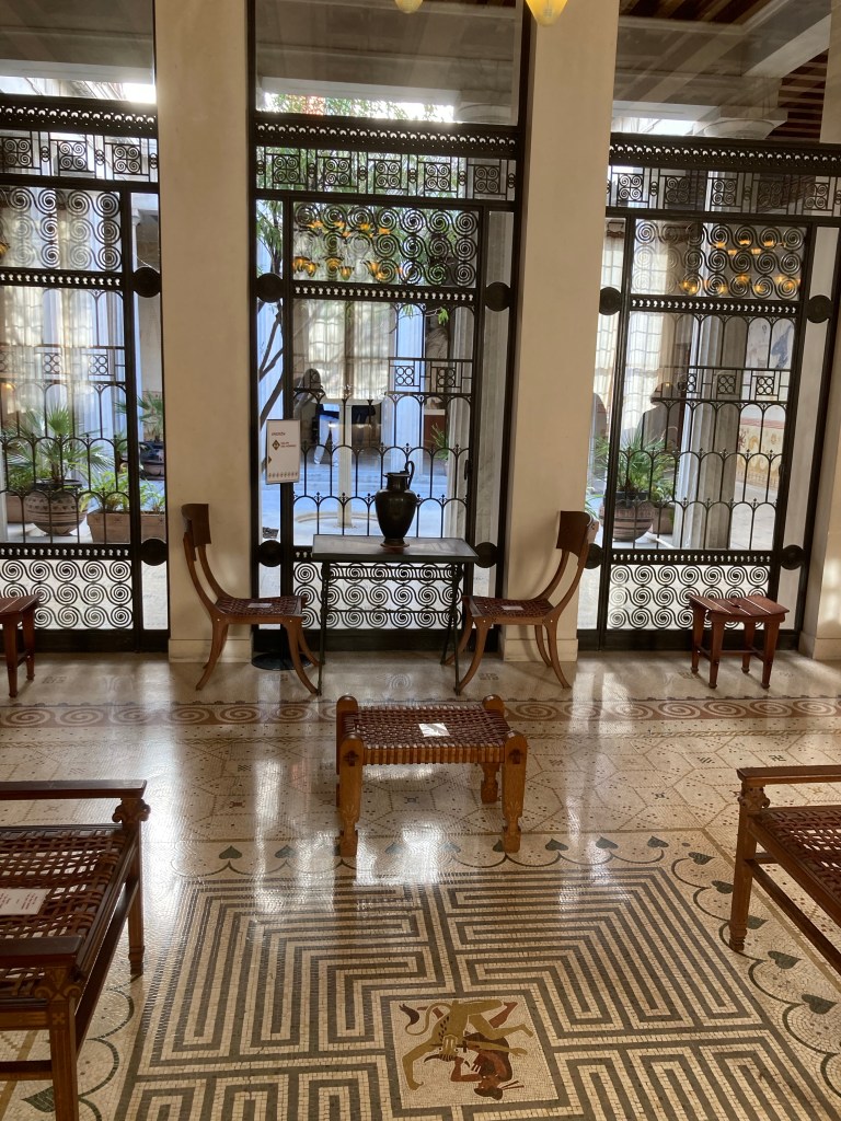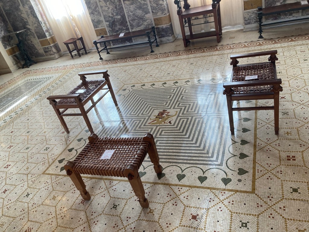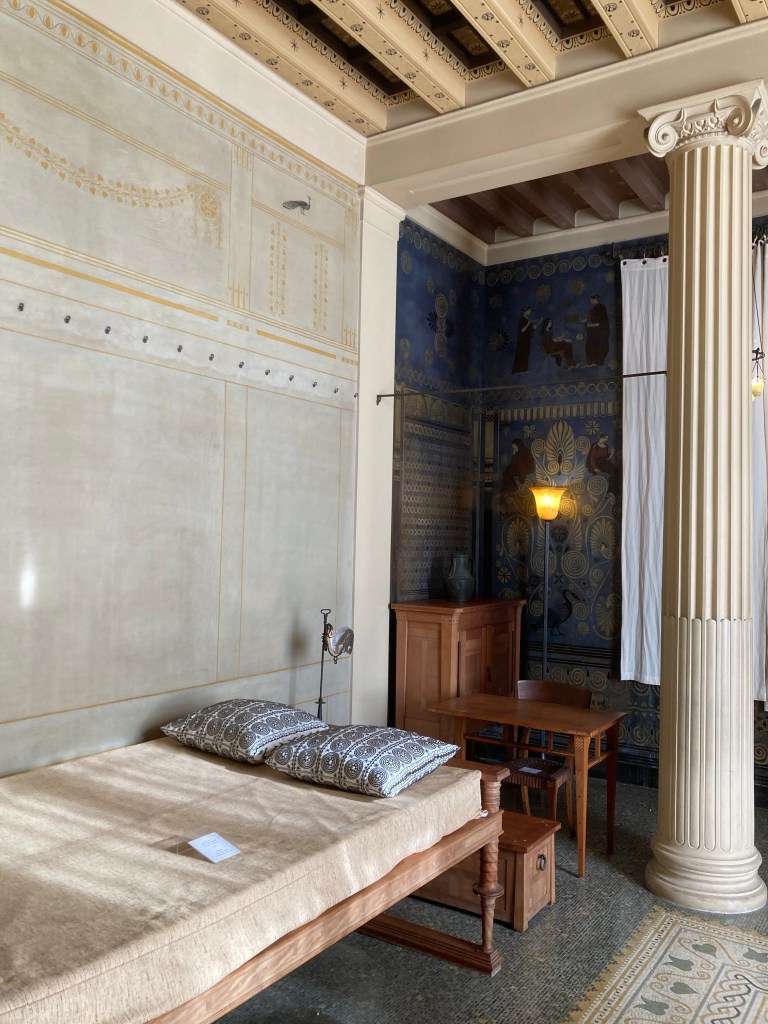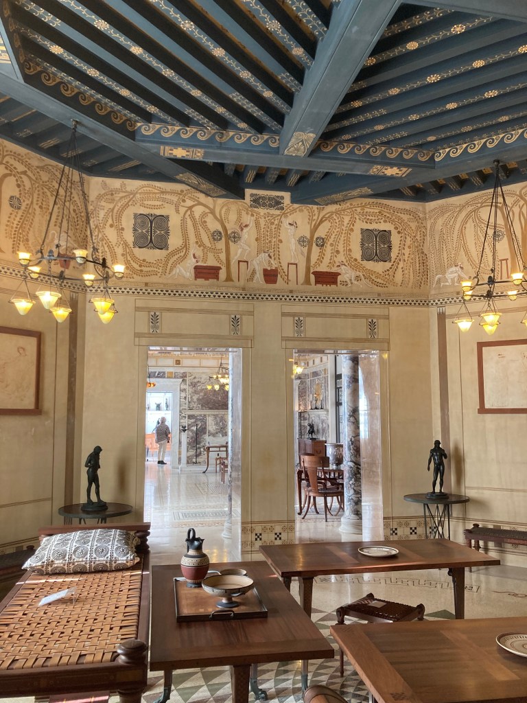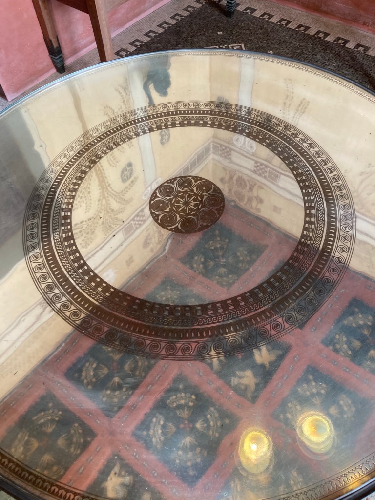 Et on passe dans le salon avec fauteuils, tables en verre pour la transparence et vues sur la mer mais aussi sur le péristyle. La pièce par endroit a un style égyptien voire chinois pour moi. En particulier ces murs en faux marbre noir tacheté de blanc avec les lampes rayonnant de jaune. On peut aussi admirer les mosaïques au sol dont le labyrinthe de Thésée et du Minotaure qui se trouve à Vienne aujourd’hui. Quant aux plafonds en caissons couleur or ravissent et donnent de la luminosité.
