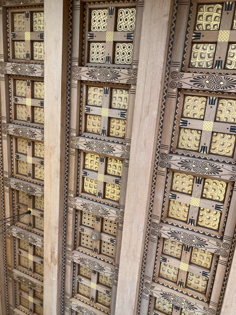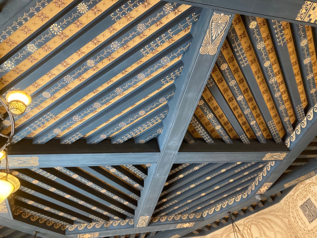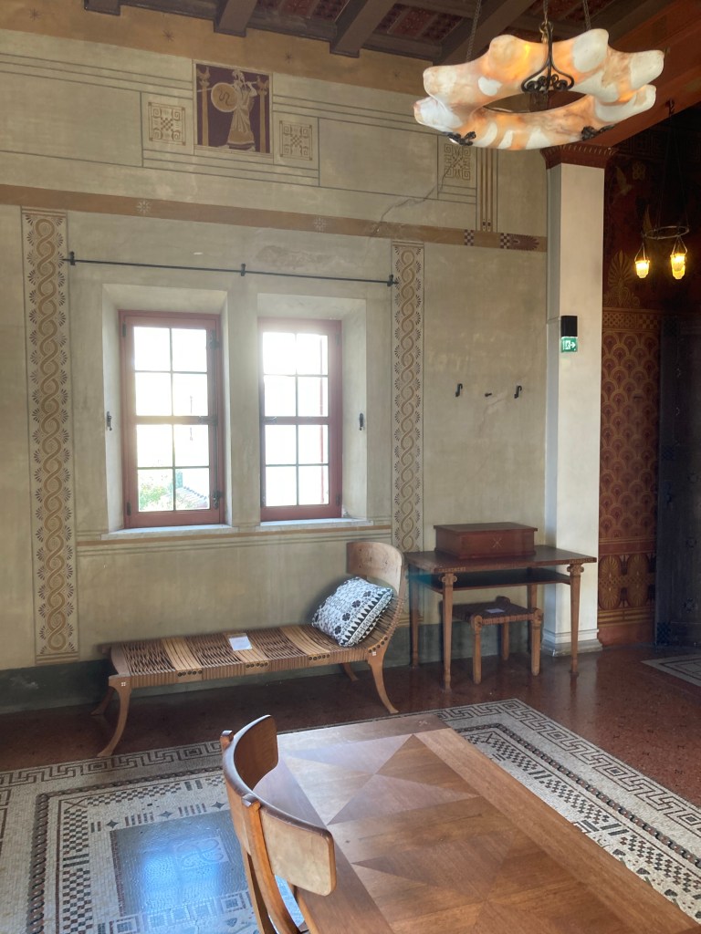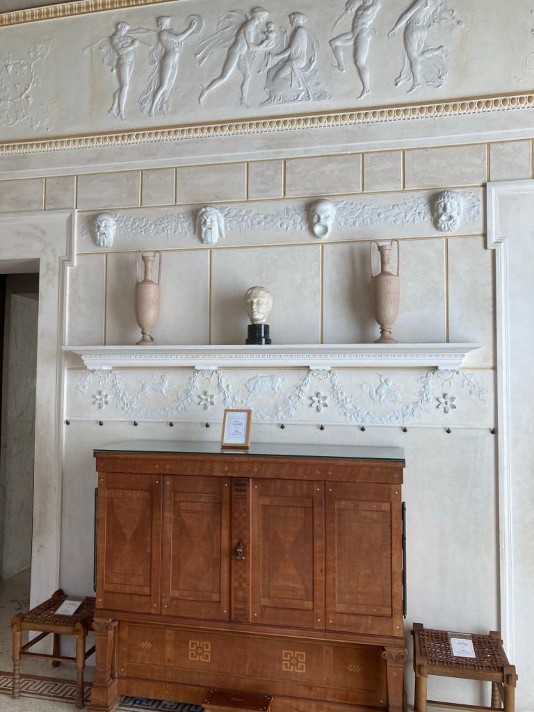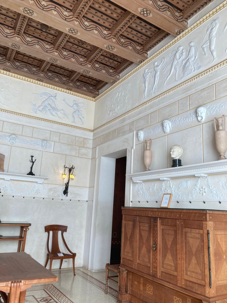 Pour l’atteindre on traverse la bibliothèque puis le vestibule et la salle à manger qui offre une vue sur la mer et des plafonds bleus. De forme octogonale et avec des pans coupés on l’impression d’être dans les mille et une nuit ! Plafond orné de fleurs dorées et de tiges ! Et le haut du mur est peint de travaux des champs. Au sol des animaux marins vous projettent dans la mer : dauphins, homards, poulpes dansant – une féérie méditerranéenne !