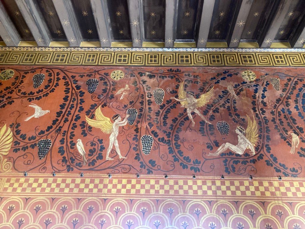 Et enfin la chambre de Monsieur ou chambre des amours en rouge où le Dieu Eros est représenté. Vue sur le port. Plein de petits amours avec des ailes prélèvent des raisins des grappes et ornent tout le pourtour de la chambre. Au sol la coupe attique de Dionysos.