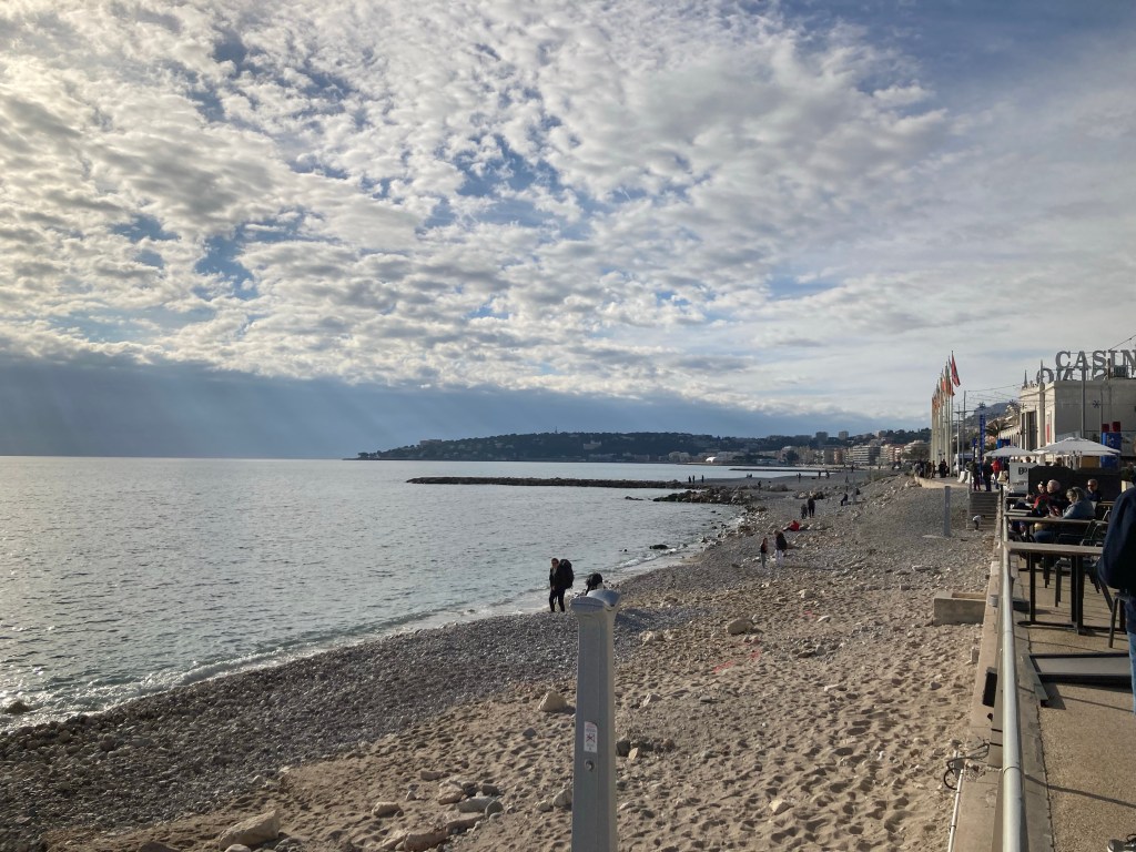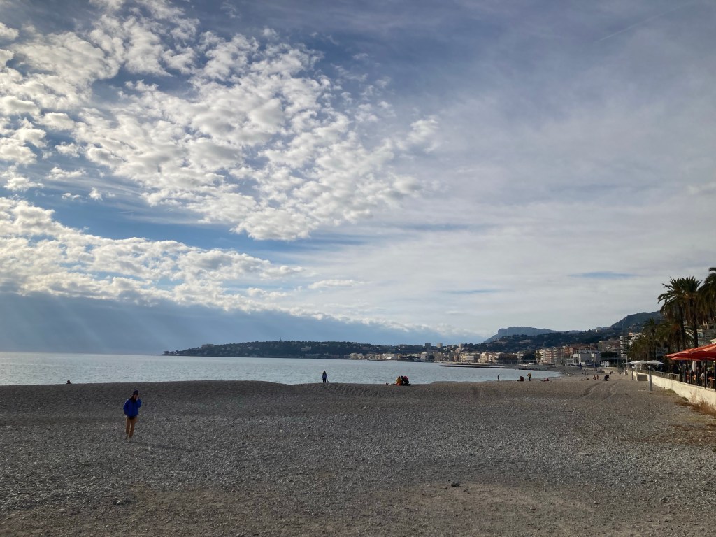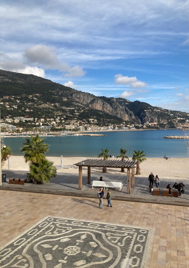 Une autre plage s’offrait à moi avec des cafés en contre-bas sur la plage avec une très belle mosaïque en galets noirs, gris. Vue sur le paysage idyllique et reposant.