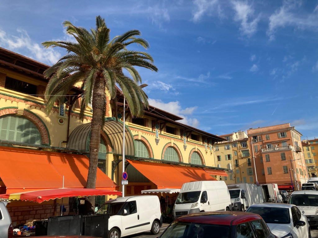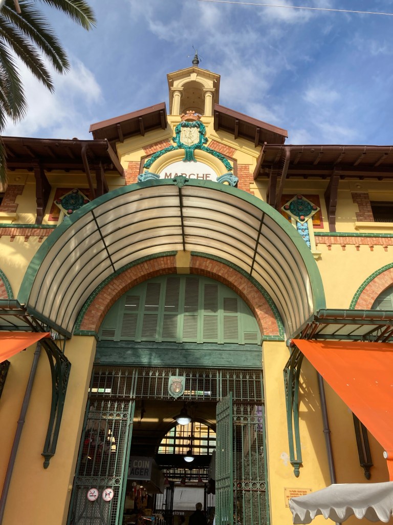 Je suis entrée dans les halles du marché de Menton entourées de palmiers. Portes avec des grilles vertes et des arcs en verre. Tout un style.