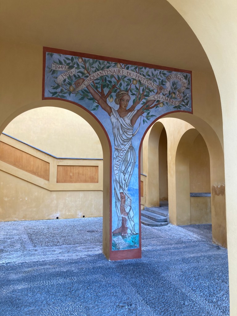 La ville a quelques églises et surtout elle est en montée. Beaucoup d’escaliers ! Dans un des escaliers il y avait cette très jolie fresque représentant une femme avec des citrons et portant à bout de bras une banderole marquant le cinquantenaire du festival du musique de chambre. On en apprend tous les jours !