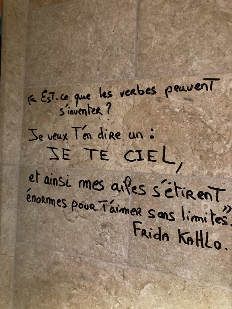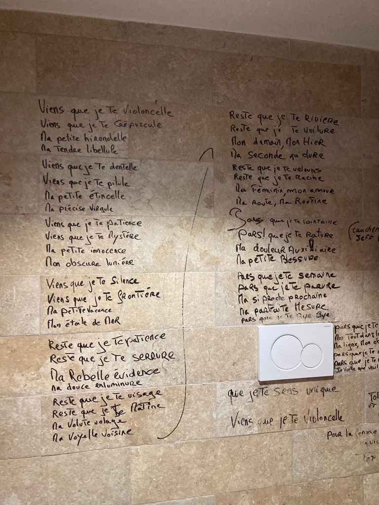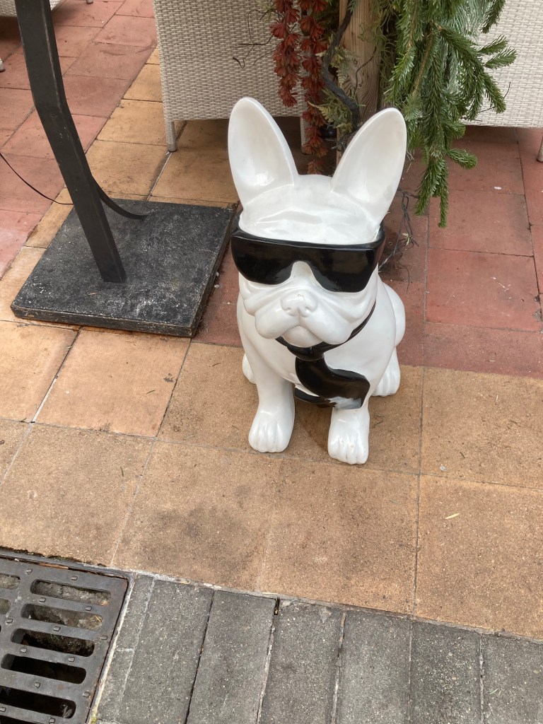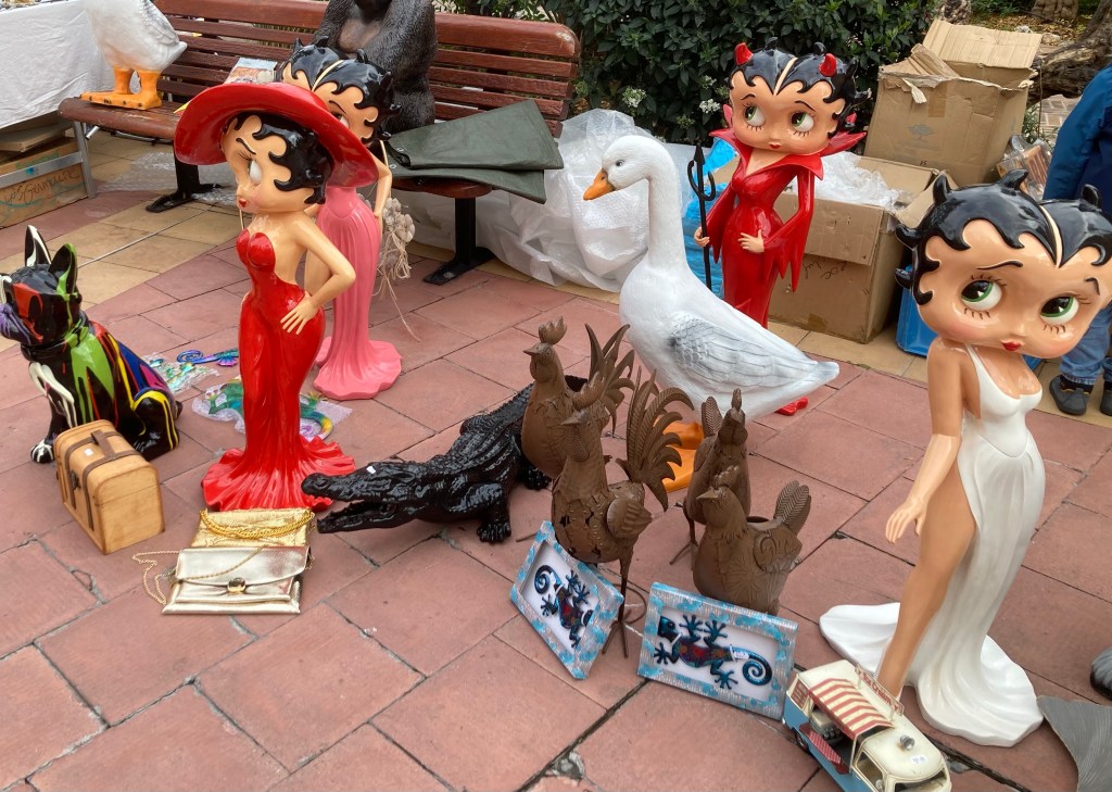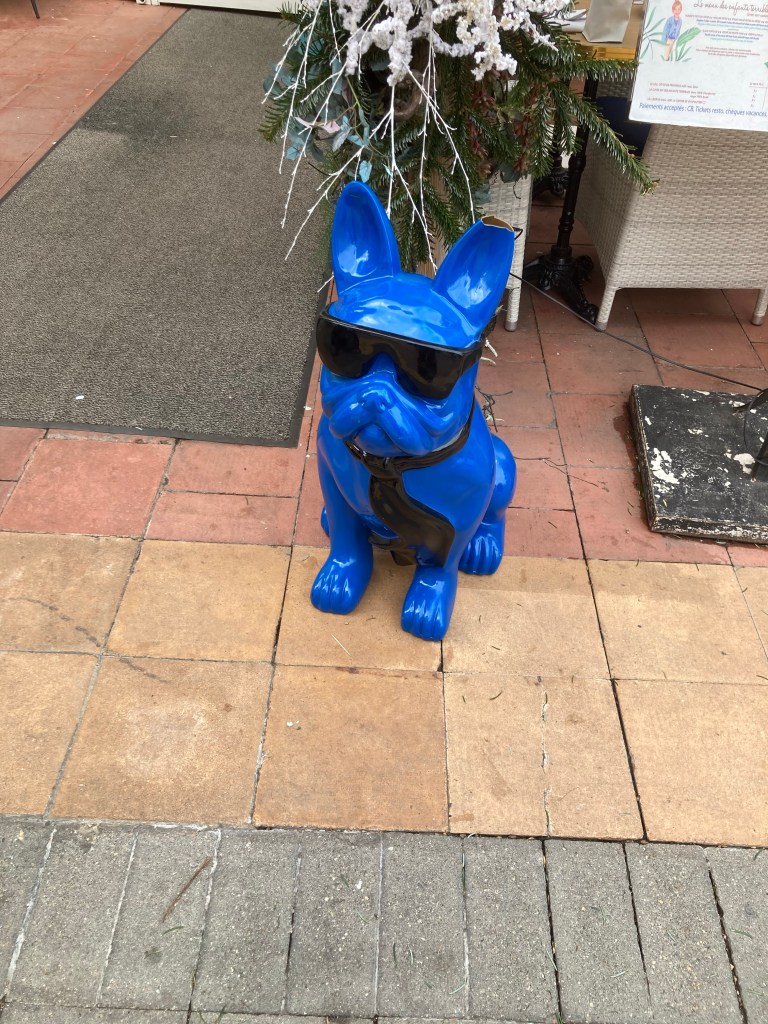 Les assiettes, les murs des WC avec des poésies écrites au mur et l’humour avec les deux dogues bleu et blanc à l’entrée ! En face il y avait une foire à la farfouille et je me suis amusée à regarder Lollipop !