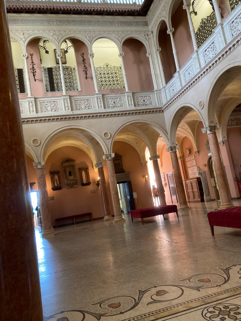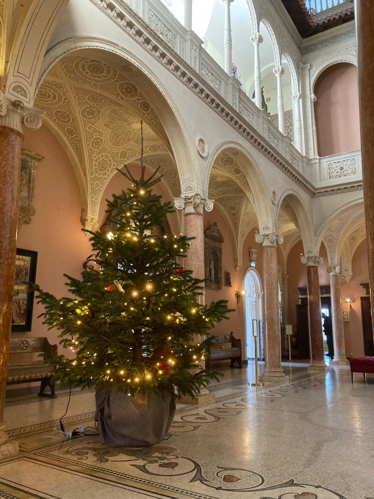 L’intérieur tout en mosaïques avec des sapins de Noël éclairés de boules. Toujours rose bonbon à l’intérieur.