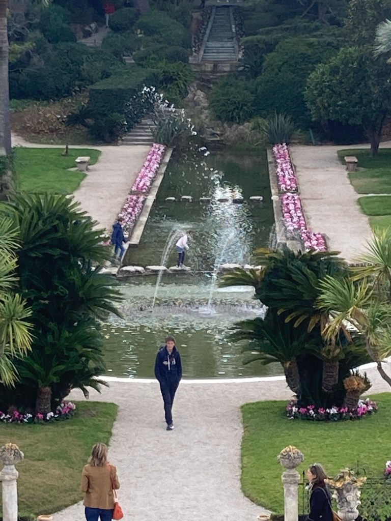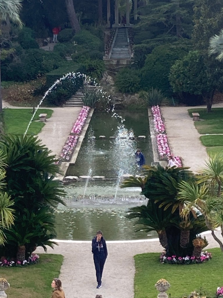 Et tout en haut on pouvait voir les cascades allant presque jusqu’à la villa. Un joli dédale d’eau en étage, de fleurs blanches et mauves qui chute d’un coup vers le parterre central pour donner des jets d’eau qui font des boucles et embellissent la villa.