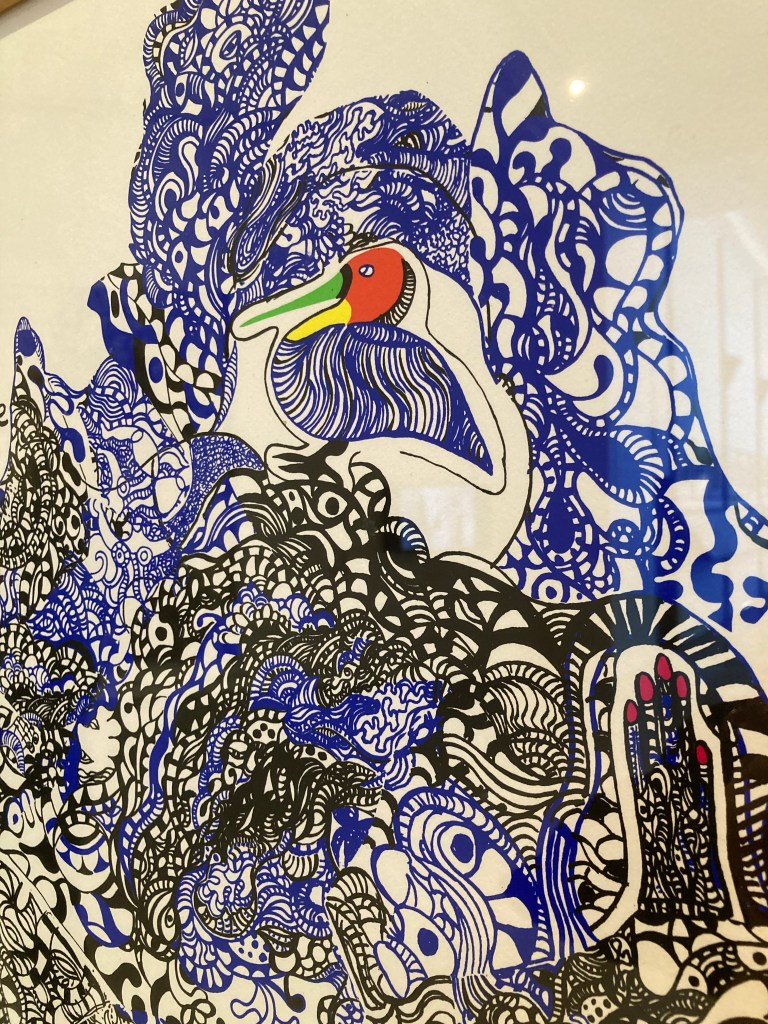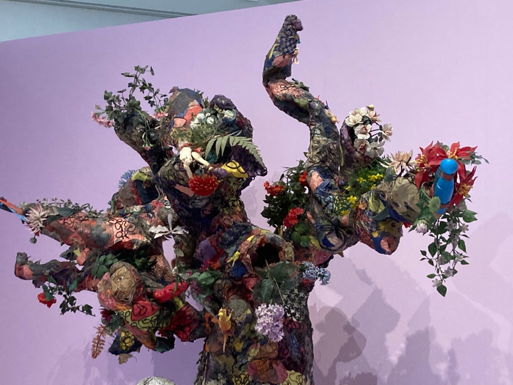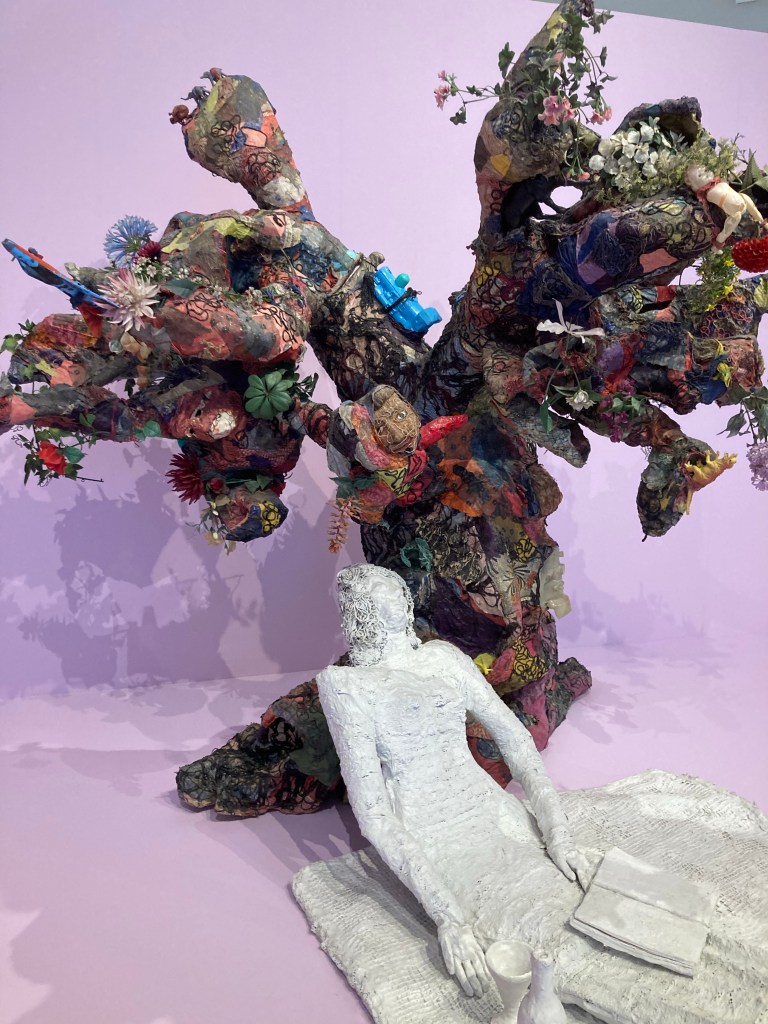 Ou cet arbre au tronc coloré et aux branches remplies de mille et une œuvre. Des branches comme des bras qui partent dans tous les sens avec des fleurs et des feuilles et des doigts en forme de bouteille bleue. Dans ces branches on peut découvrir des visages ou des bébés dans des langes. Des trains en plastique bleu qui affrontent les montées drues et au bout de la branche comme des cheminées. Un enchevêtrement d’objets qui vous transportent dans un monde des mille et une nuit.