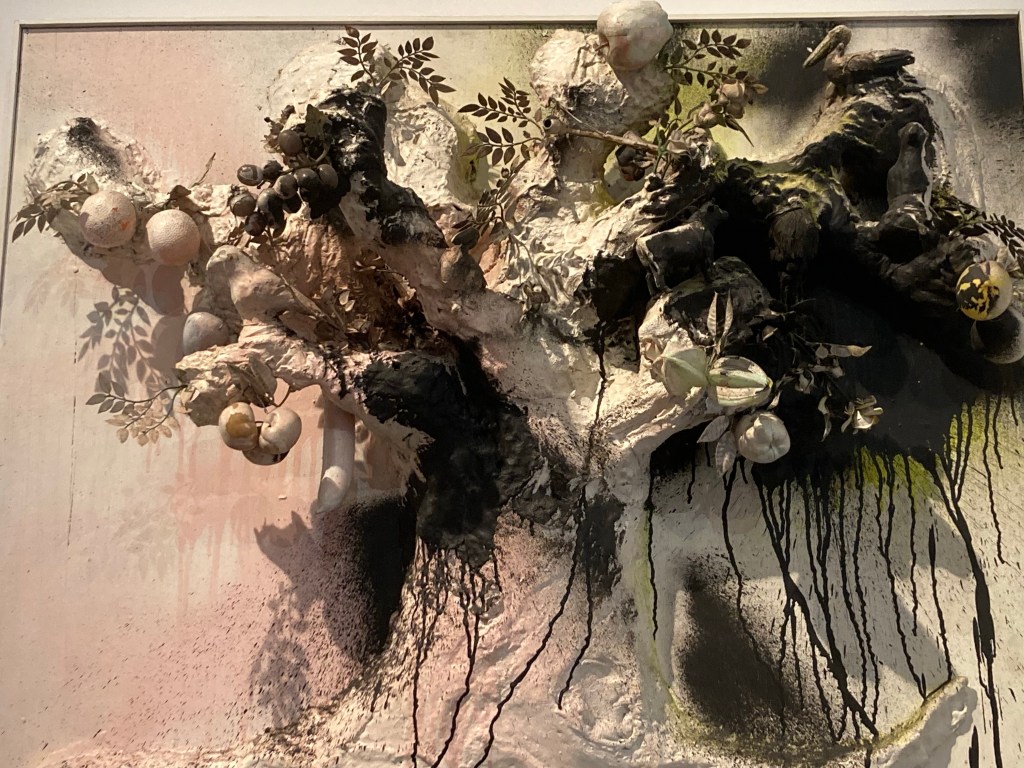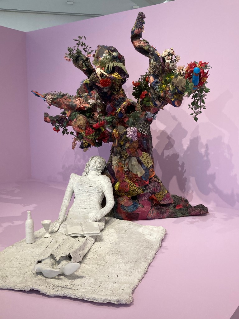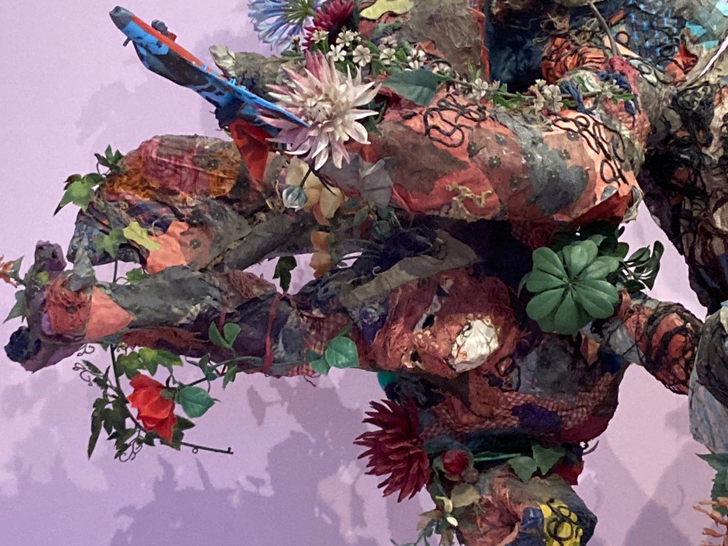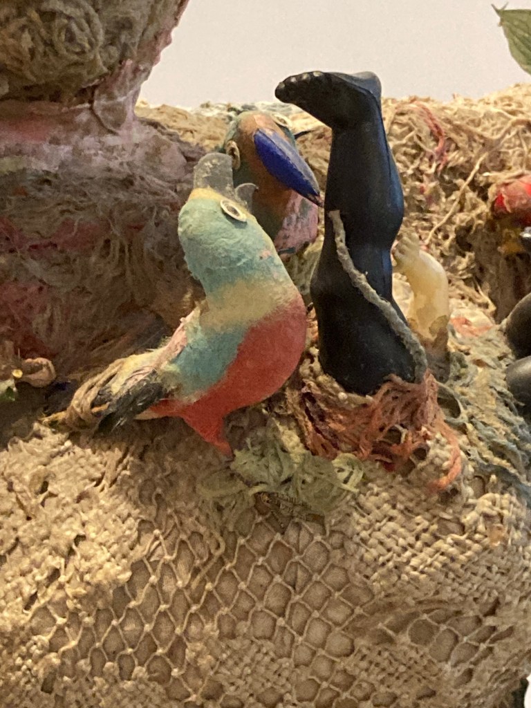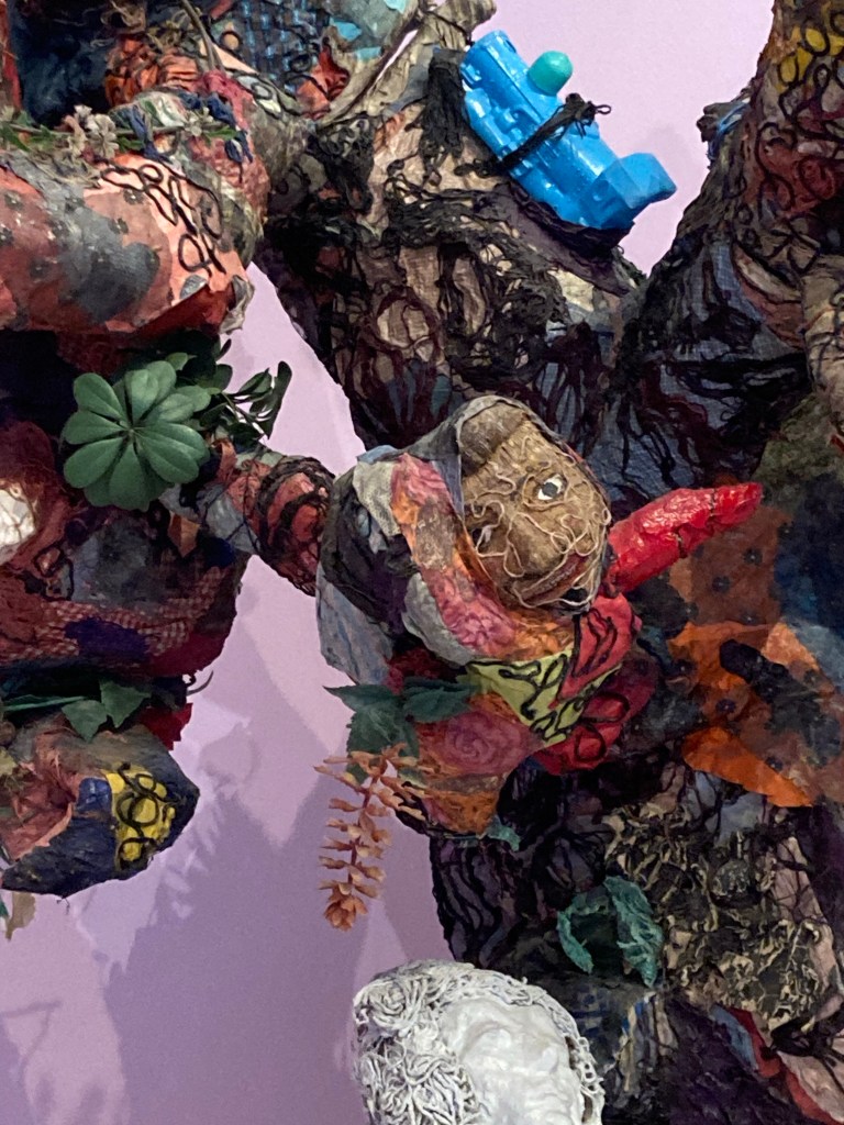 Et je reviens à ces œuvres en sorte de papier maché avec cette femme la tête à l’envers avec des fesses qui ressemblent à des seins entourés de tissus colorés faisant ressortir les tétons !