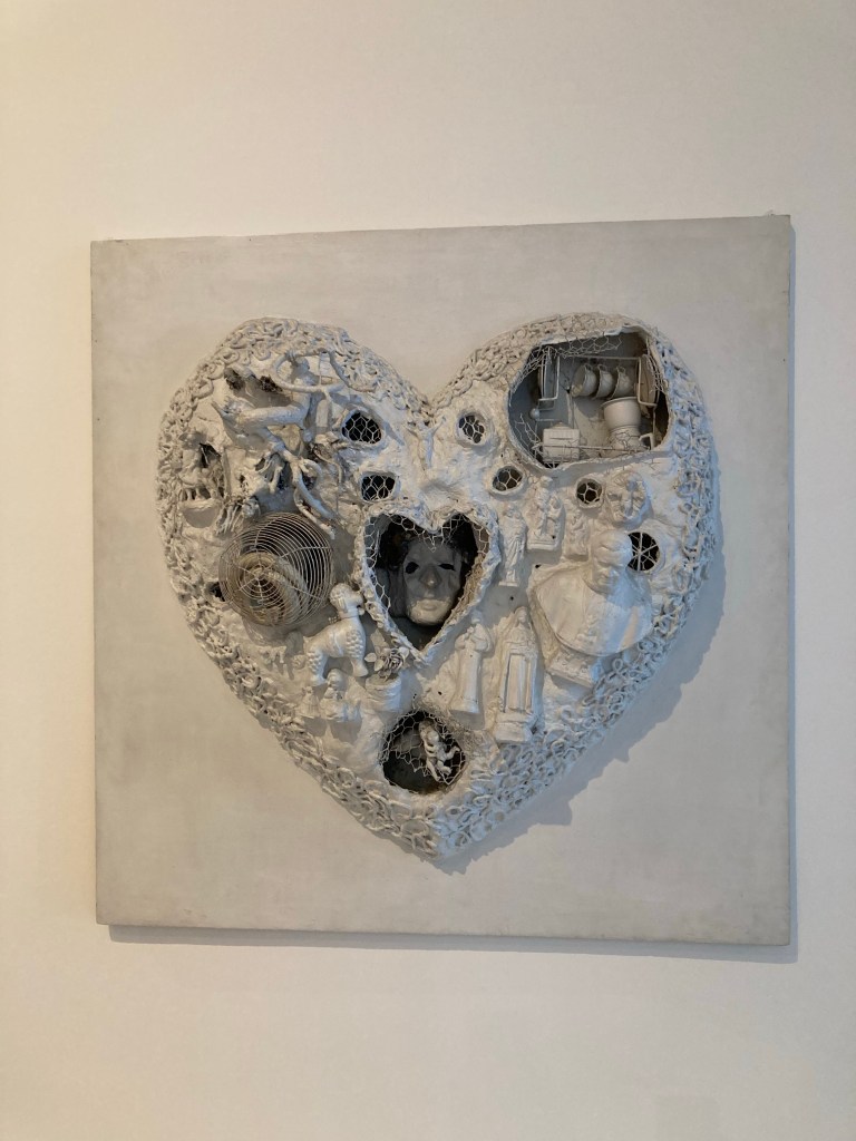 La première me fait penser à l’art mexicain. Ce cœur blanc avec ce visage dans le cœur qui fait penser à un crâne. Ce cœur qui porte tous les stigmates de notre société de consommation que je ne détaillerais pas. Toute la bigoterie et les attributs alloués à la femme. Ce tableau peut faire peur de loin !