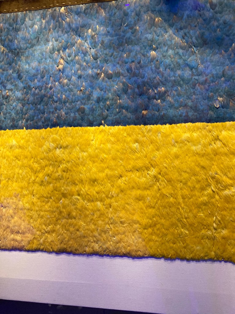 A l’entrée de l’exposition, j’ai d’abord trouvé un clin d’œil au drapeau ukrainien par un tissu de plumes jaunes et bleu.