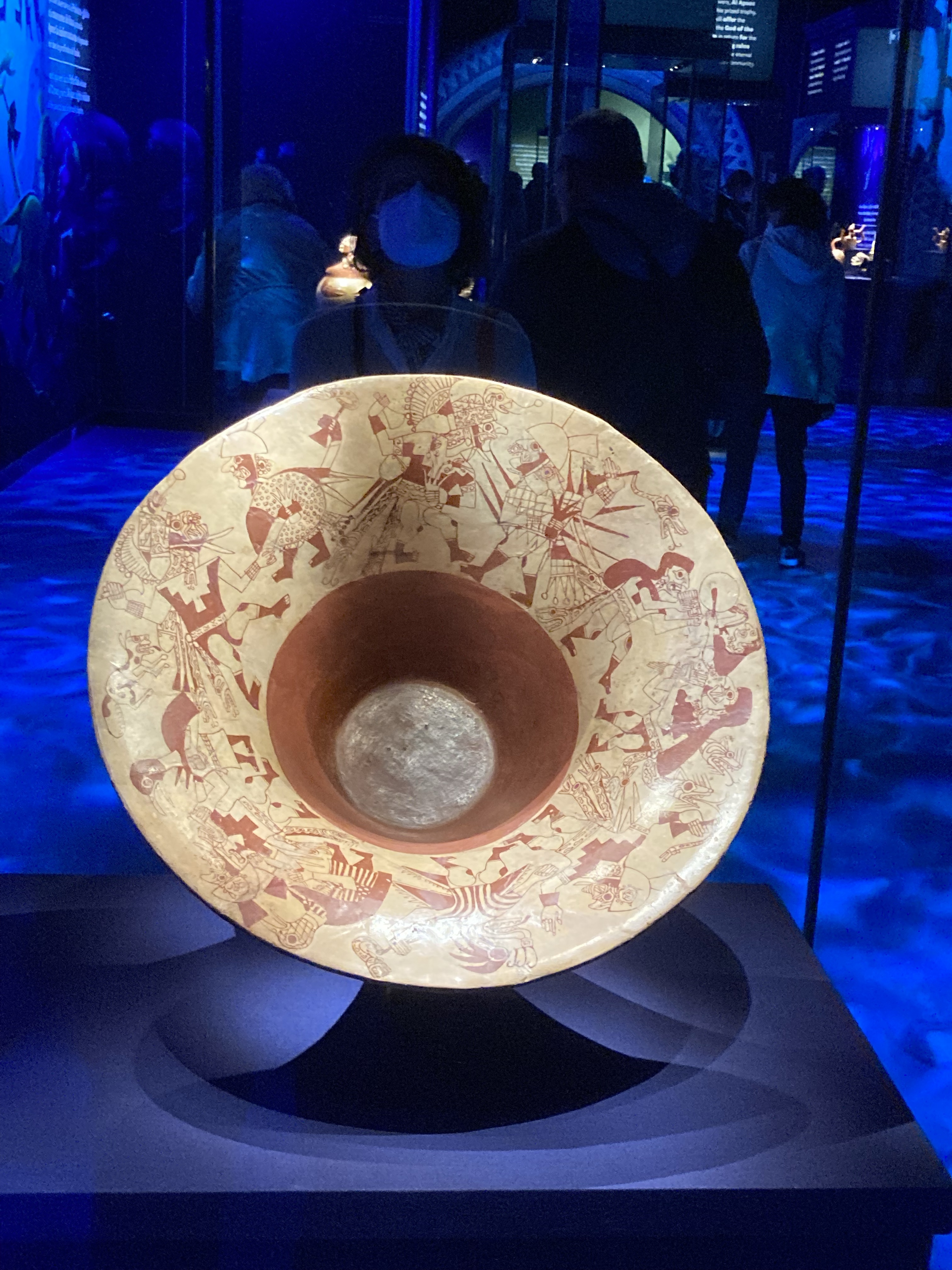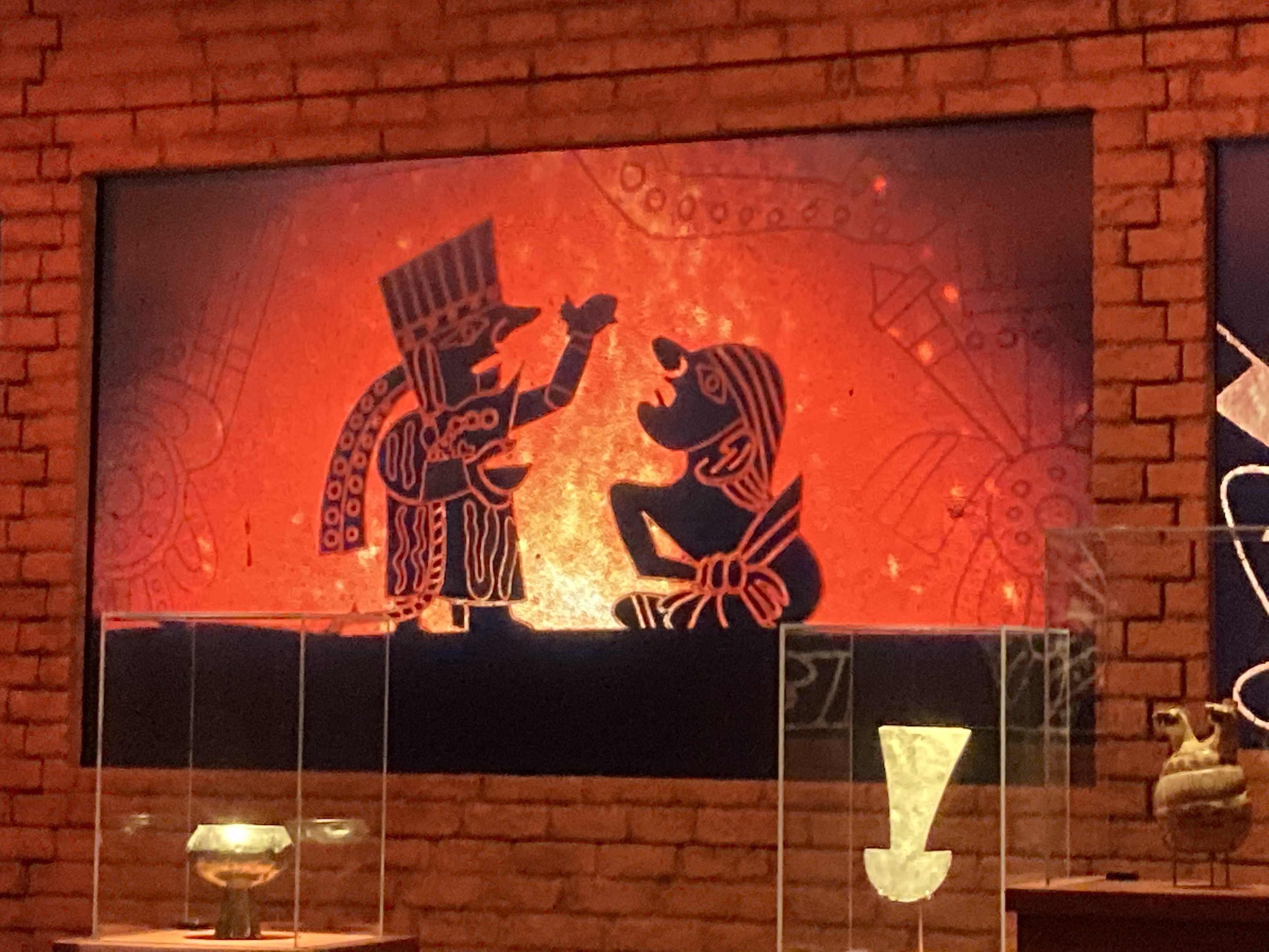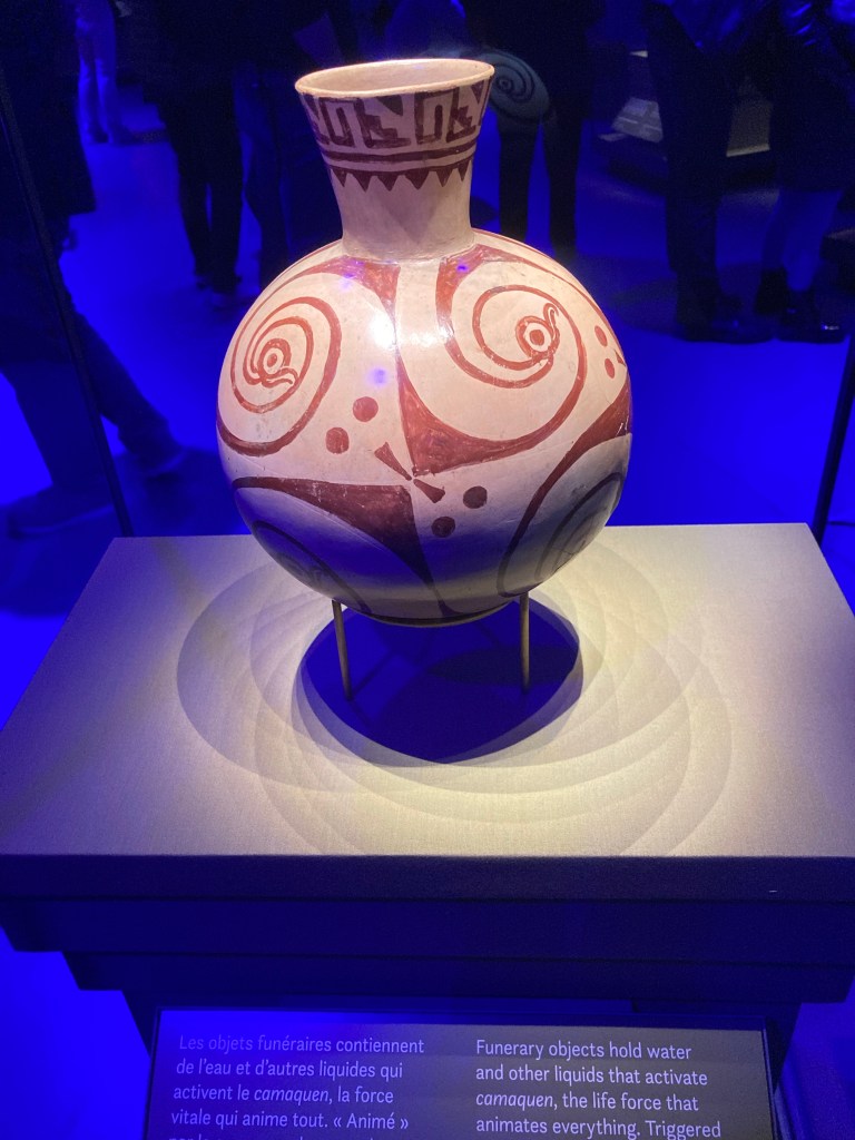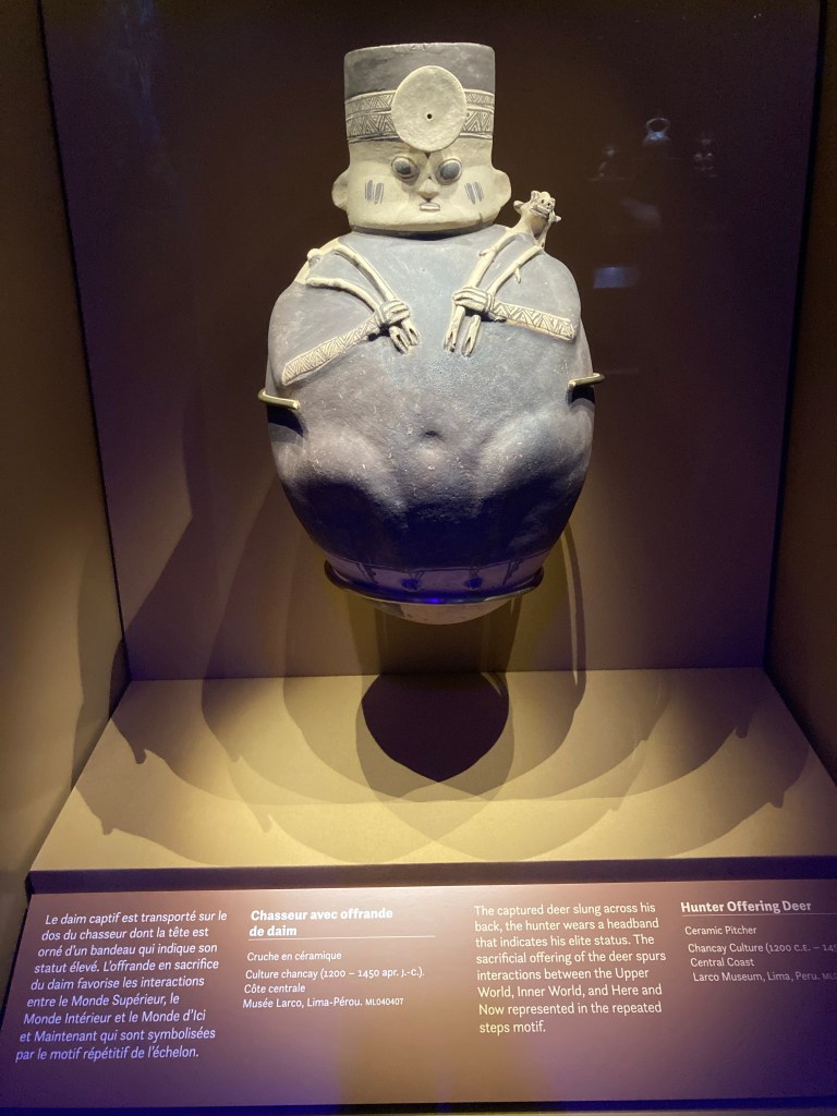L’exposition nous présente aussi le thème du sacrifice humain pratiqué sur les guerriers, otages de guerres. La symbolique des sacrifices correspond à l’importance du sang sacré qui apaise la colère des dieux. Donner sa vie permet de rééquilibrer les forces du monde. Et ces rites sont régulièrement pratiqués dans la culture andine.