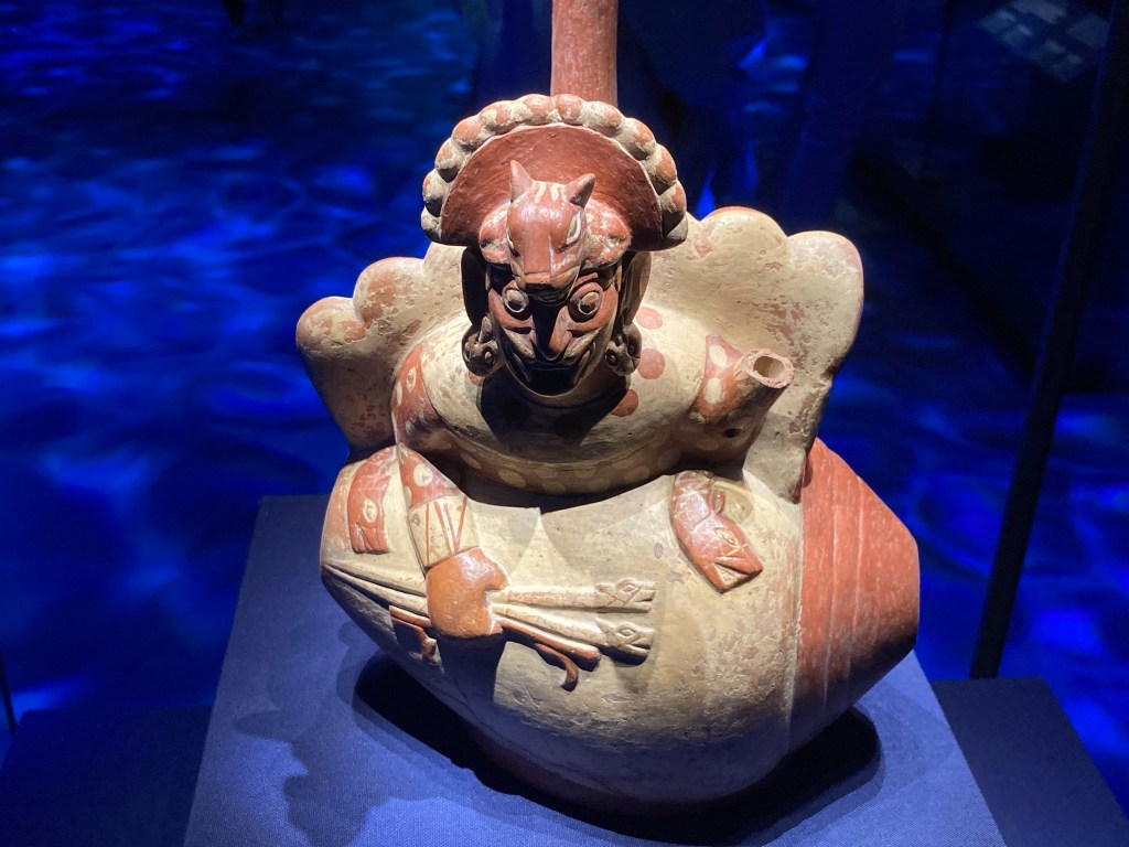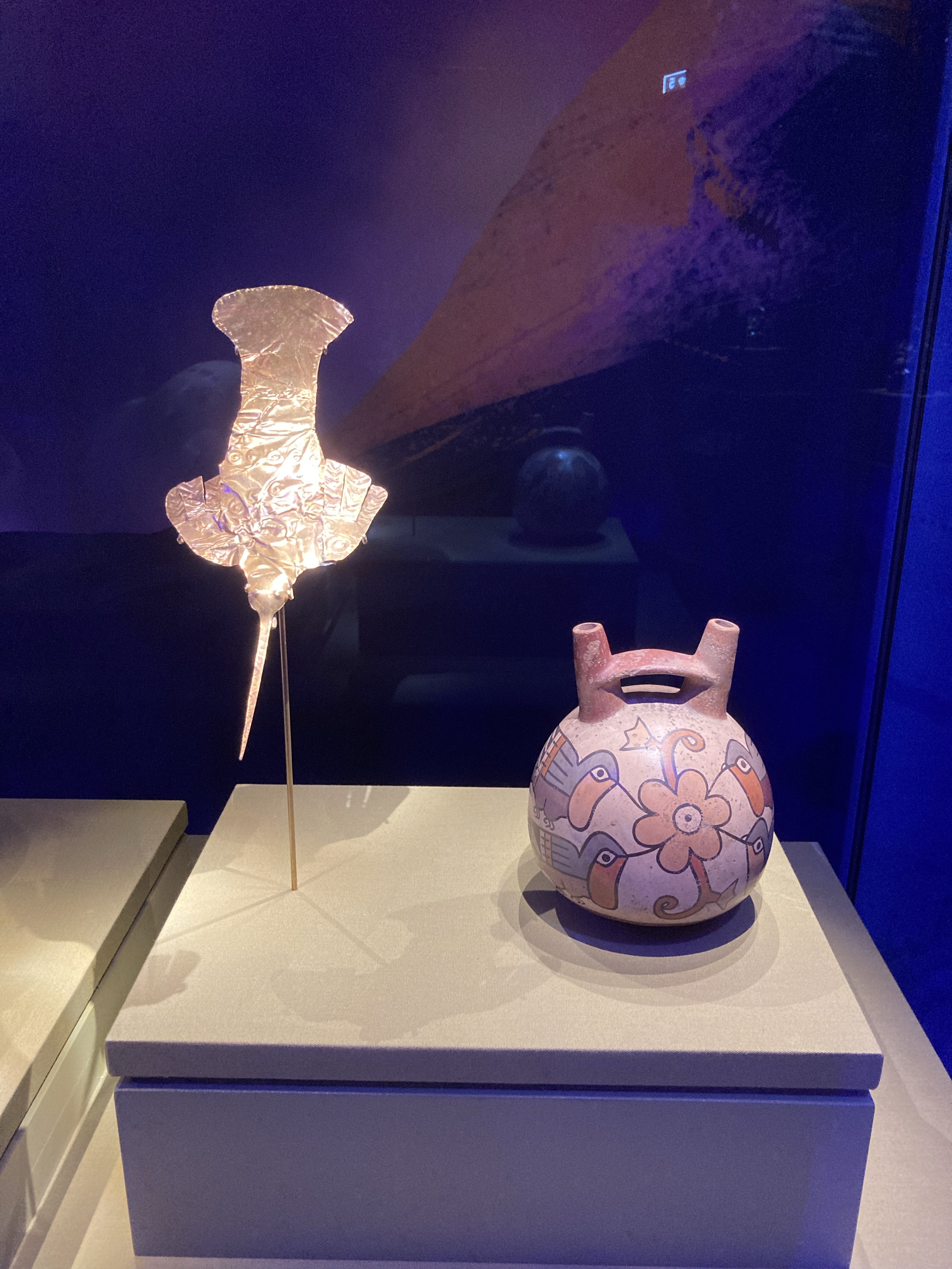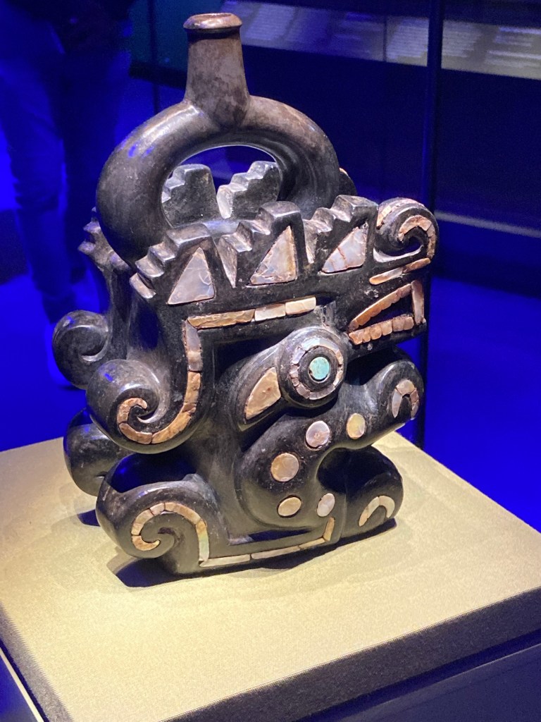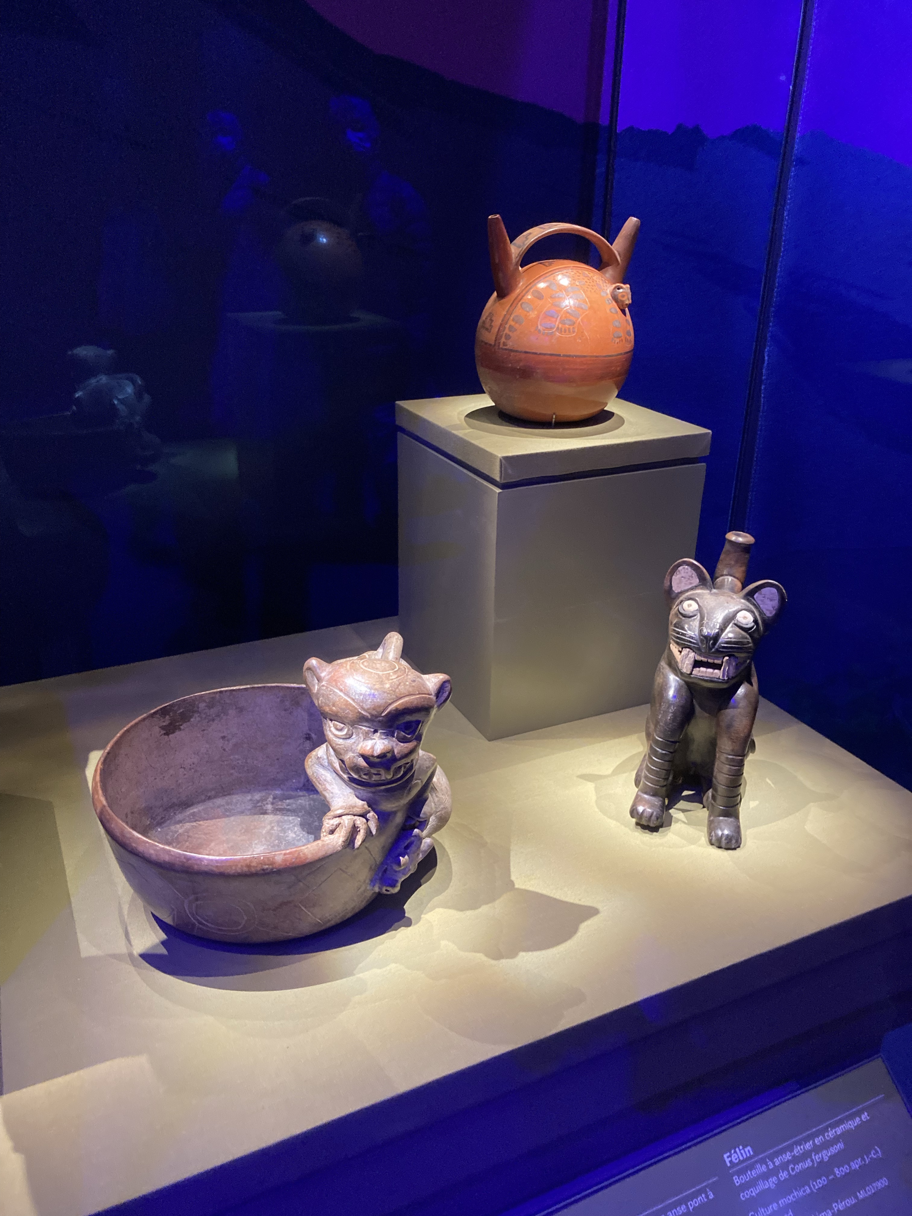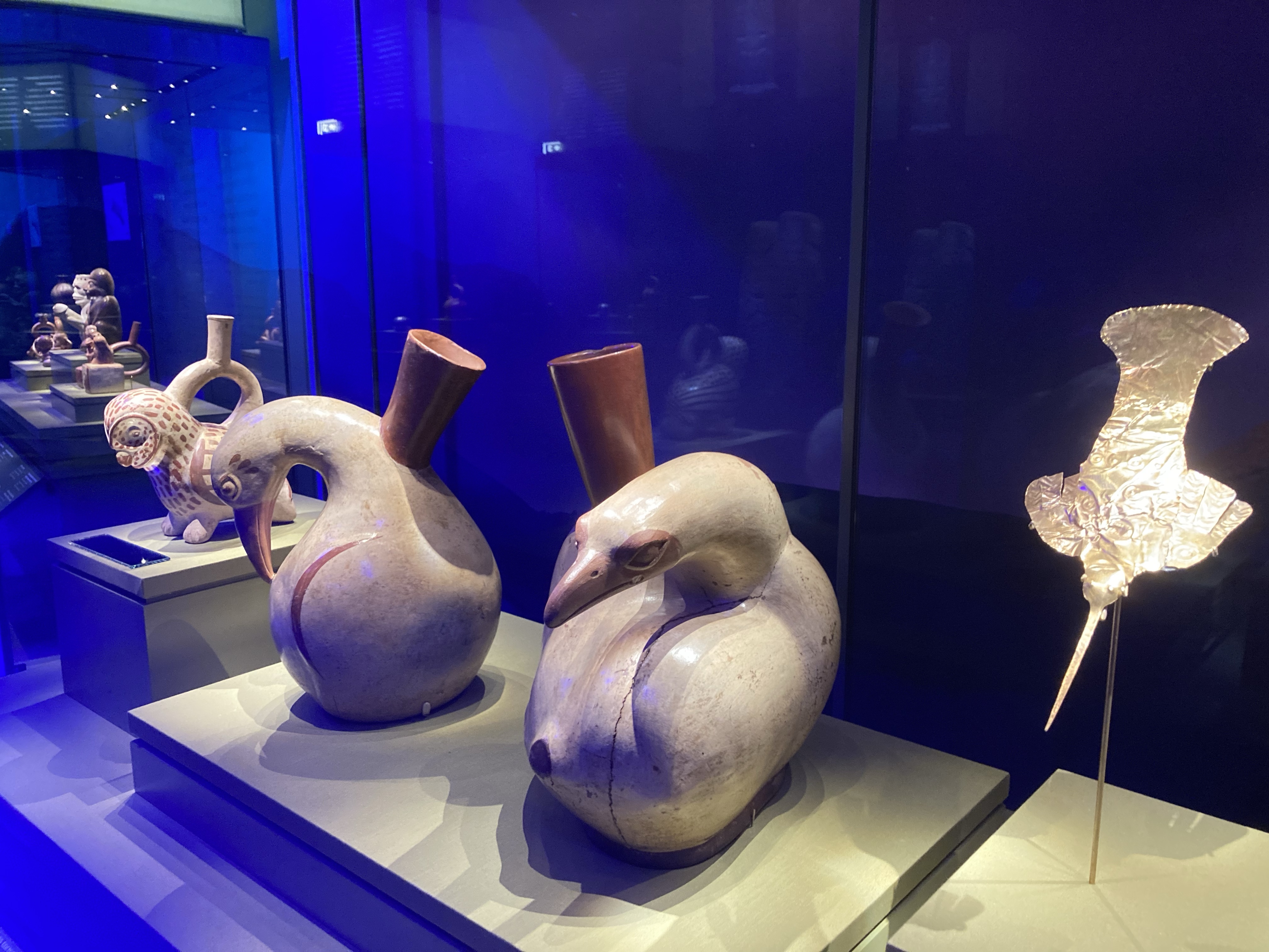 Certains objets se rapportent à des oiseaux comme le colibri représenté en or ou bien sur un pot avec les fleurs qu’il vient sucer. Ou bien ces autres oiseaux comme des cormorans yacon. Ou bien ces récipients de chicha (boisson à base de maïs) en forme de jaguar ou de puma, symbole d’agilité. Ou bien celui représentant des serpents (monde d’en bas).