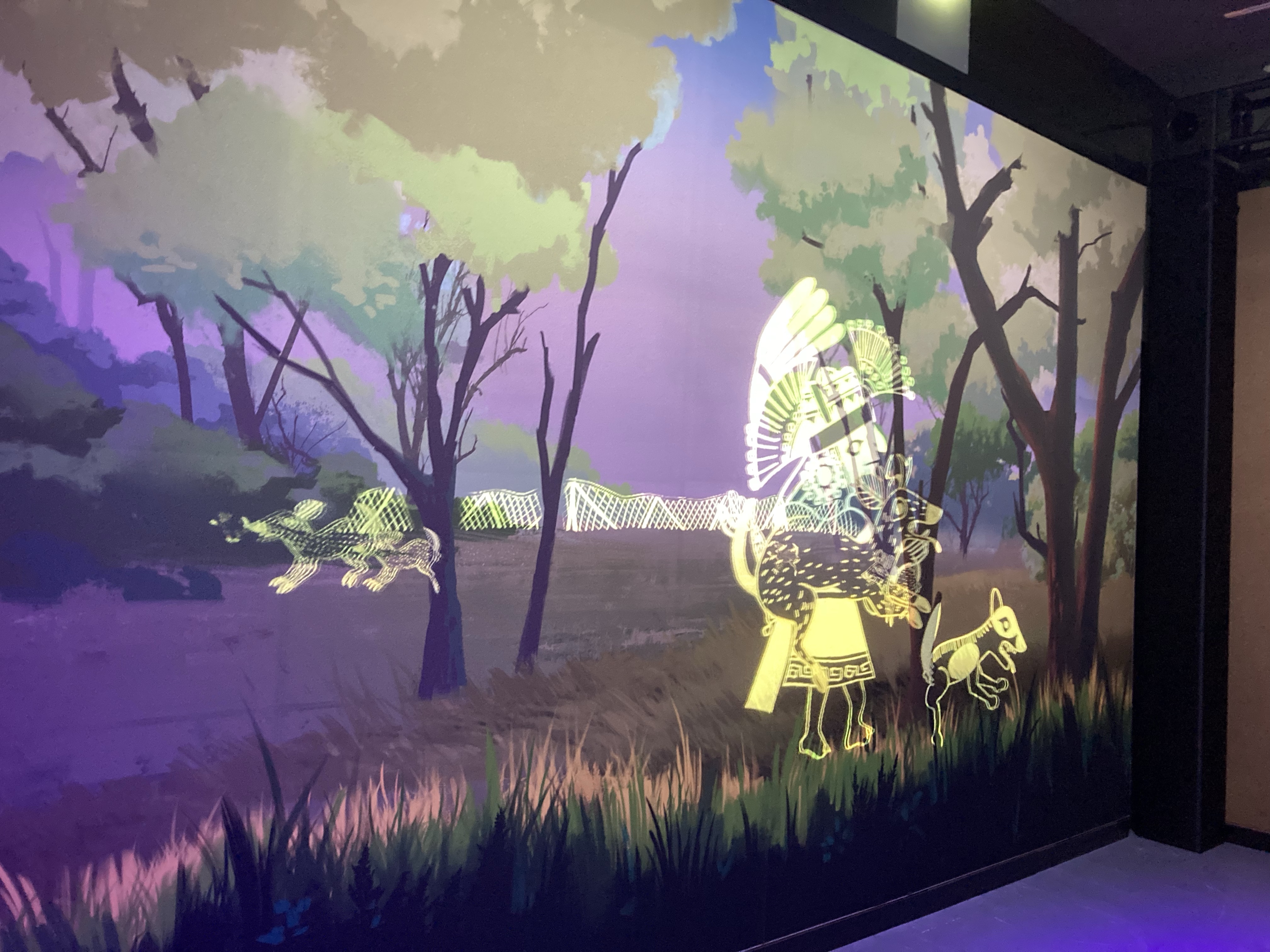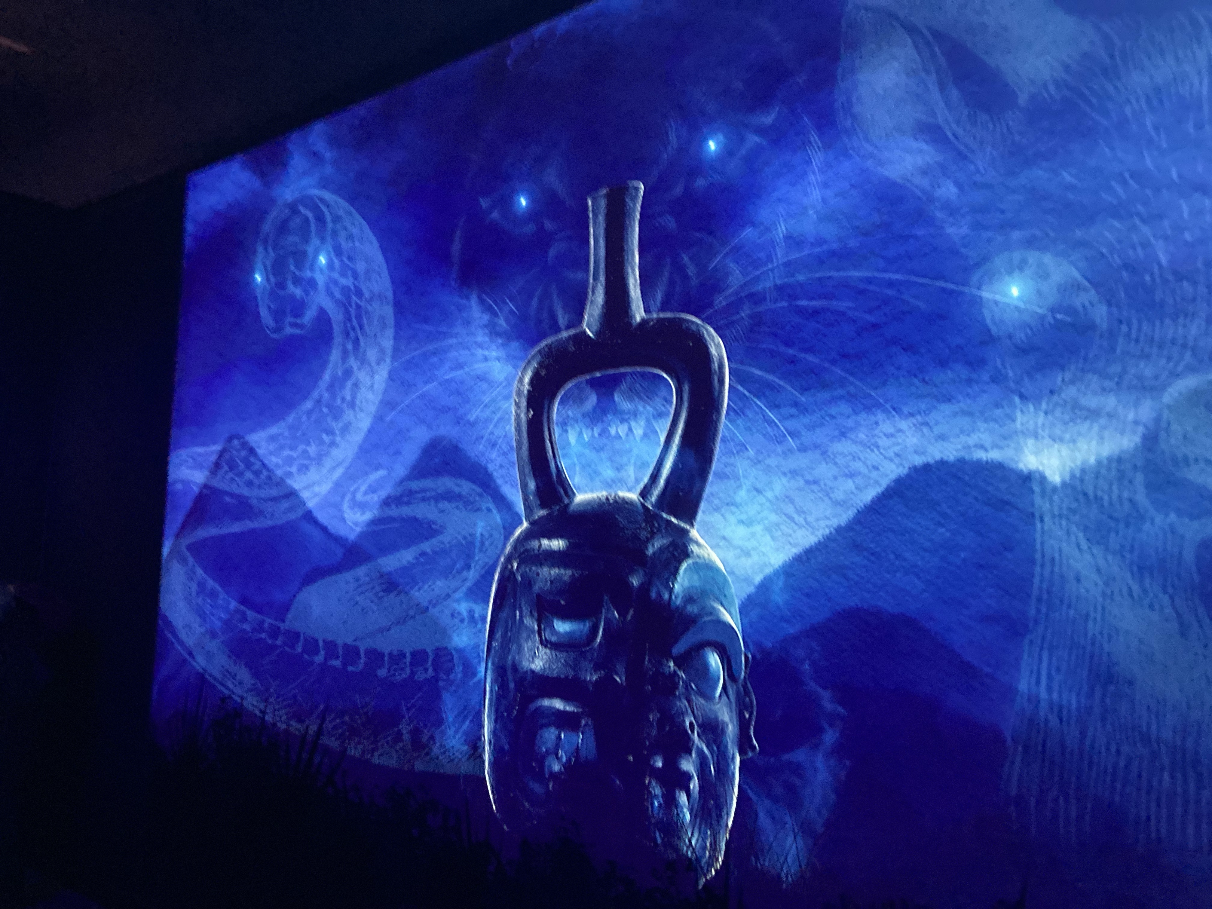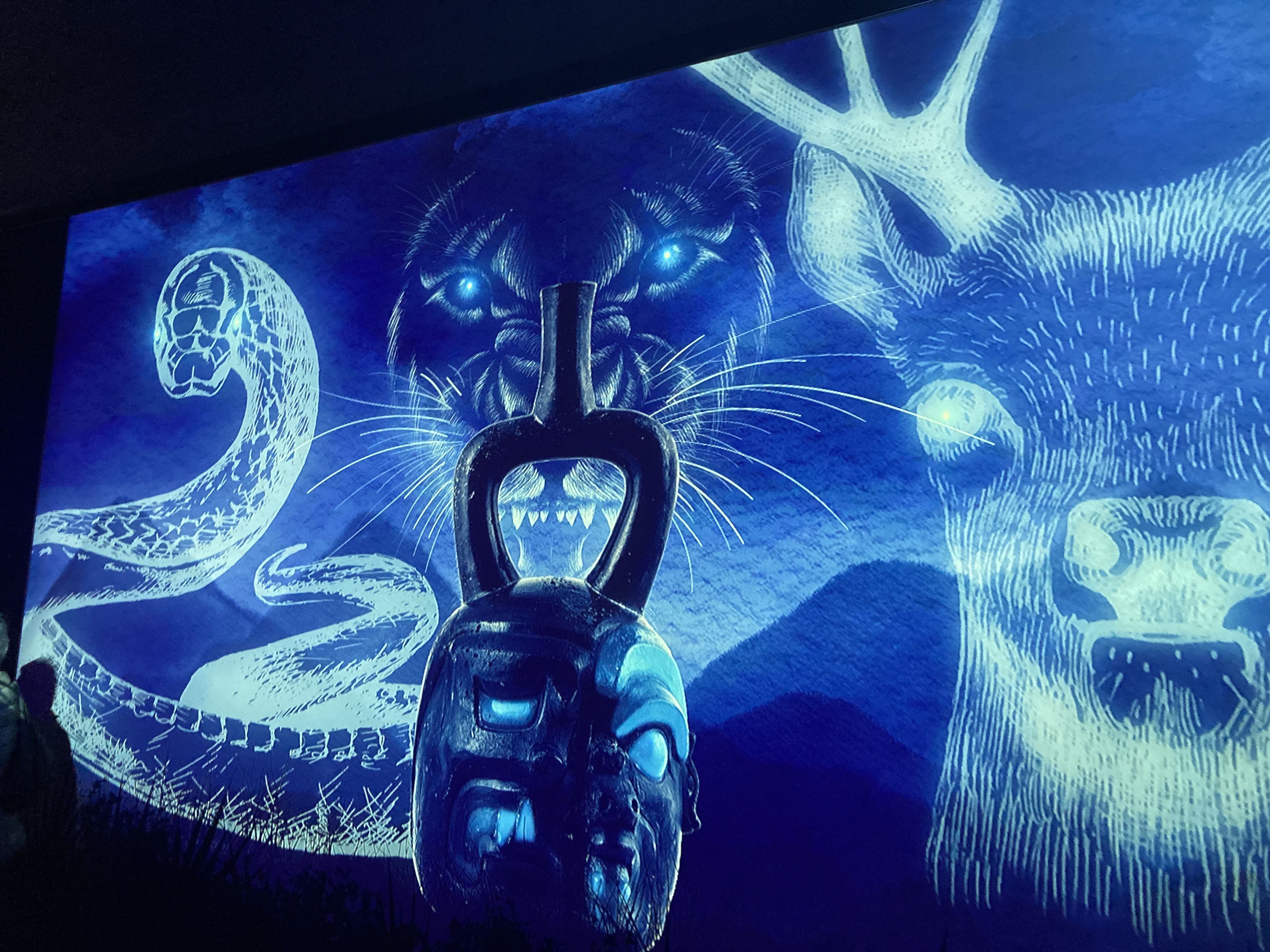 On entre dans des salles qui vont se suivre, les unes, derrières les autres, avec des thématiques. Des portes arrondies vous font pénétrer un monde inconnu et les couleurs changent d’une salle à l’autre en passant du bleu à l’ocre rouge. Parfois des animations présentent des objets rituels et des animaux défilent devant vous en superposition. On peut voir aussi les Dieux partir à la chasse. C’est incroyable de modernité et de beauté.