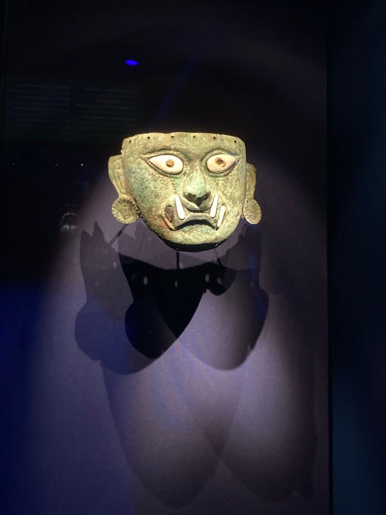 Ce masque funéraire magnifique du visage d’Ai Apaac (super-héros mochica) en cuivre qui fait penser à de la pierre obsidienne, avec les coquillages blancs de Strombus de la culture mochica est juste une merveille. On dirait qu’il lit en vous avec son regard puissant.