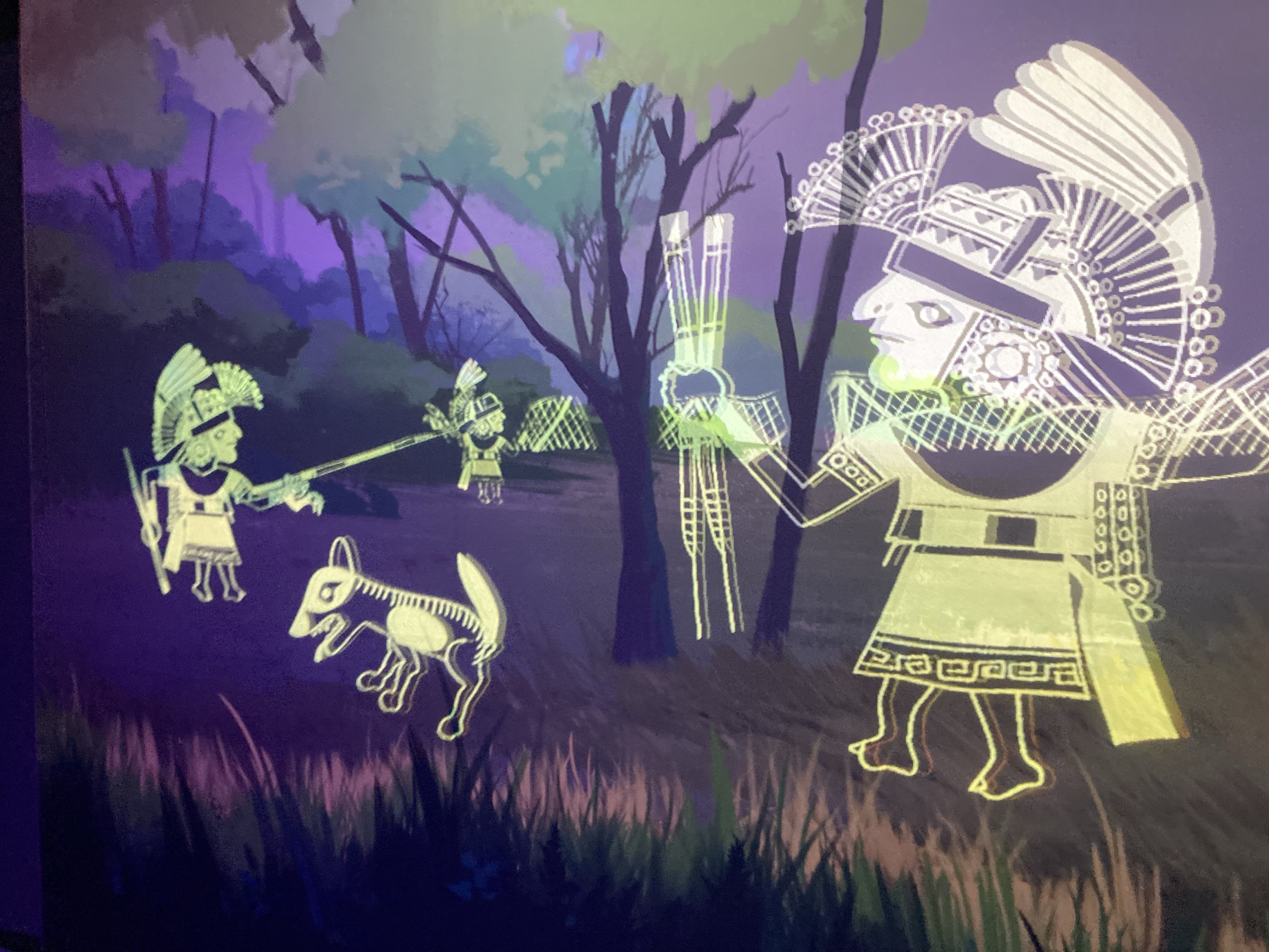 Toute une salle est consacrée à la chasse avec les représentations des animaux et l’effigie au daim captif, le chasseur le portant sur son dos. Il est de rang élevé car il a bandeau orné sur son front. Le sacrifice du daim favorise les relations entre le monde supérieur, le monde intérieur et le monde d’ici.