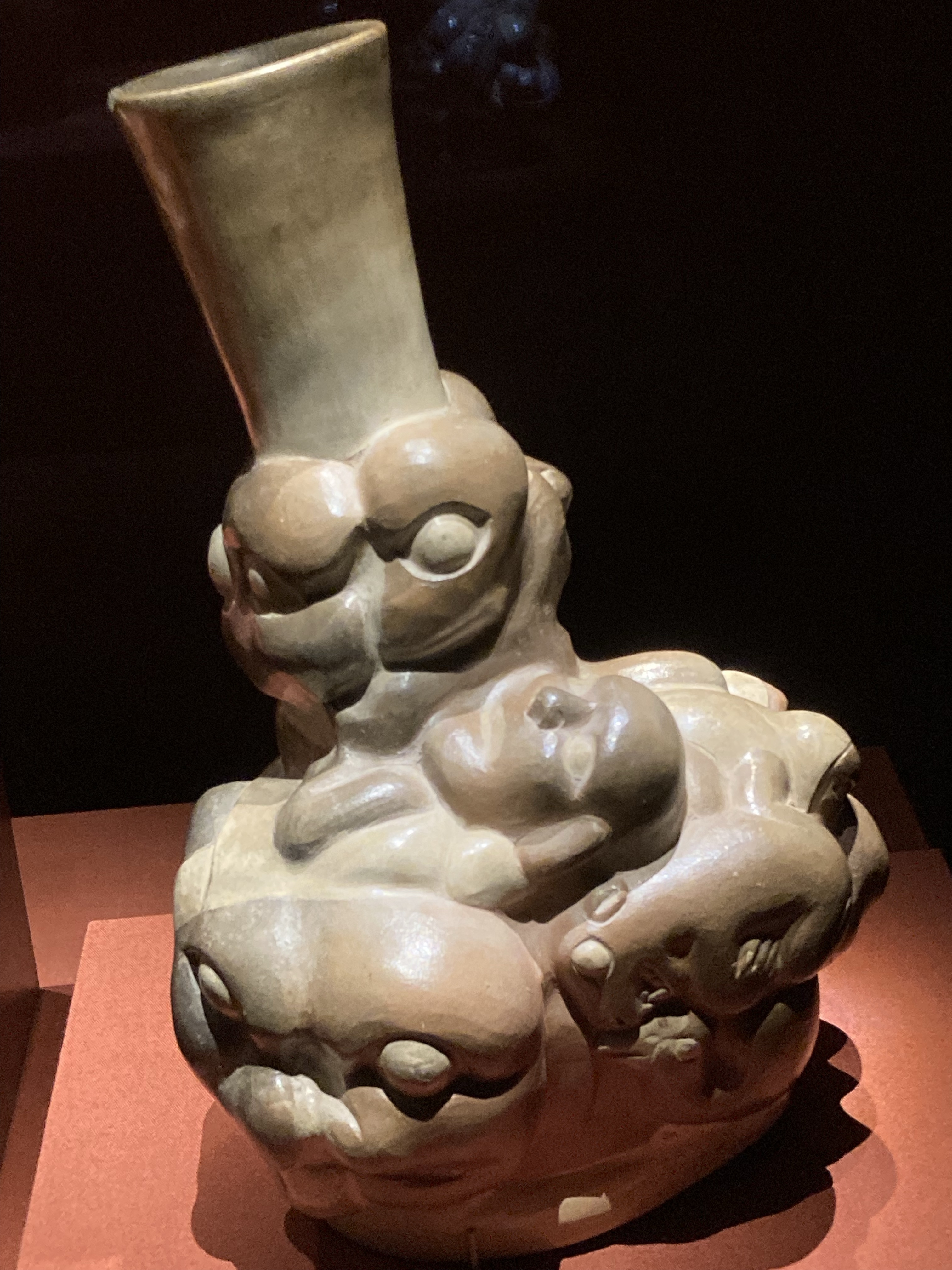 Ce monde andin se caractérise par des civilisations qui nous sont peu connues come celles des Chavin, Nazca, Mochica, Huari, Chimu, Vicus, Salinar, Chachapoyas…. On pourrait se dire que cette grande variété de peuples entraine peu de cohérence dans ce monde inca. Or il n’en est rien, au contraire le monde symbolique, mythologique est le même. La représentation du monde symbolique de l’univers sous le nom de « cosmovision » servait aux cérémonies et à la communication avec les différents monde constituant l’univers. Il se définit en trois espaces : le monde Hanan Pacha, c’est-à-dire le monde d’en haut, espace céleste et divin d’où se répandent la lumière et la chaleur du soleil. Le monde d’en bas, l’Uku Pacha représentant monde souterrain, sous-marin, sombre et humide sorte de monde utérin, là où les graines semées poussent. Il est souvent associé à la lune et à la nuit. Et enfon le Kay Pacha qui est la surface de la Terre, zone contact entre les deux autres mondes où l’homme vit. Et l’on retrouvera tout au long de l’exposition des objets dédiés à ces mondes.
