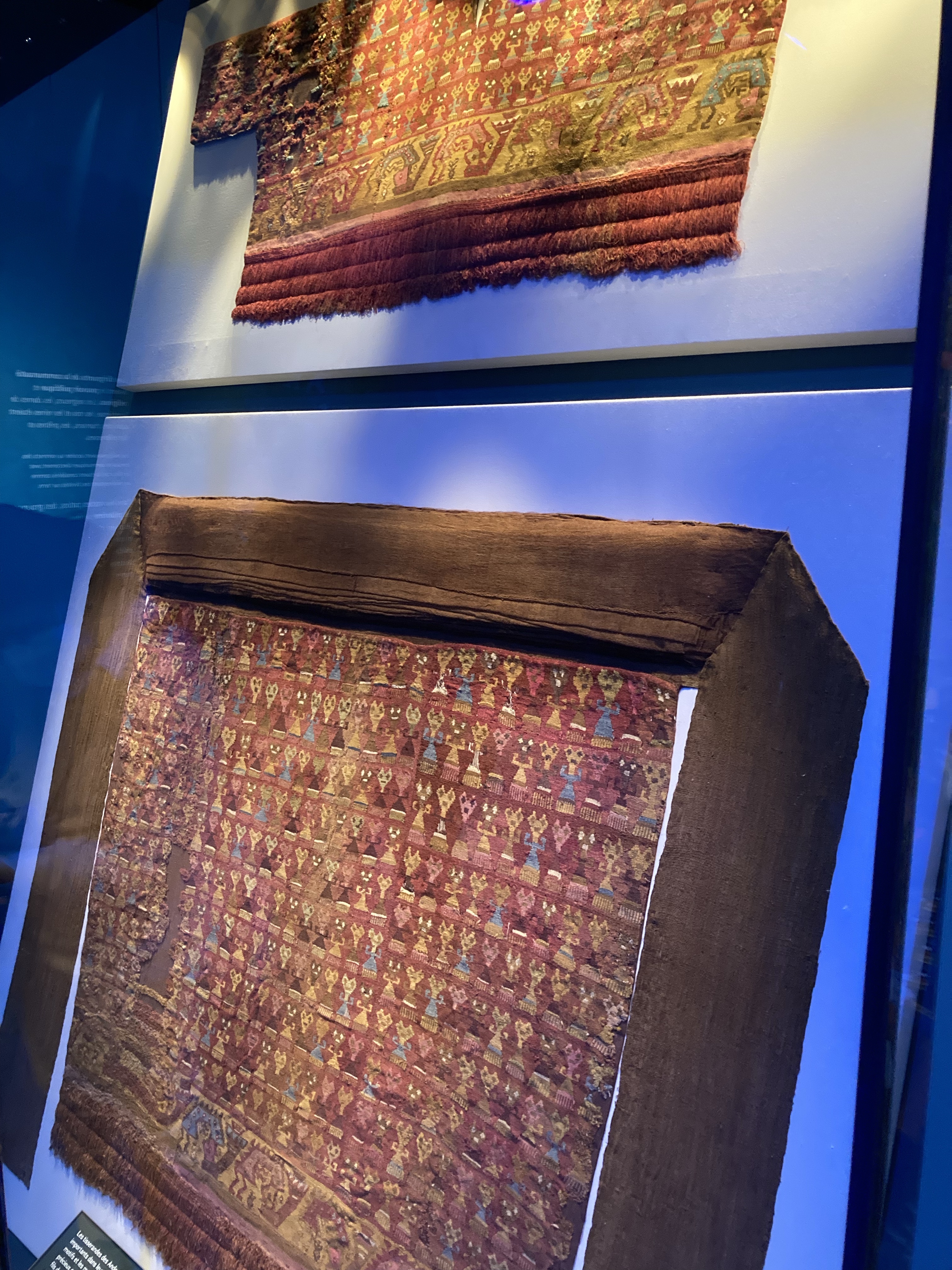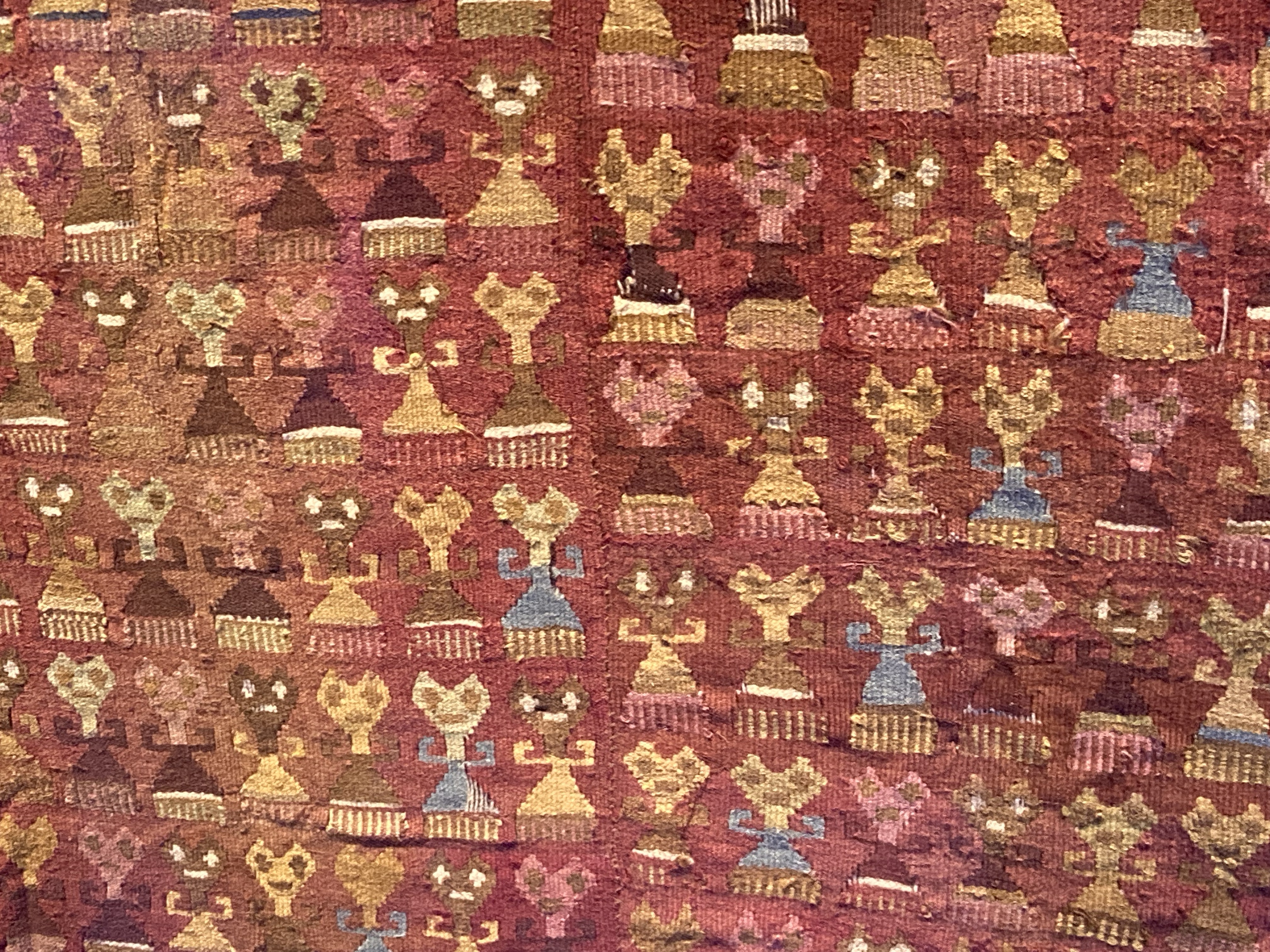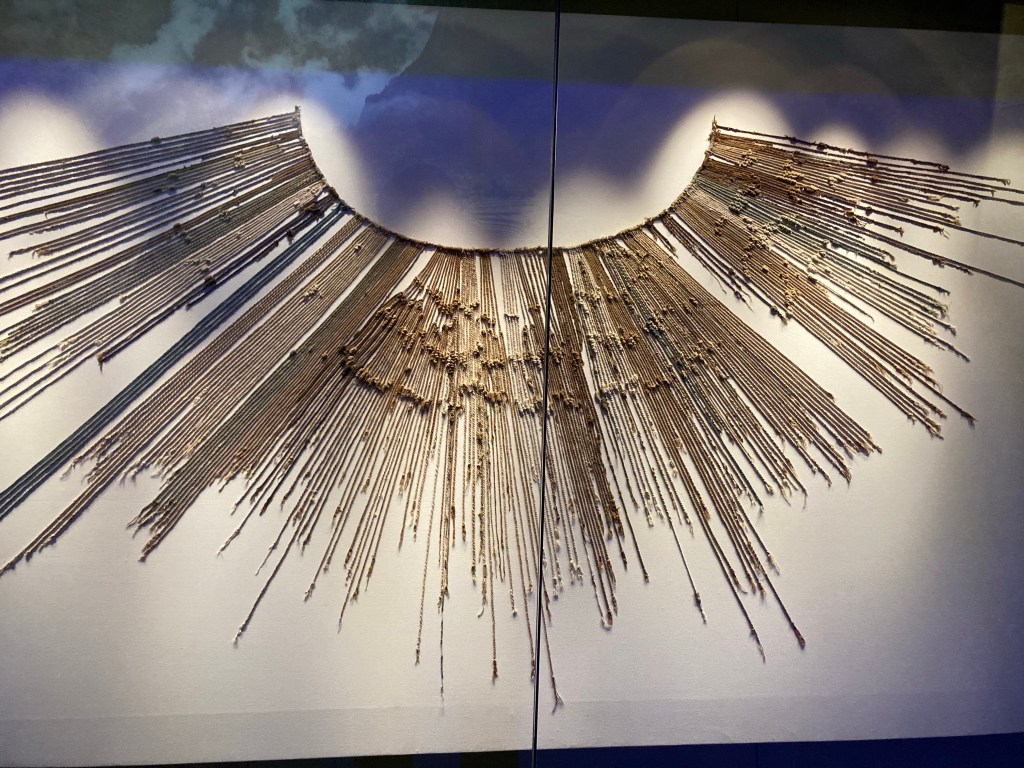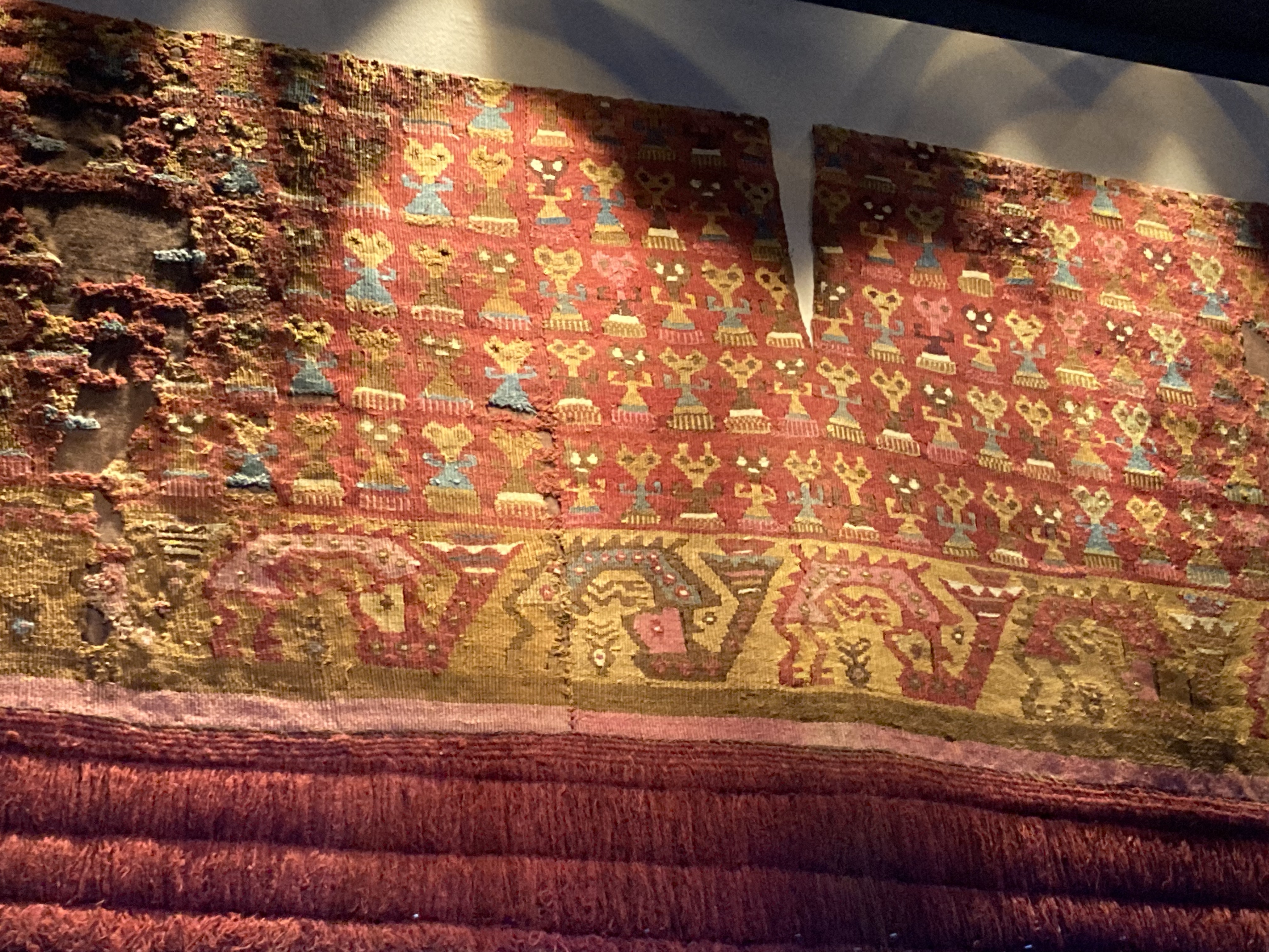 Puis on découvre les habits des soldats et ceux magnifiques des seigneurs. Des tapisseries aux couleurs ocre rouge décrivent les mythes des Andes et faisaient partie des rites funéraires des ancêtres. Pour aller dans l’au-delà il fallait être paré. Ces dernières sont réalisées en laine d’alpaga et de vigognes. Les pigments proviennent de plantes et d’insectes. Les dessins géométriques sont d’une finesse époustouflante.