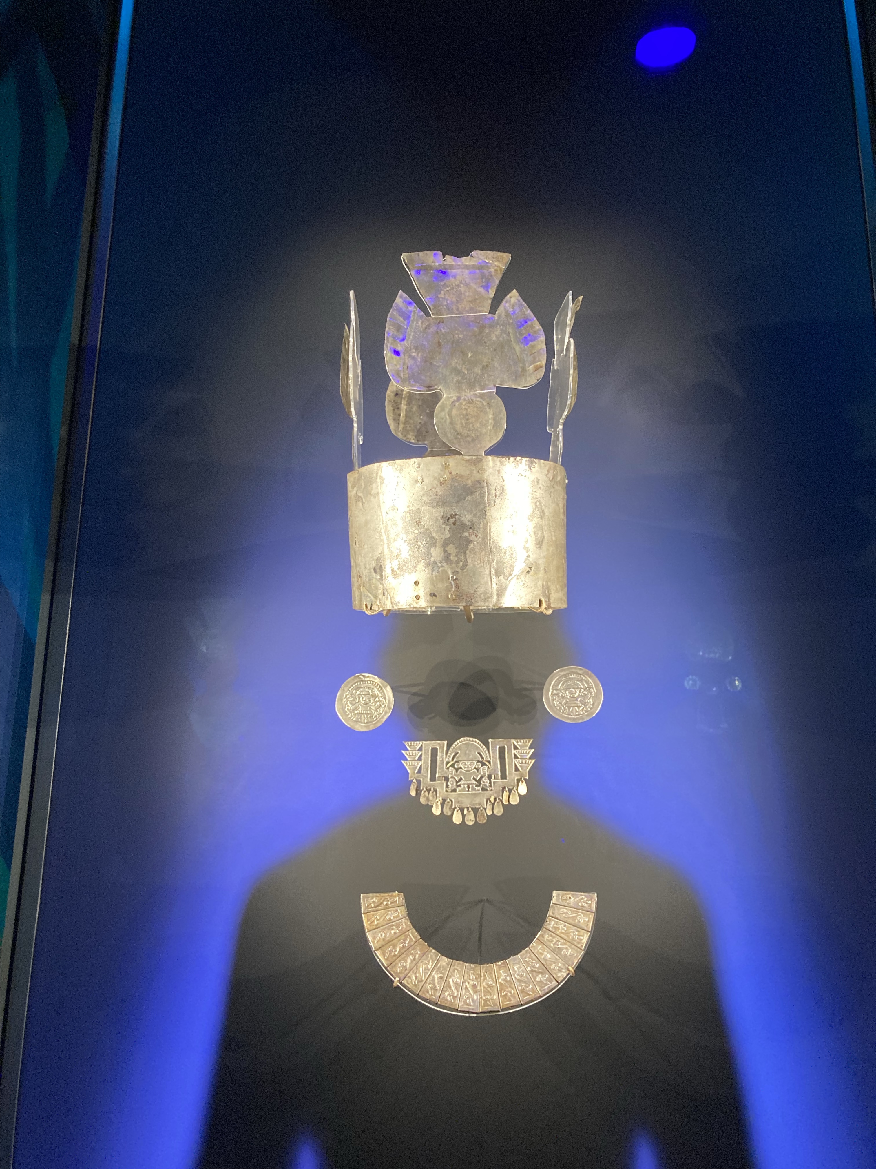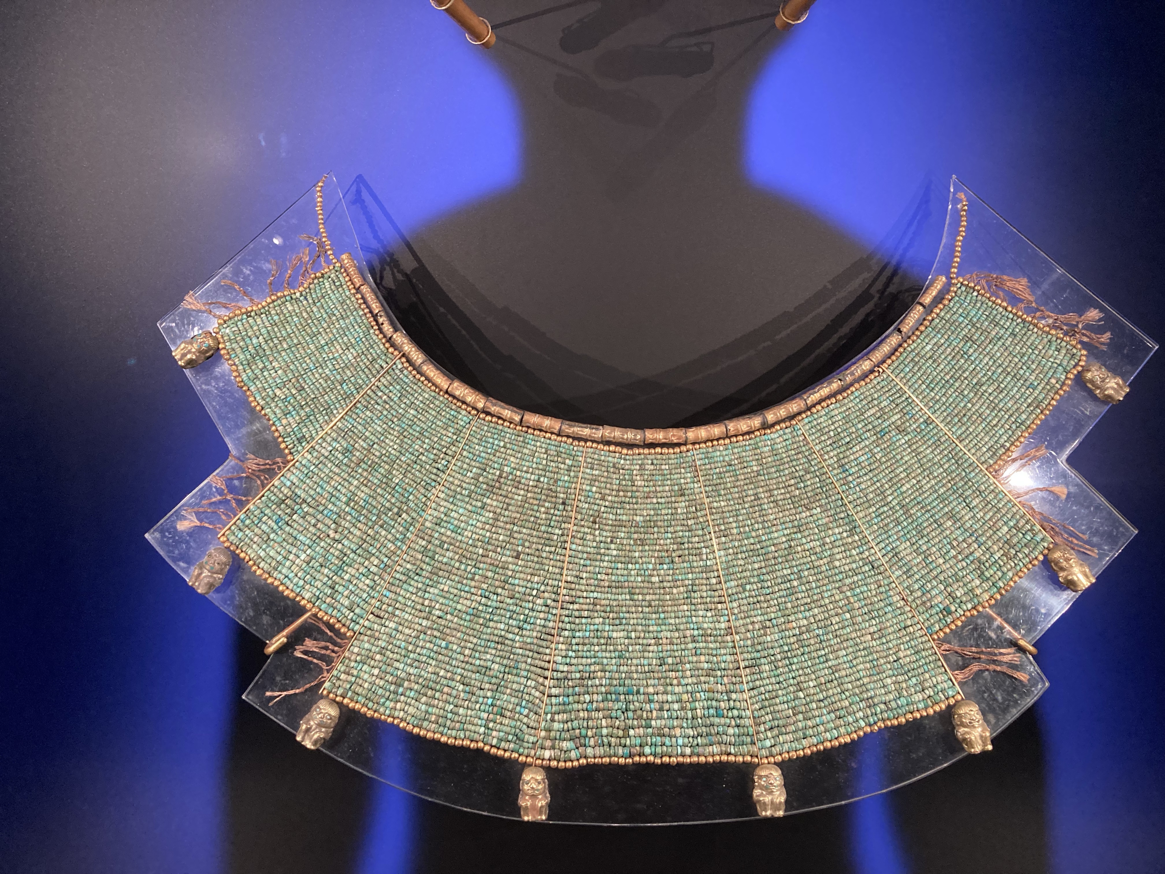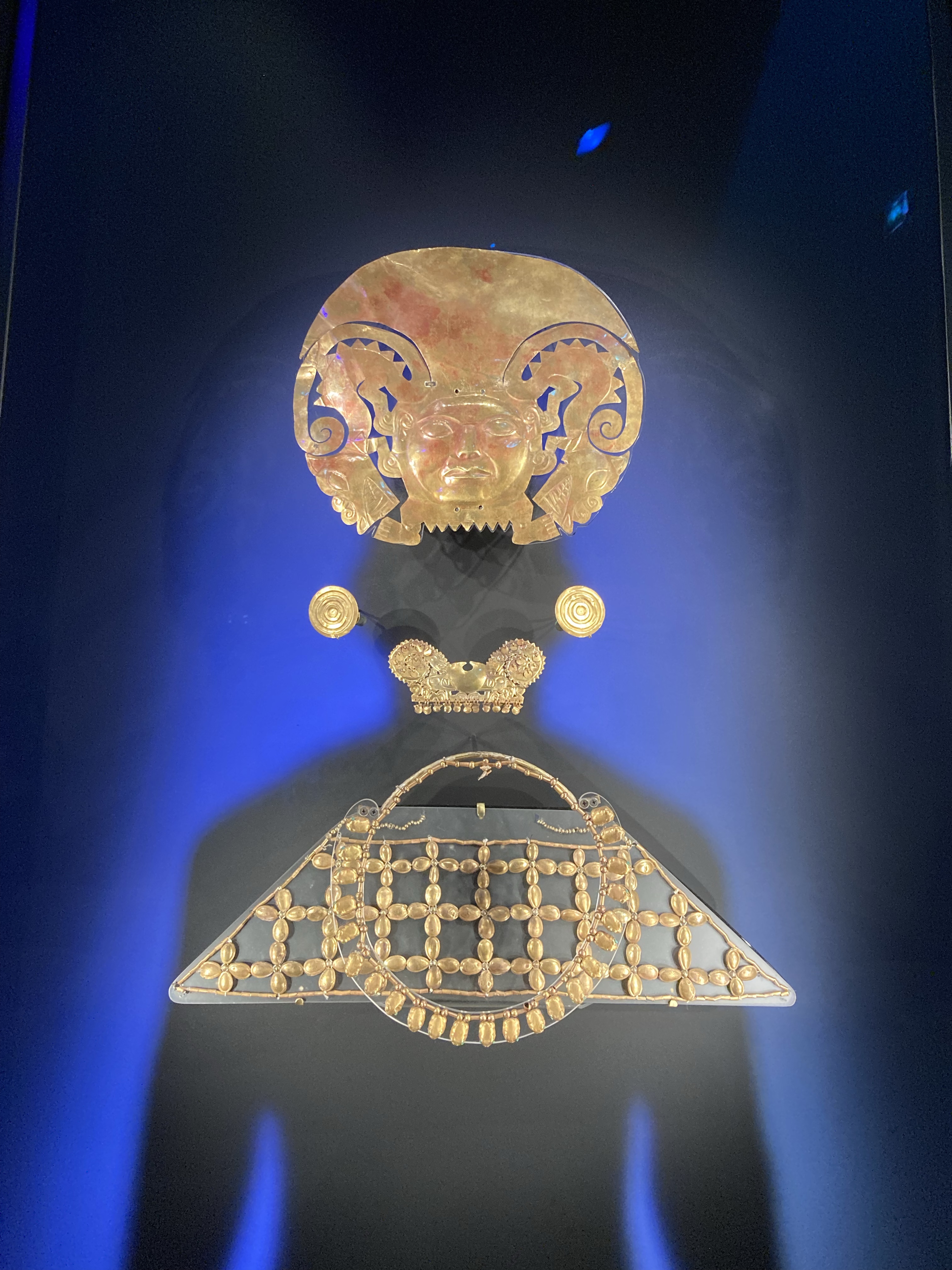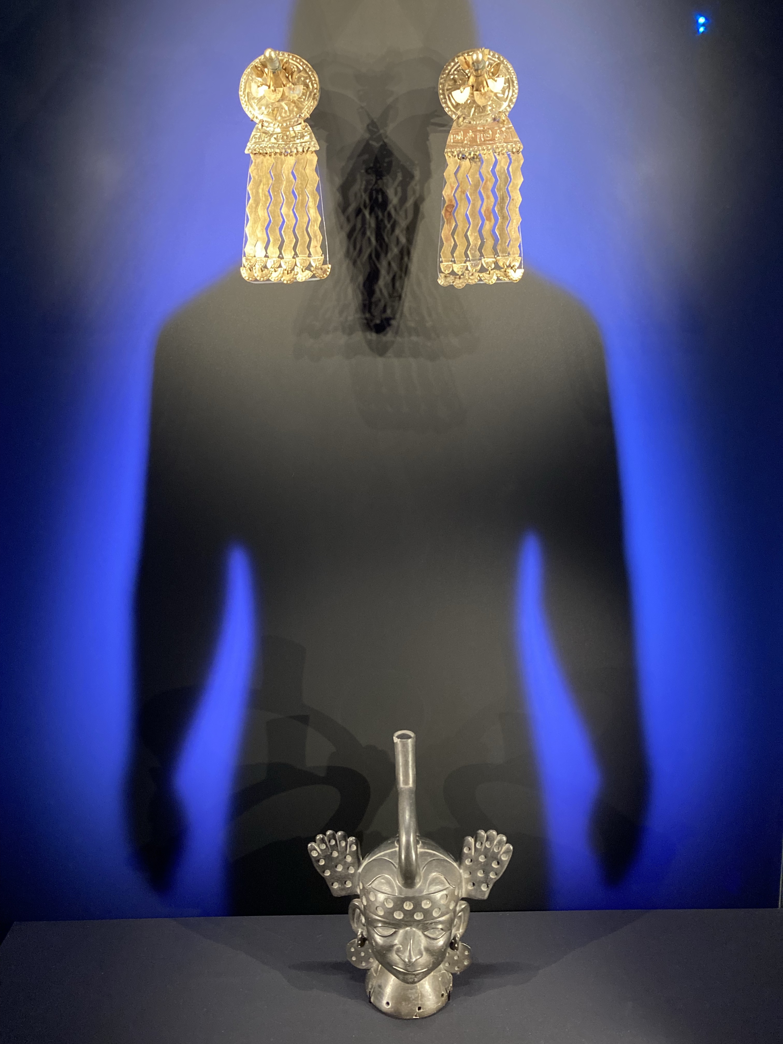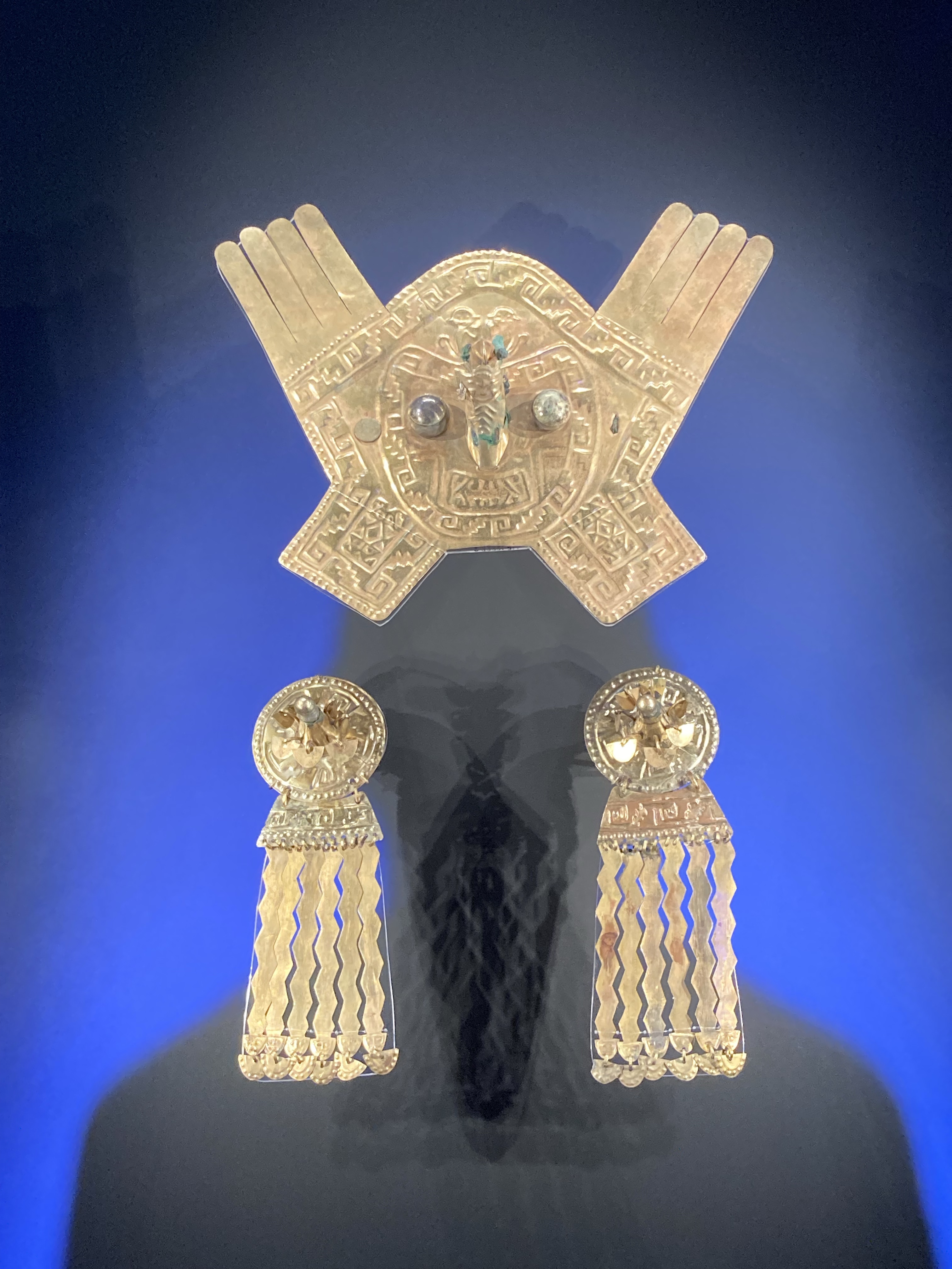 Et la salle incroyable c’est celle des parures en or qui permettent de déterminer le statut, le rang social et l’identité des ancêtres. Les chamans chavins, les chefs vicus, et toute la noblesse chimu. La finesse du travail de l’or martelé à l’envers, les représentations des poissons et du chef, la couronne de pélicans ou bien le collier de grenouilles et les pectoraux en forme de fleurs, ainsi que le collier en perles de turquoises et le trousseau funéraire impérial chimu composé d’une couronne à plumes, d’un collier, d’un pectoral, d’épaulettes et de boucles d’oreilles le tout dédié au Dieu du soleil. Je dirais que cette œuvre est le clou de l’exposition.