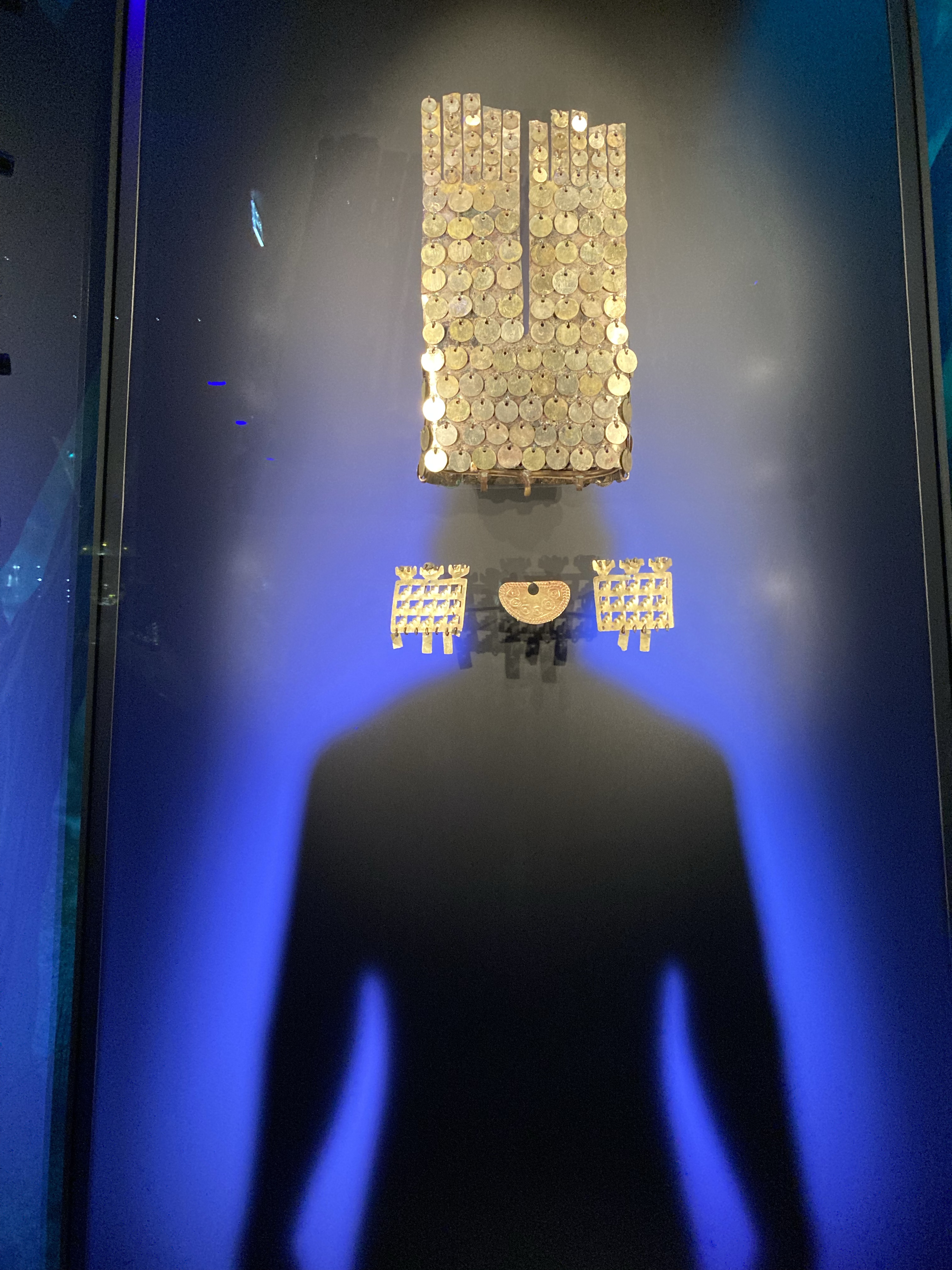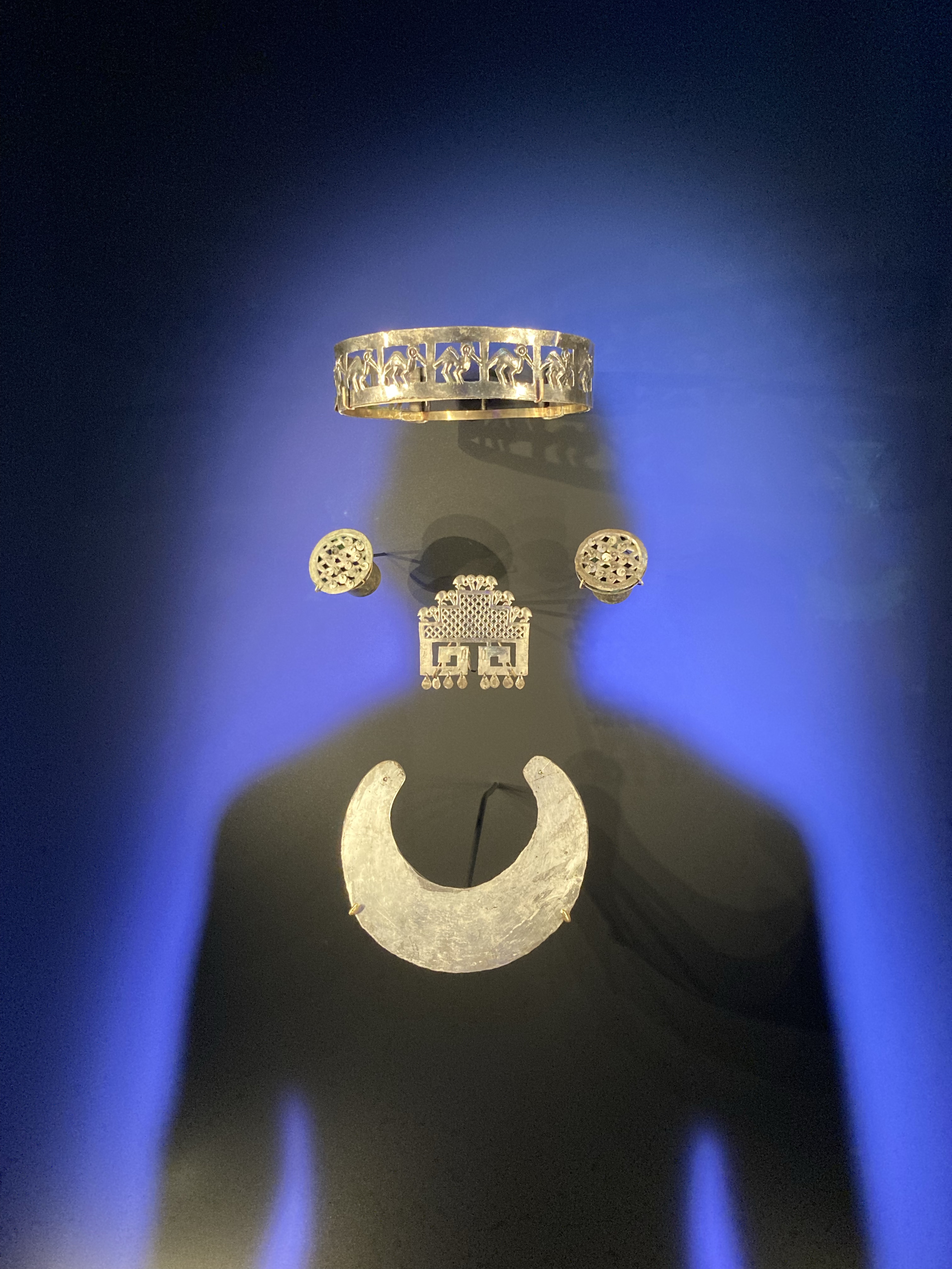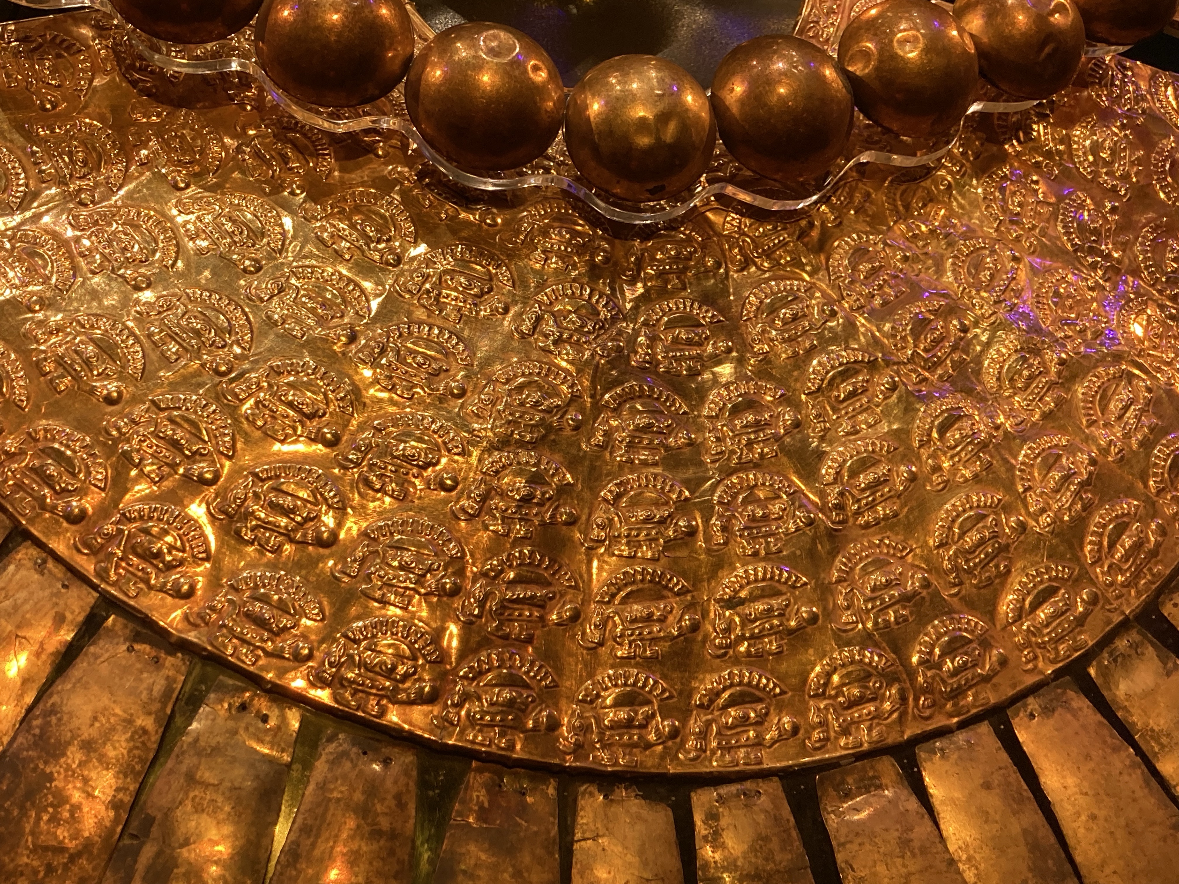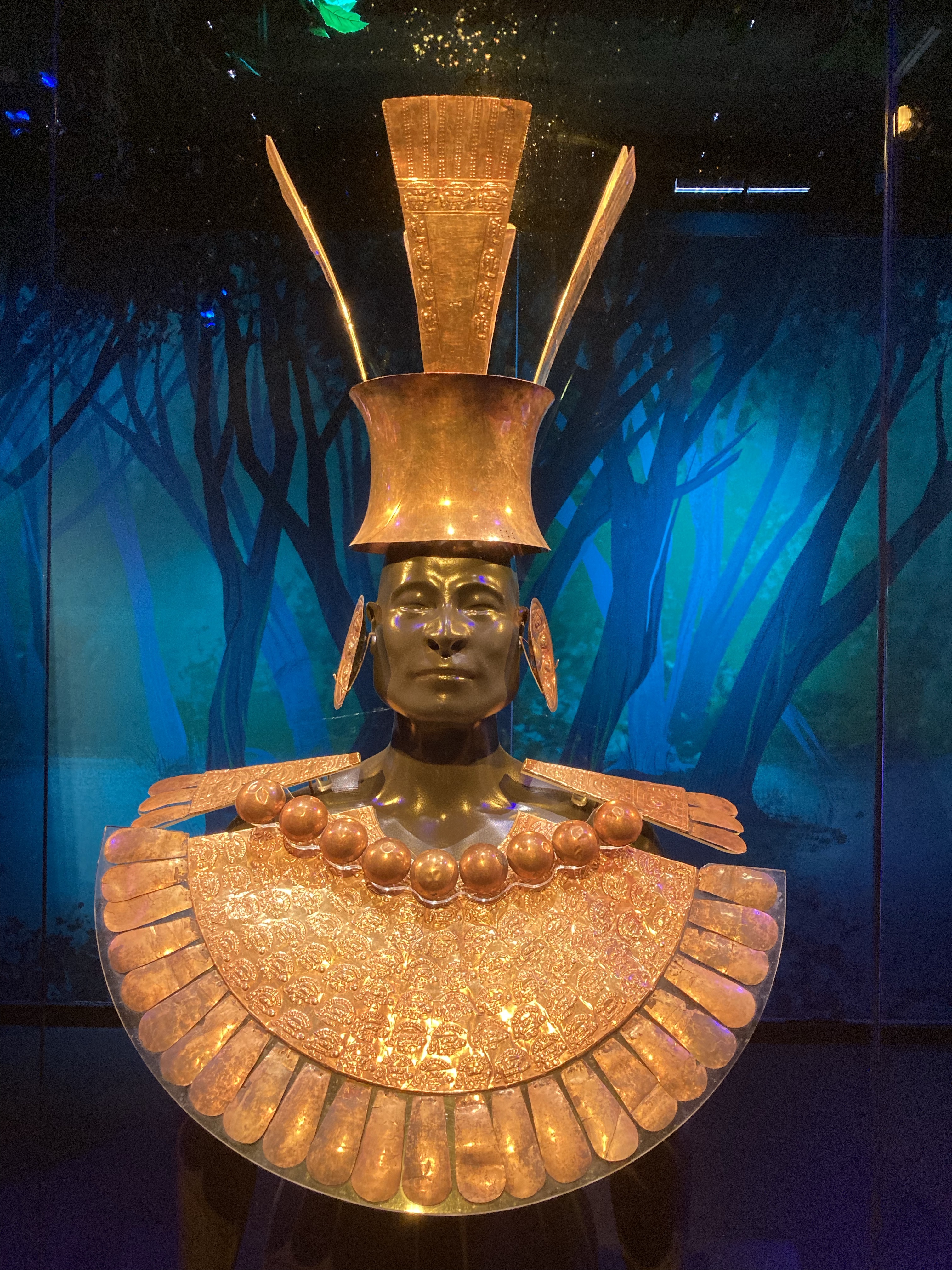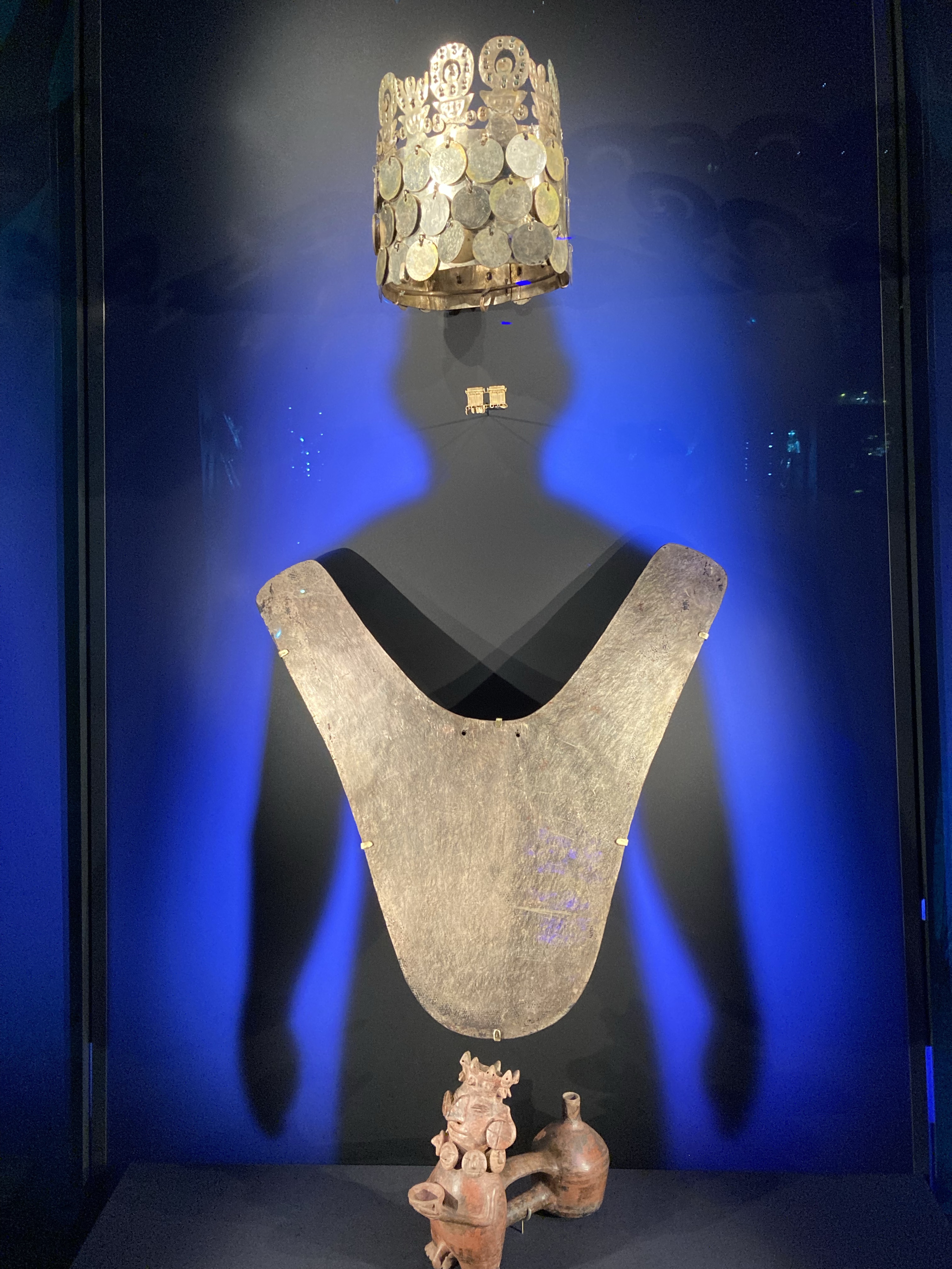 Et la salle incroyable c’est celle des parures en or qui permettent de déterminer le statut, le rang social et l’identité des ancêtres. Les chamans chavins, les chefs vicus, et toute la noblesse chimu. La finesse du travail de l’or martelé à l’envers, les représentations des poissons et du chef, la couronne de pélicans ou bien le collier de grenouilles et les pectoraux en forme de fleurs, ainsi que le collier en perles de turquoises et le trousseau funéraire impérial chimu composé d’une couronne à plumes, d’un collier, d’un pectoral, d’épaulettes et de boucles d’oreilles le tout dédié au Dieu du soleil. Je dirais que cette œuvre est le clou de l’exposition.