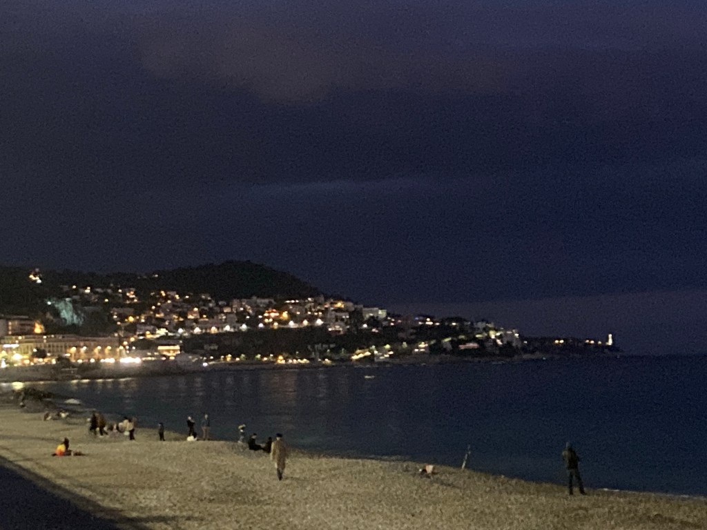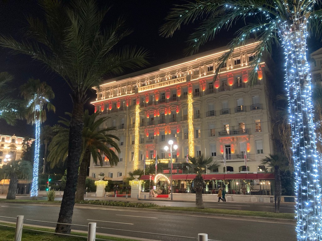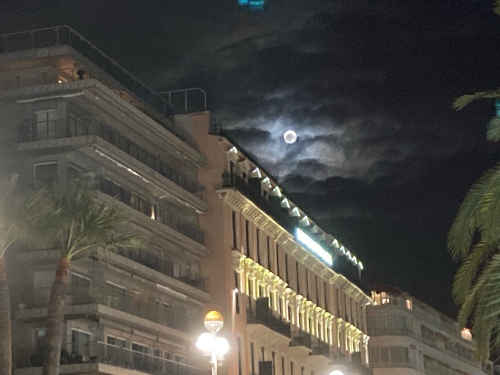 D’un côté le soleil rouge orange s’étirant tout le long de la baie, pris en étau ente la mer devenue grise et plate, et le ciel bleu foncé plein de trainées blanches comme des marques des avions décollant de l’aéroport et le scintillement des lumières. Et surtout la beauté des bâtiments et les frontons des années 1930 style art nouveau avec ces colonnes, ces chevaux ailés et ces hommes et femmes stylisés. L’hôtel le Royal était enluminé de bleu. Le West-End de rouge. Et le Negresco tout de blanc avec ses coupoles de chaque côté.