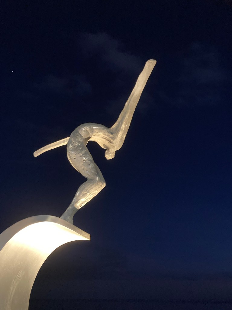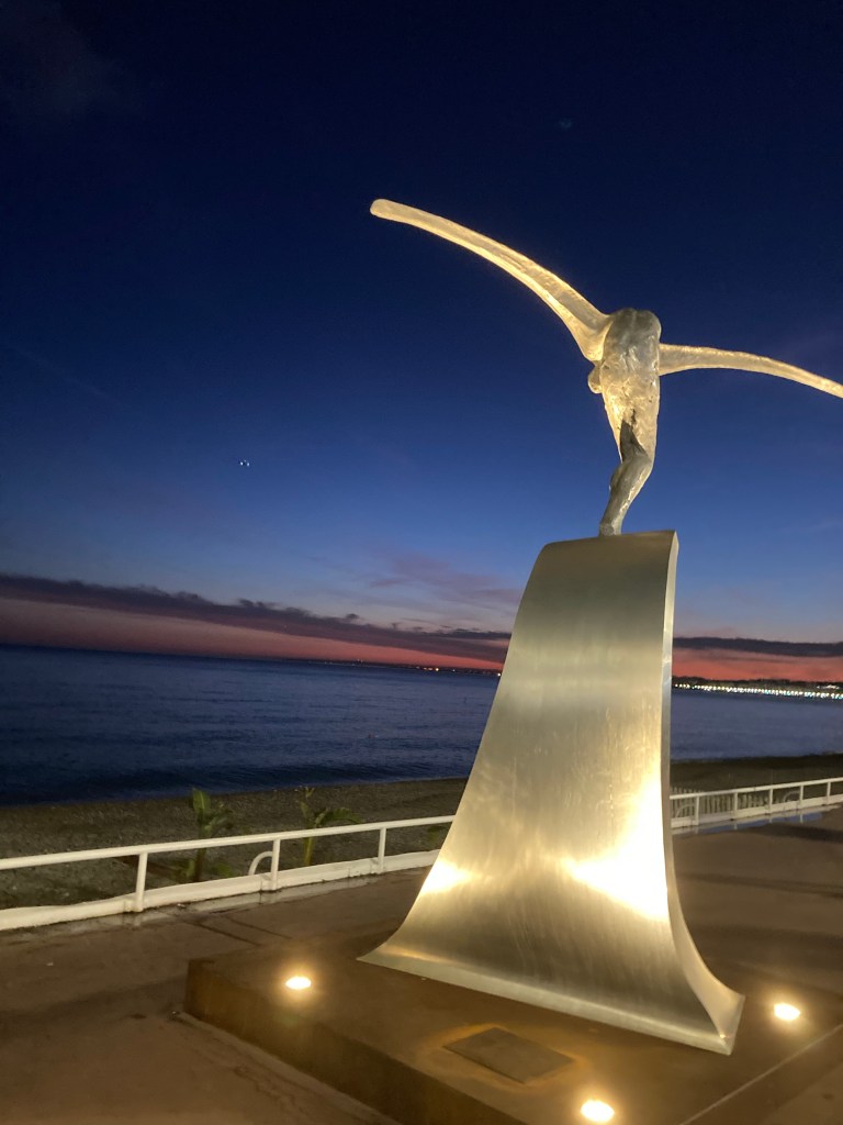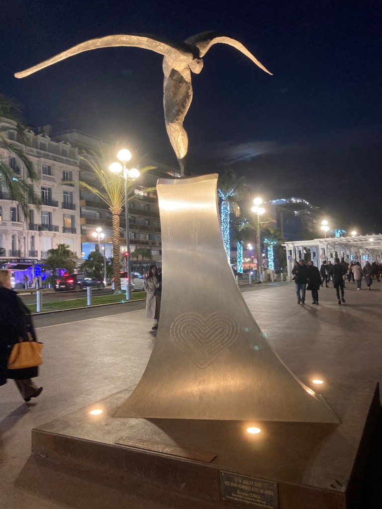 Près de la plage il y avait un très beau mémorial aux morts de Nice tués par un fou le jour du 14 juillet 2016. Un homme ou une femme s’apprêtant à plonger dans l’eau ou la vie avec à sa base un cœur en sorte de filigramme.