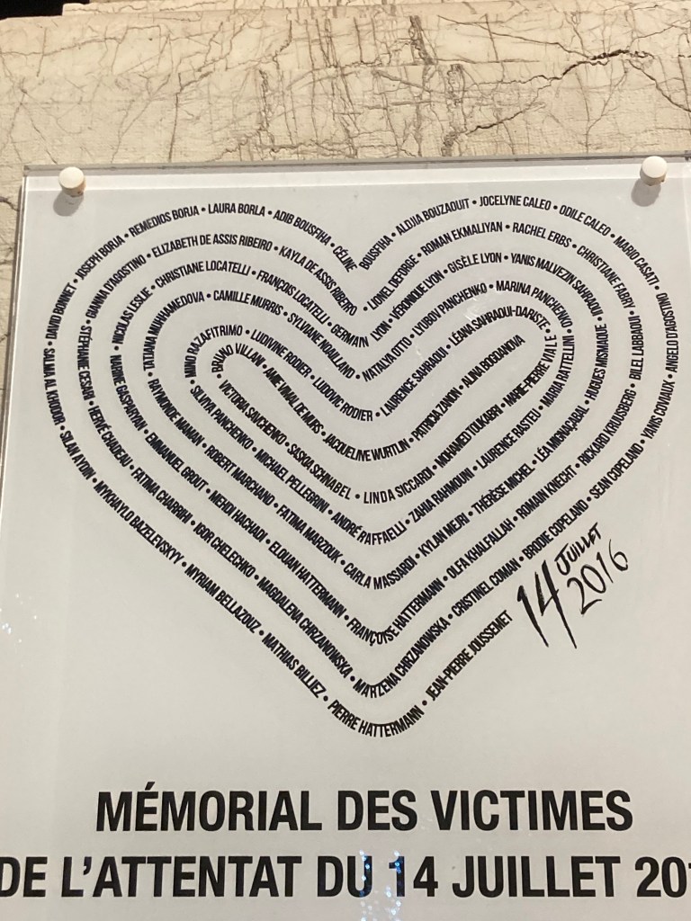 Non loin du Negresco se tient le musée Massena et devant les grilles il y a ce mémorial de l’attentat du 14 juillet 2016 qui a tant marqué les Niçois et les Français. Les nomes des morts étaient gravés et on pouvait voir que des familles entières ont été endeuillées.