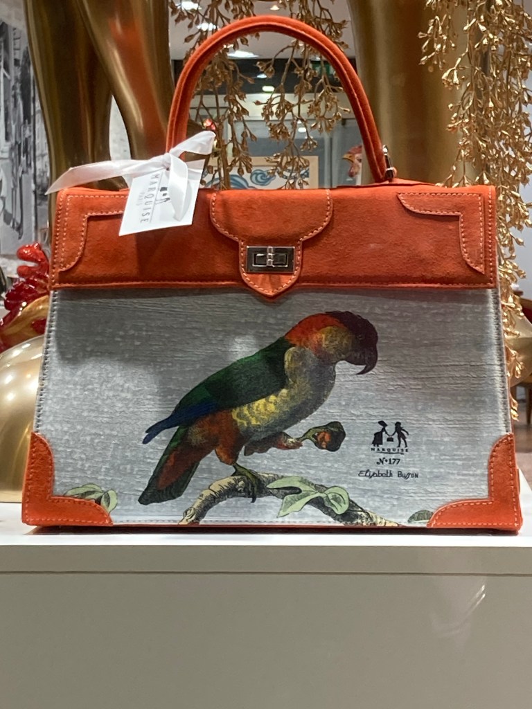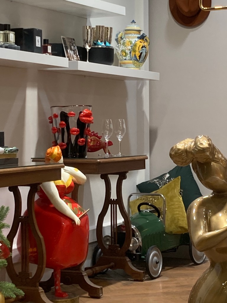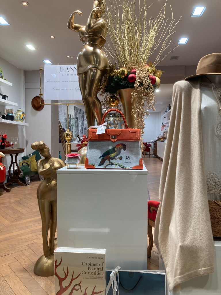 Puis reprenant les rues parallèles une boutique attira mon œil : une sorte de cabinet de curiosités avec des statues dorées, et un sac avec un perroquet m’amusa beaucoup. Et surtout la dame ronde en rouge et la voiture pour enfant verte. Beaucoup d’humour !