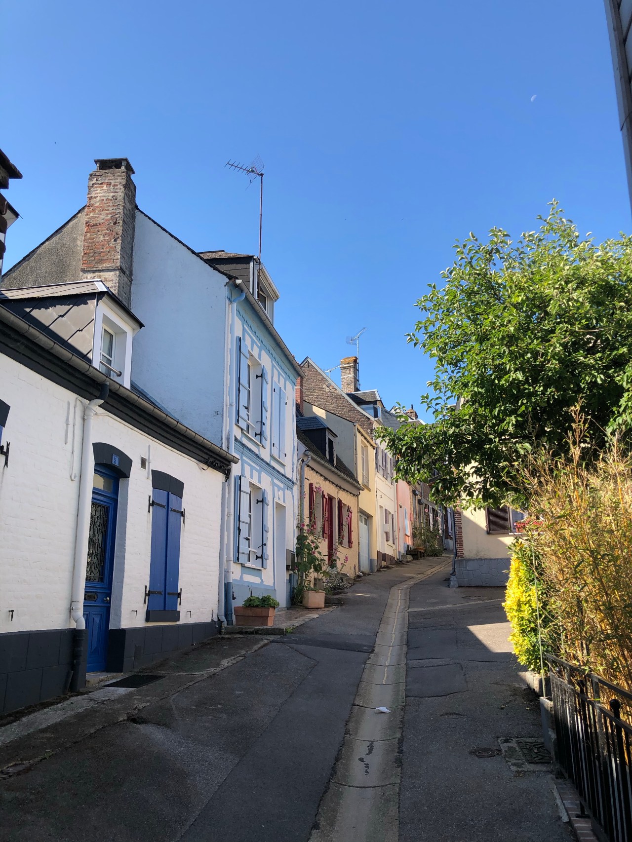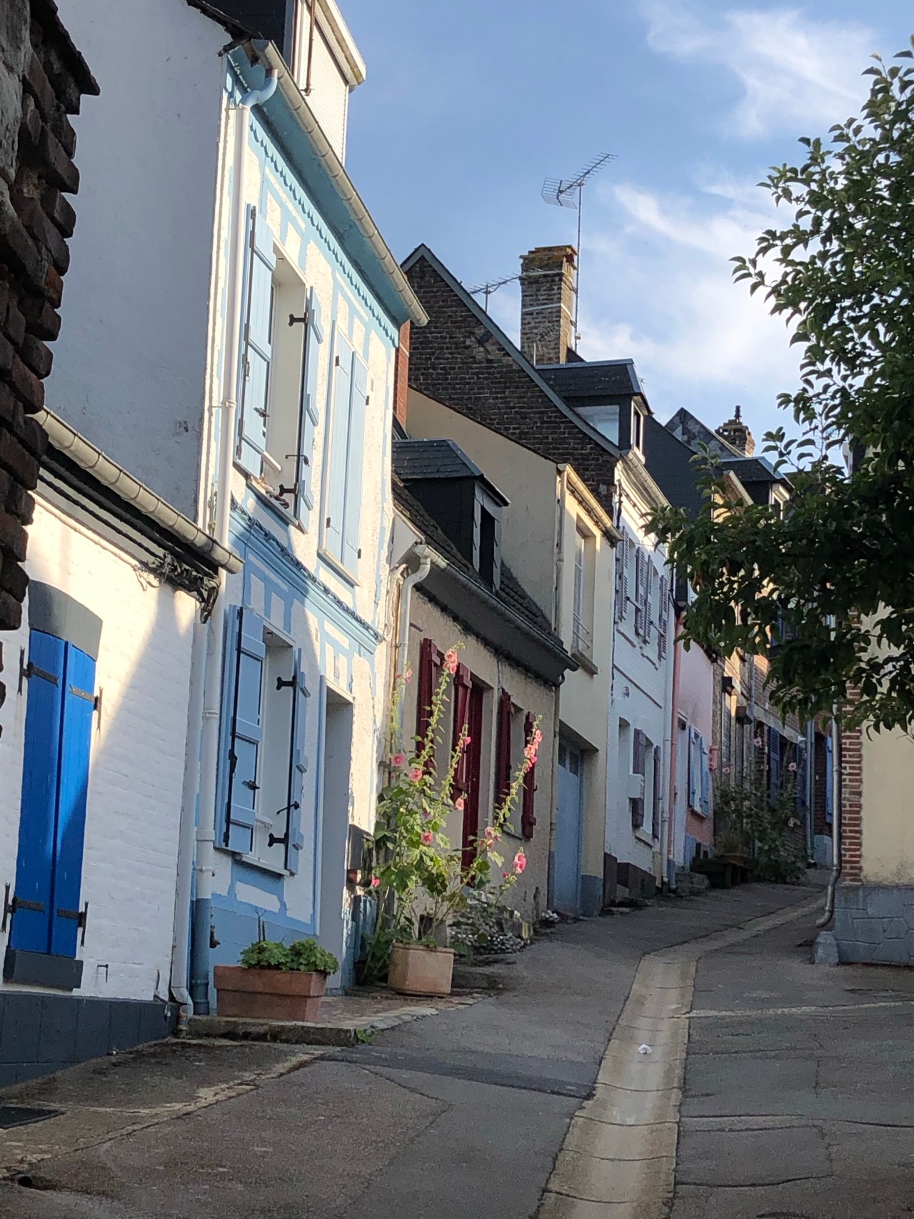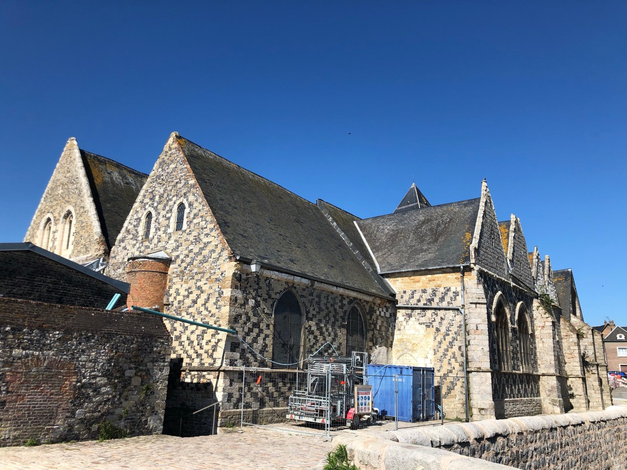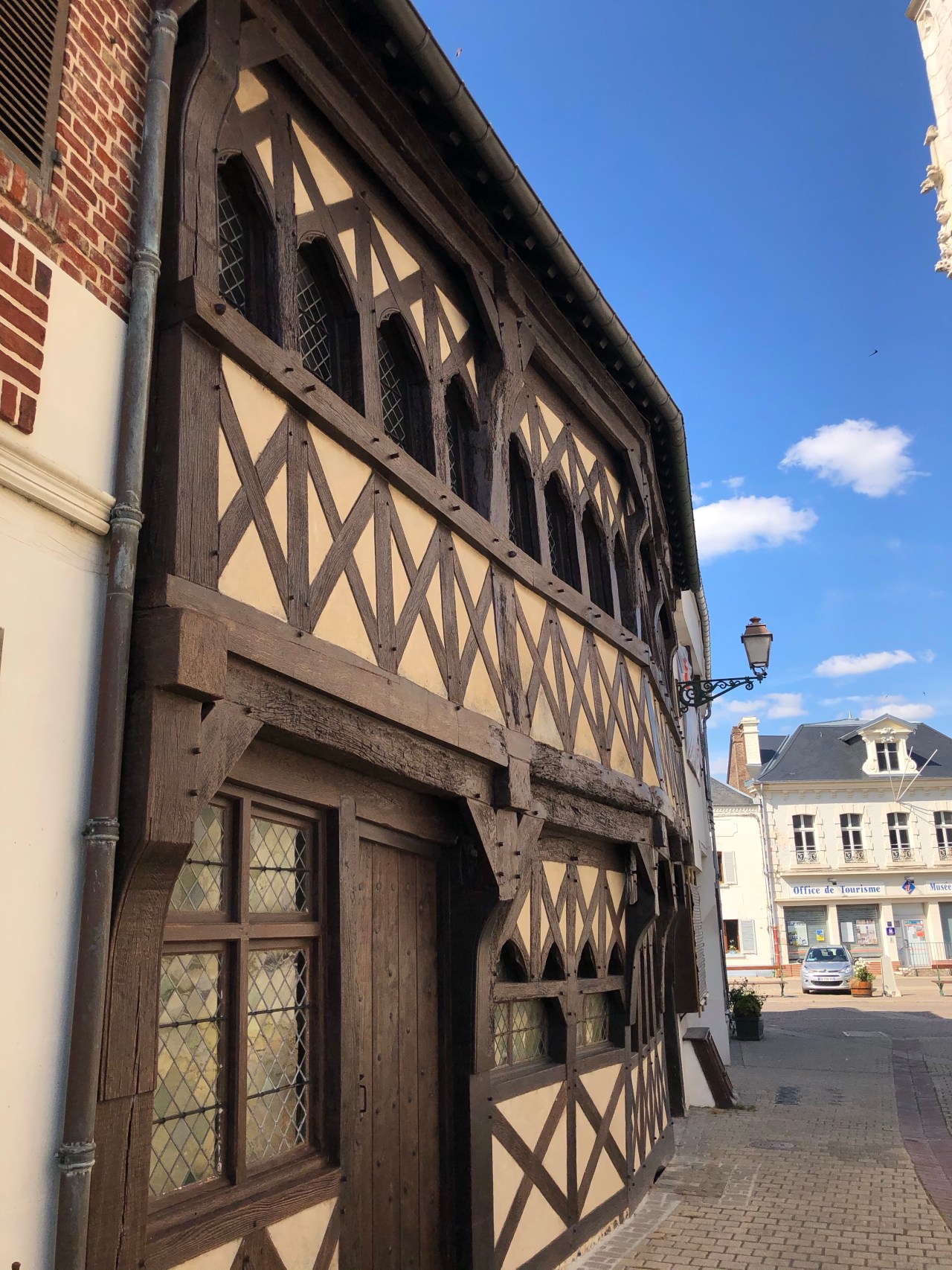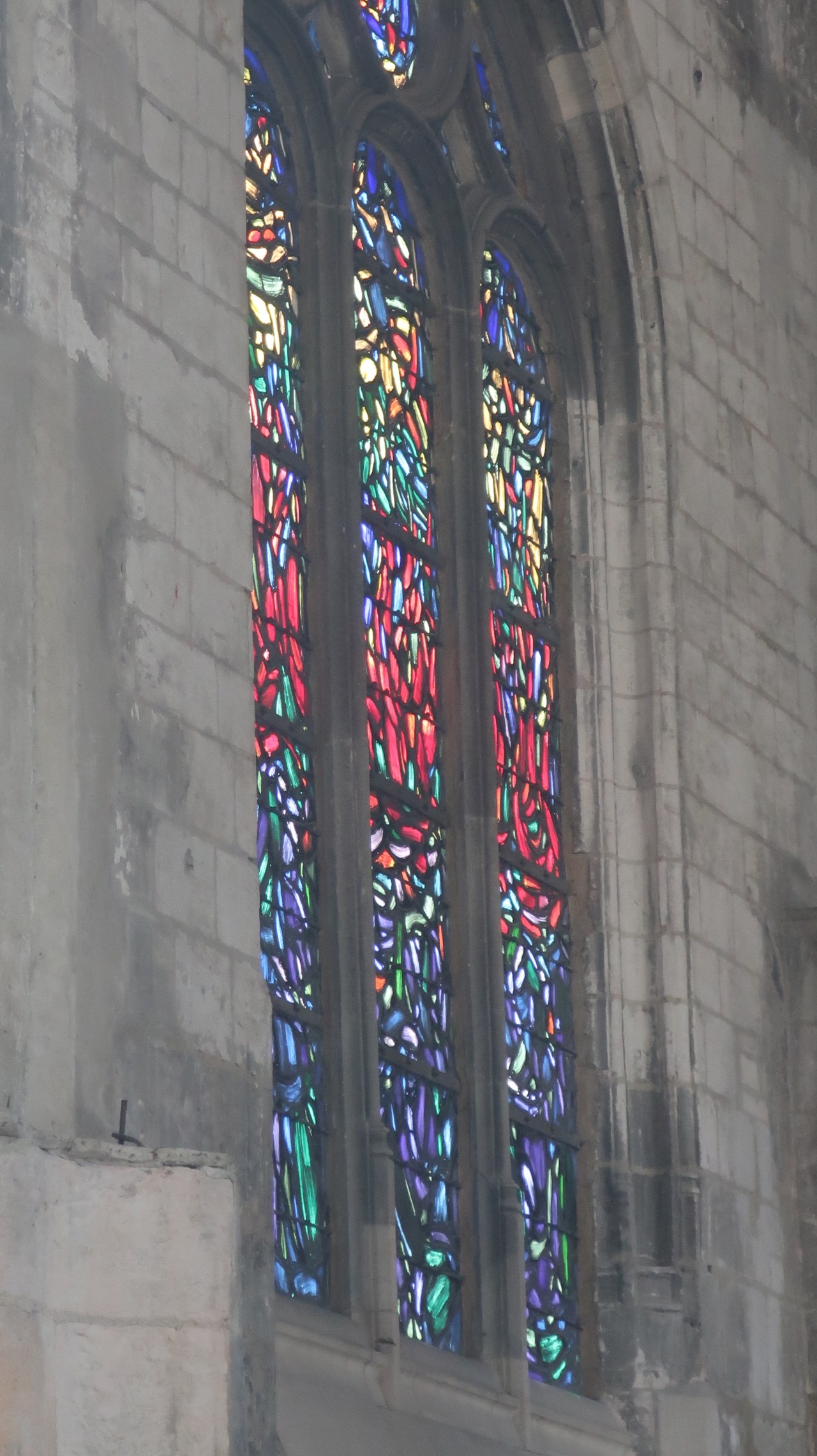 Abbeville sa ville moderne à touche-touche avec la cathédrale Saint-Ventoux où je suis entrée pour la visiter et voir ses magnifiques vitraux. Mais la messe était en plein office et je n’ai pas osé m’y incruster. J’ai admiré le plafond en forme de voûte de bateau à l’envers toute de bois et ses vitraux joyeux de toutes les couleurs qui rendaient l’endroit encore plus mystique. Et sa porte en bois travaillée et son fronton ciselé comme de la dentelle de calais. La prestance de ce bâtiment marquait la ville moderne de son empreinte. Il est enserré comme dans un étau d’immeubles bas modernes qui jurent avec le site. Mais Abbeville a été entièrement reconstruite après la seconde guerre mondiale et son style en est marquée !