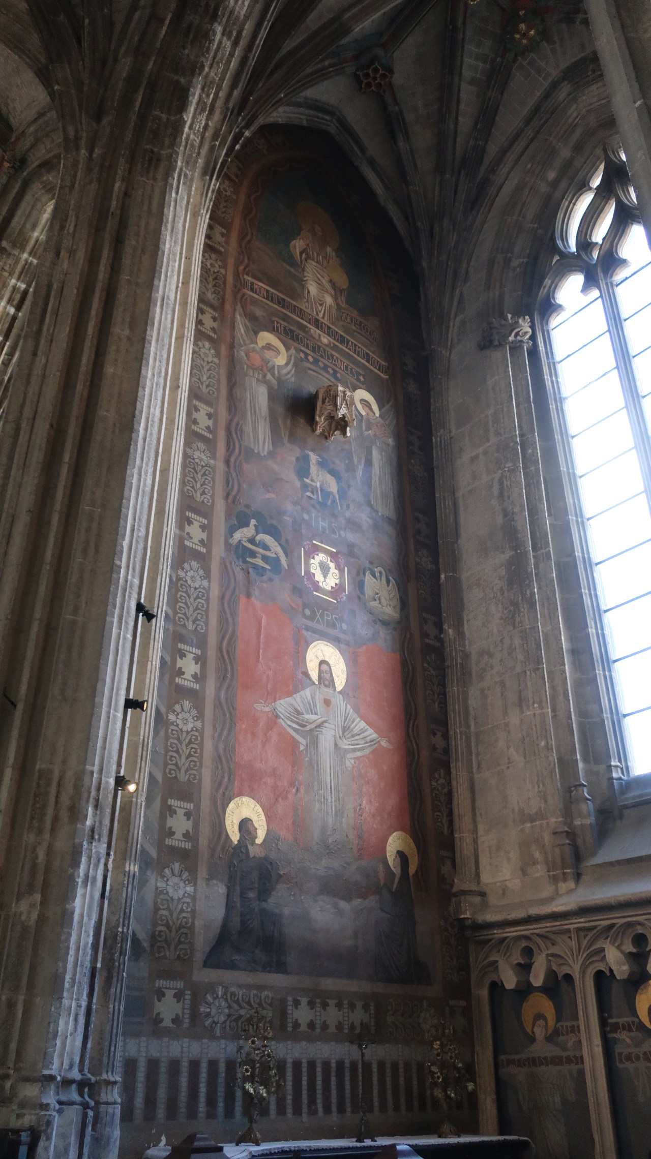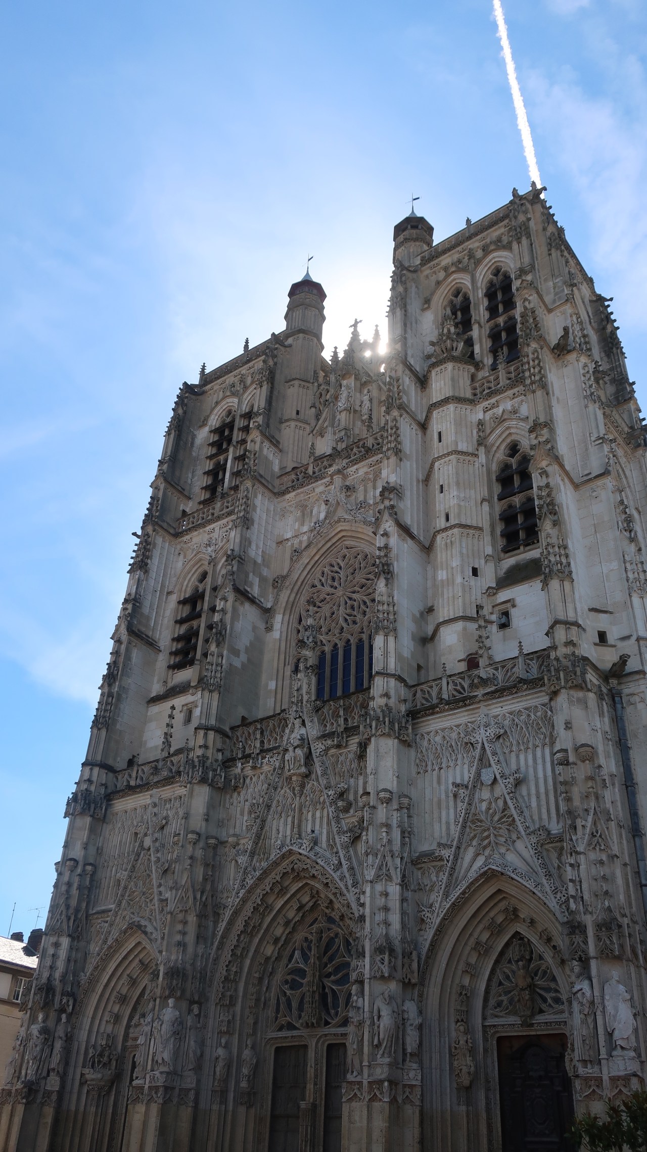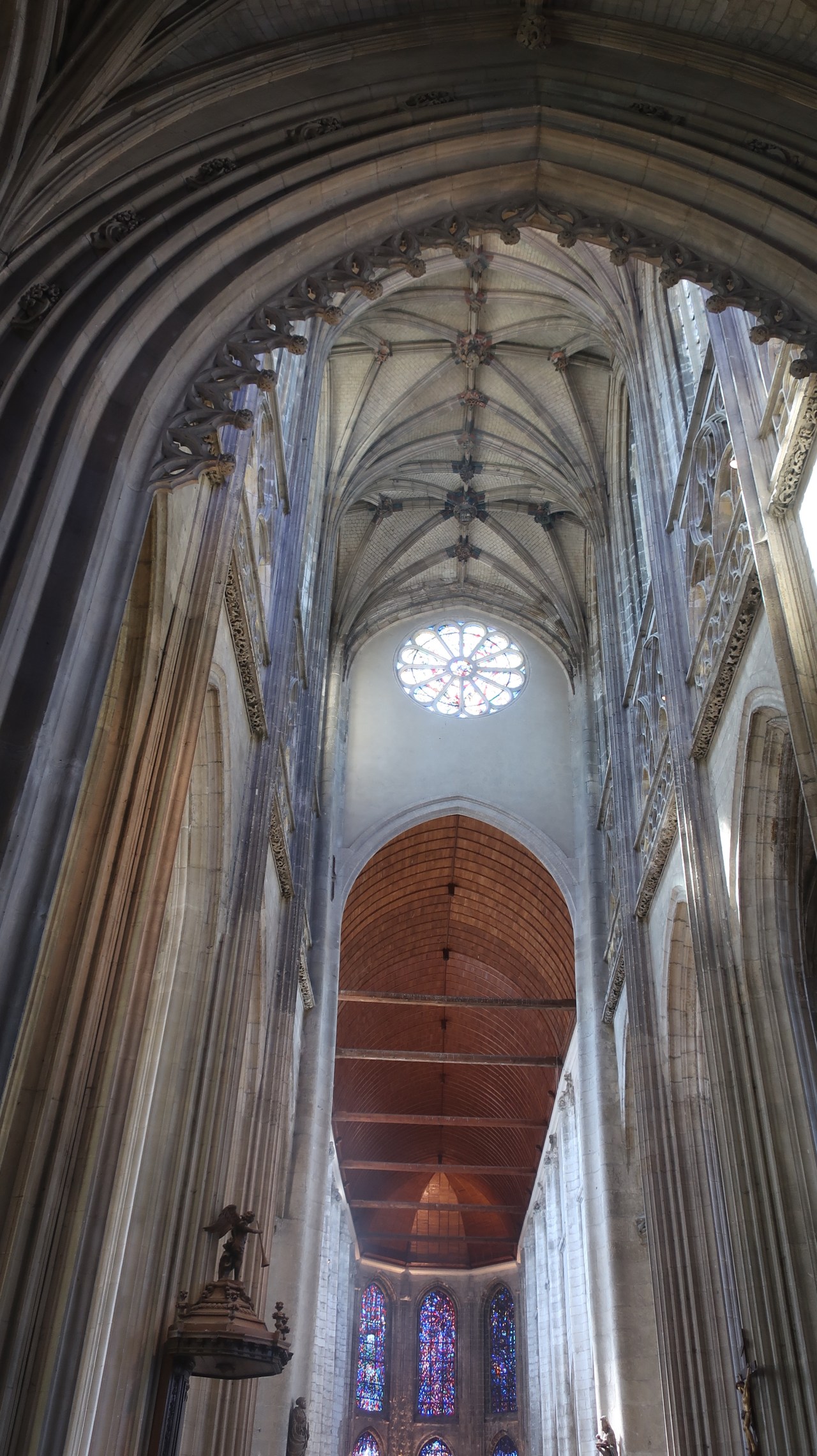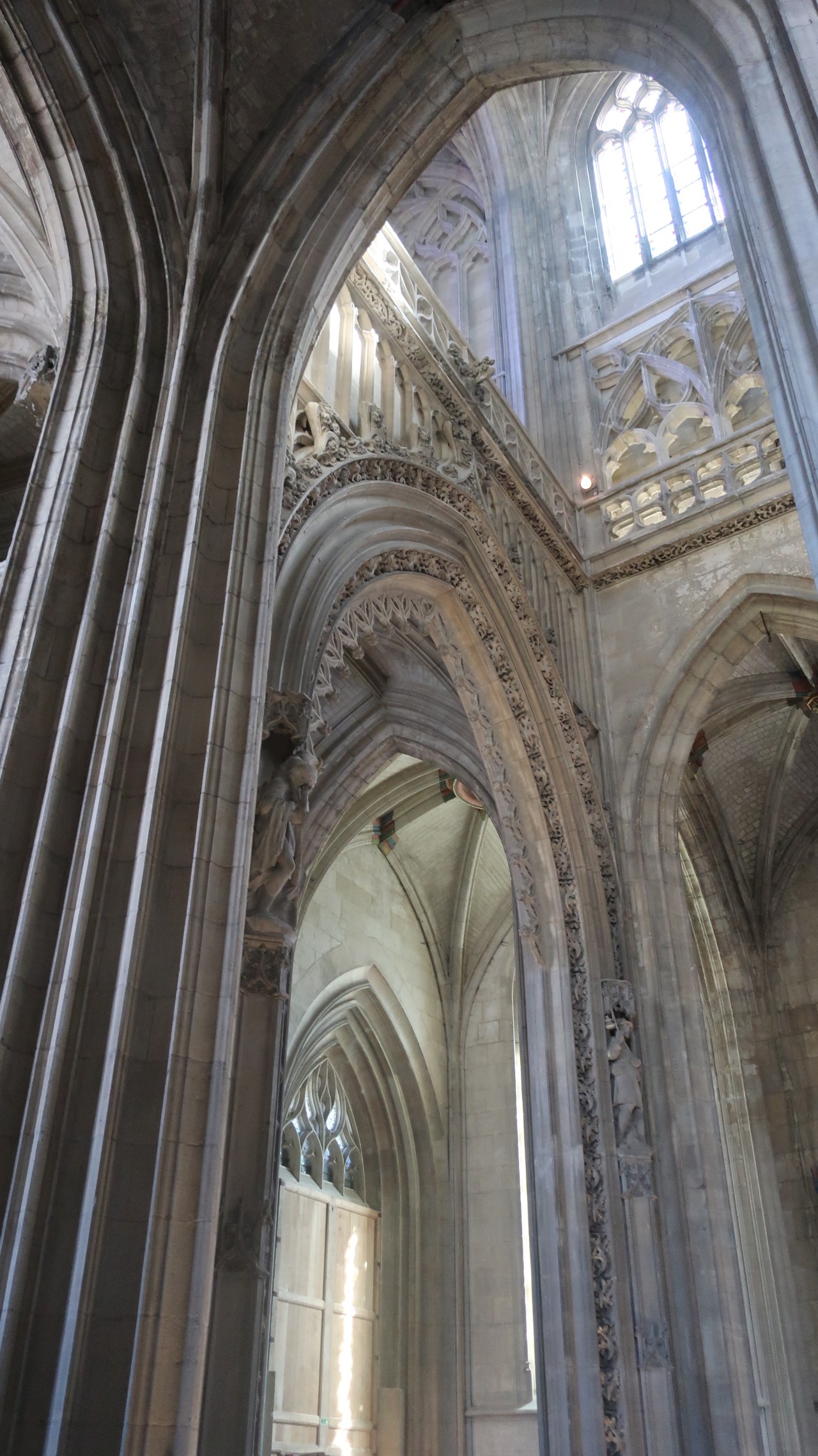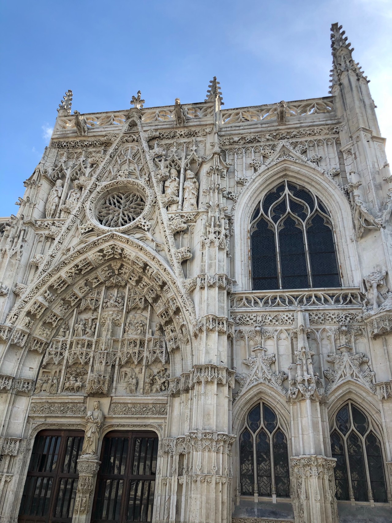 Abbeville sa ville moderne à touche-touche avec la cathédrale Saint-Ventoux où je suis entrée pour la visiter et voir ses magnifiques vitraux. Mais la messe était en plein office et je n’ai pas osé m’y incruster. J’ai admiré le plafond en forme de voûte de bateau à l’envers toute de bois et ses vitraux joyeux de toutes les couleurs qui rendaient l’endroit encore plus mystique. Et sa porte en bois travaillée et son fronton ciselé comme de la dentelle de calais. La prestance de ce bâtiment marquait la ville moderne de son empreinte. Il est enserré comme dans un étau d’immeubles bas modernes qui jurent avec le site. Mais Abbeville a été entièrement reconstruite après la seconde guerre mondiale et son style en est marquée !