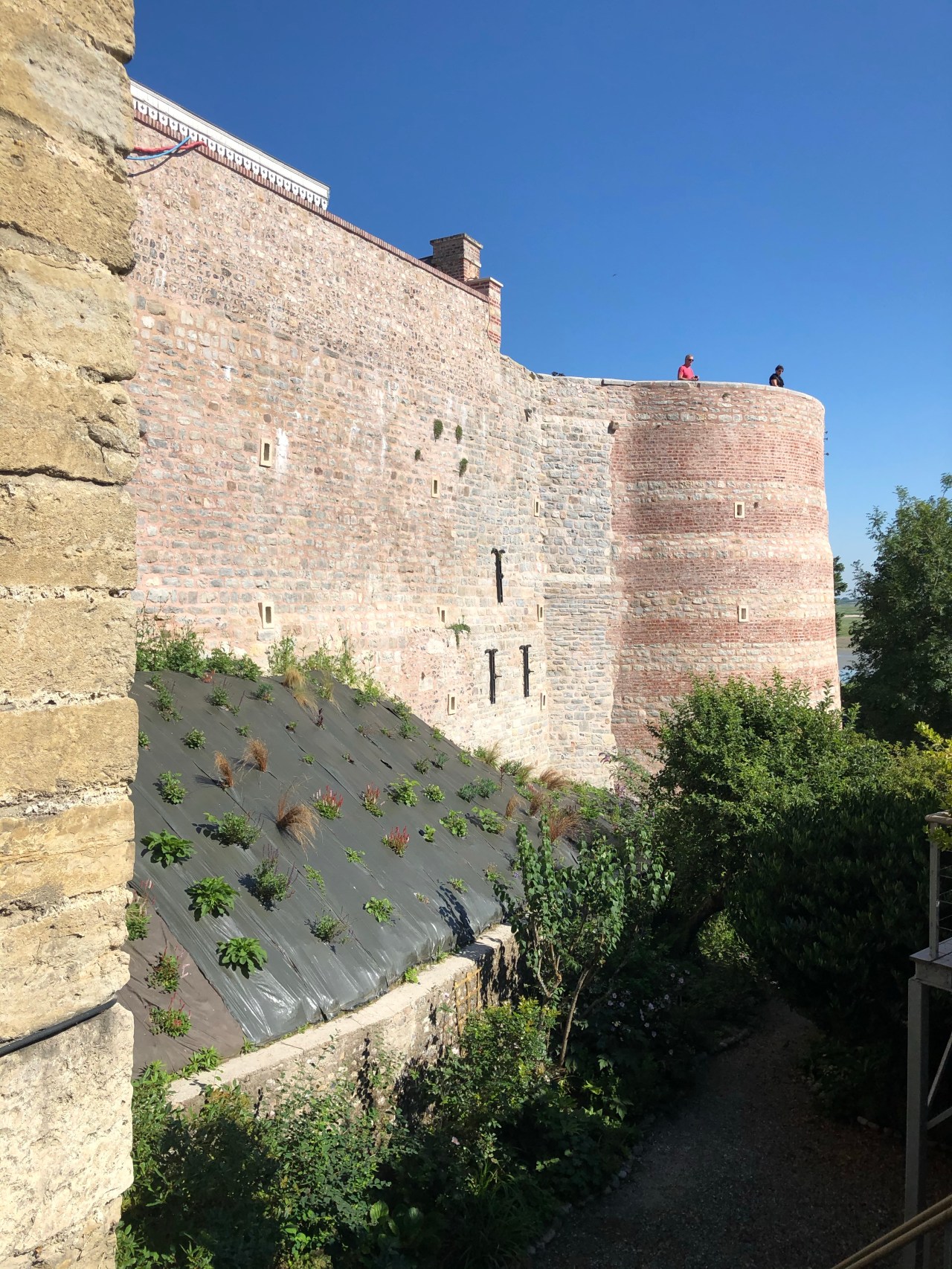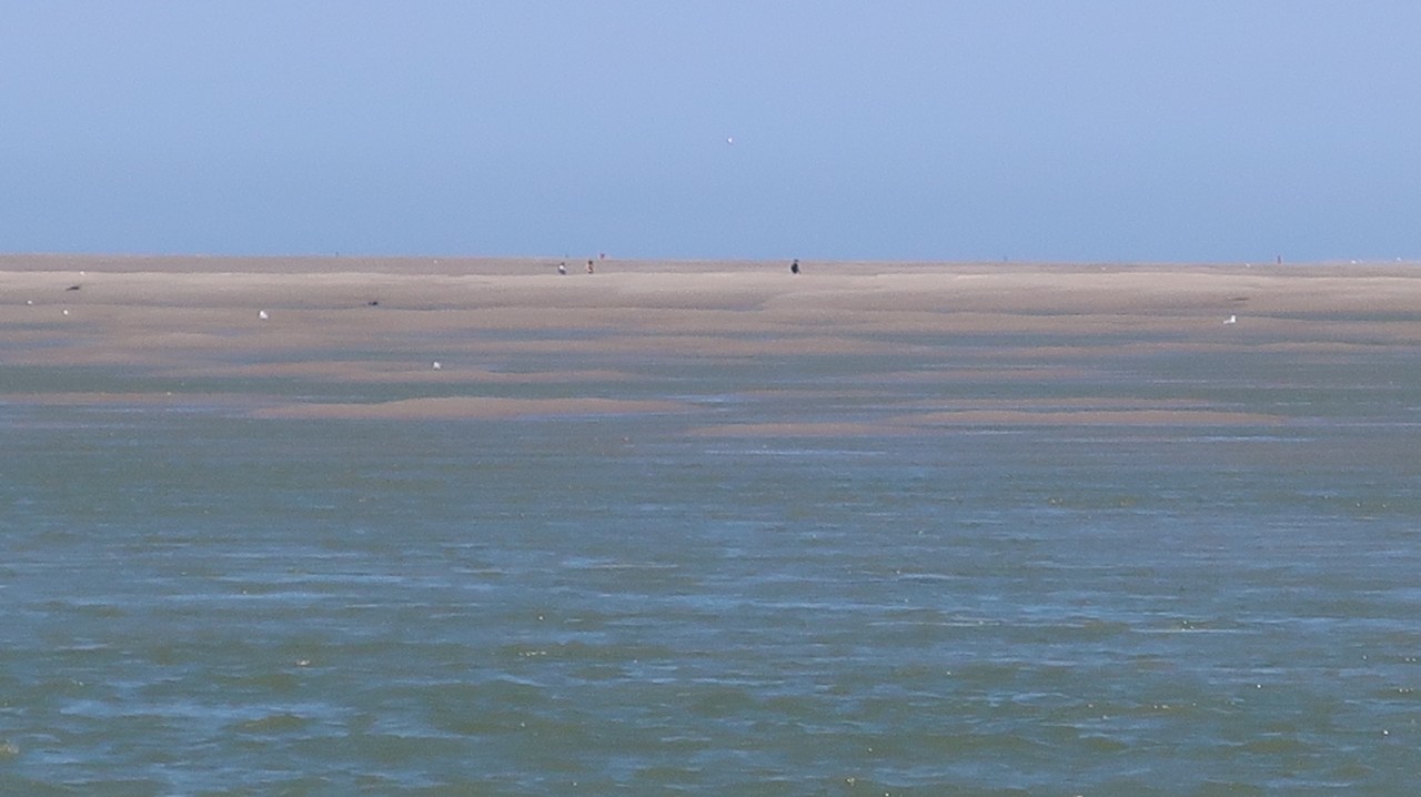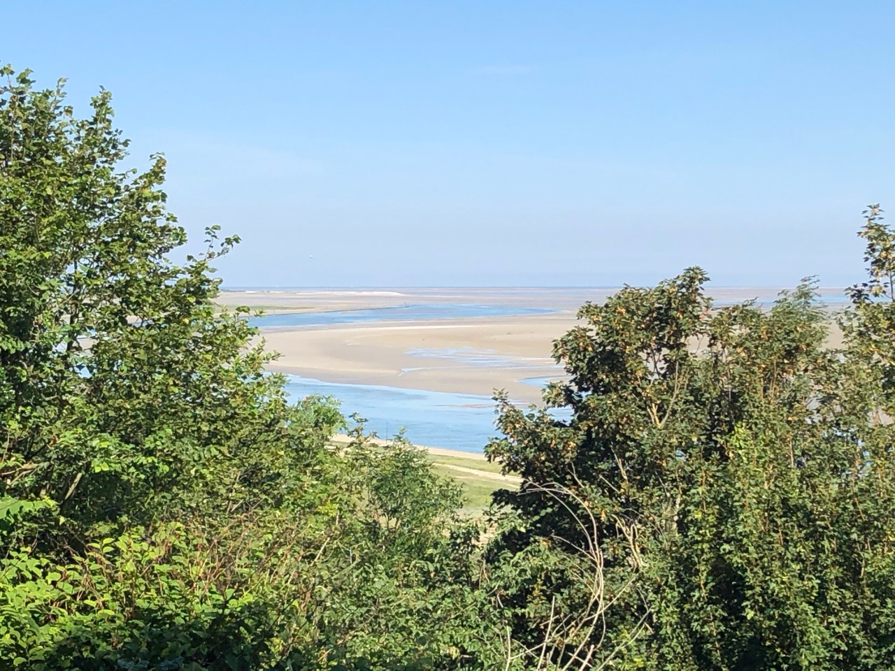 Et puis la vieille ville haute a aussi ses charmes avec sa porte, ses remparts qui montent la garde, son église aux pierres variées noires et blanches typiques de la région et ses vues sur la baie vidée de son eau de mer. On a une vue dégagée jusqu’au cap Hornu voir le cap de Hourdel. Et puis le matin les moutons viennent boire l’eau du chenal et sont là à se pavaner en face de vous.