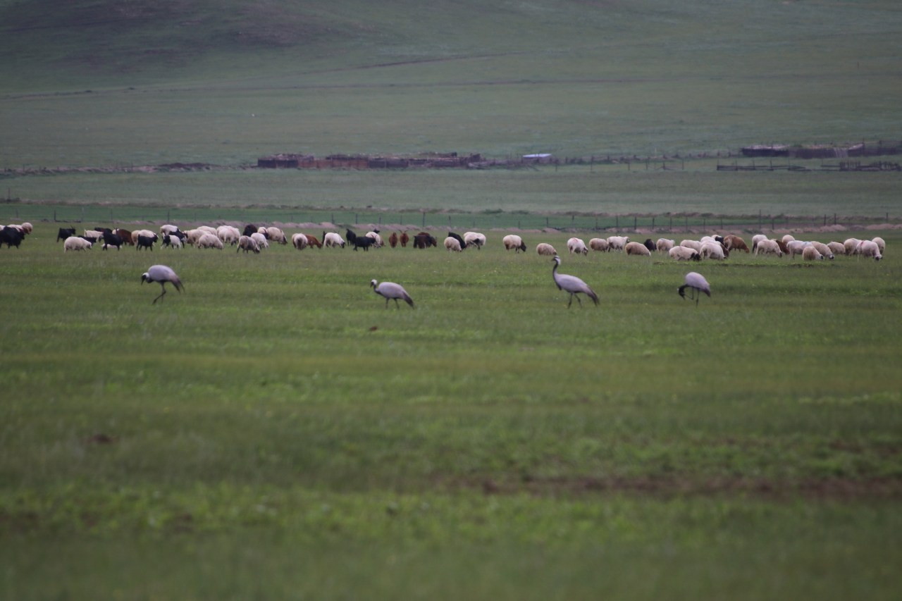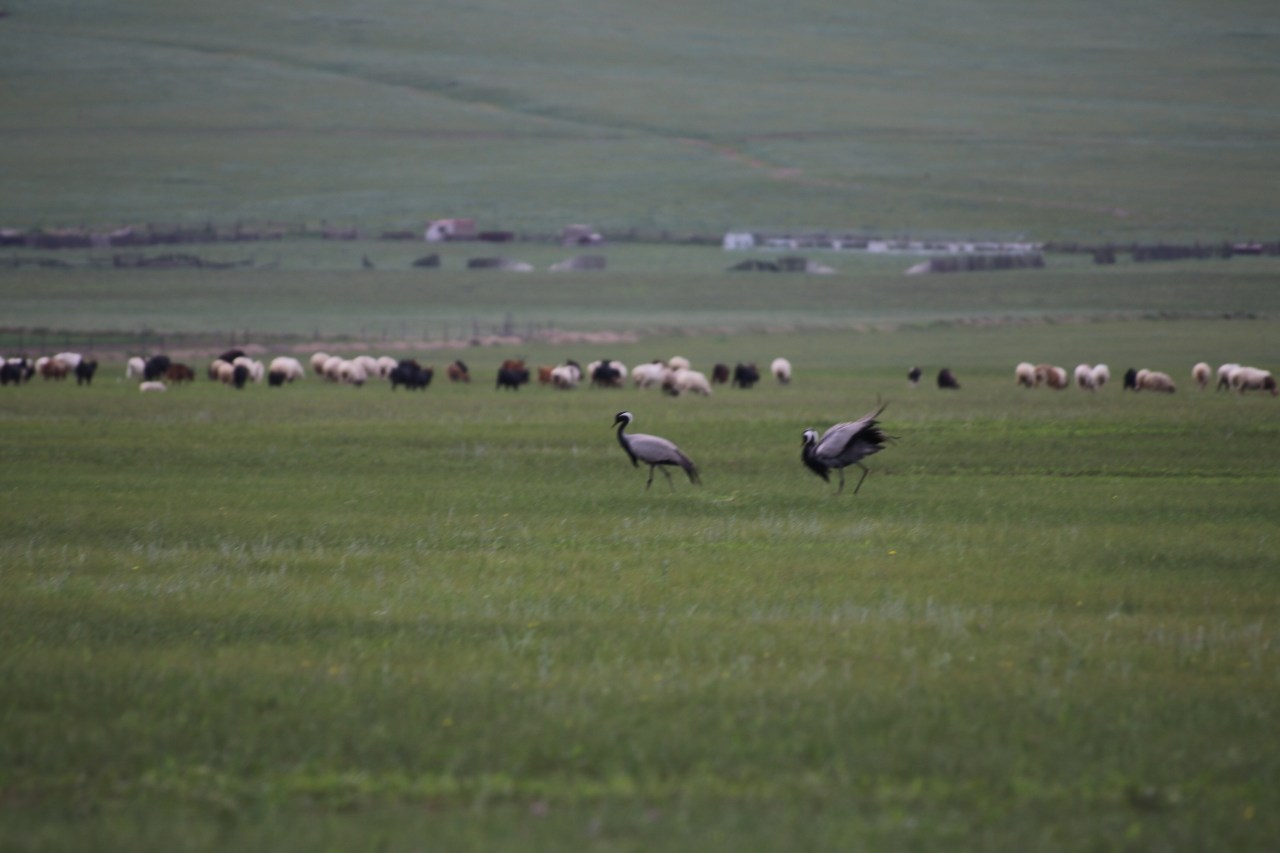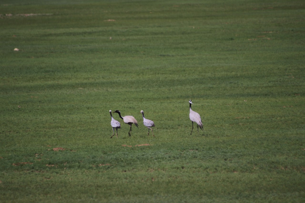Au détour d’une autre piste, nous retrouvons ces dames picorant l’herbe, bien verte de la steppe, non loin d’un troupeau de moutons, qui eux-mêmes, broutent. Pas effrayées pour le moins, elles continuent leur bonhomme de chemin, à déguster des grains de blé, des vers ou des insectes de la prairie. Toujours regroupées par trois ou quatre. A croire qu’elles sont en couple. Et elles le sont réellement ! Il faut dire que les grues sont monogames et qu’elles restent unies pour la vie.