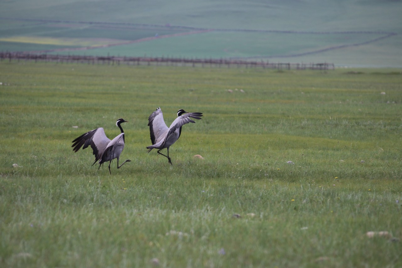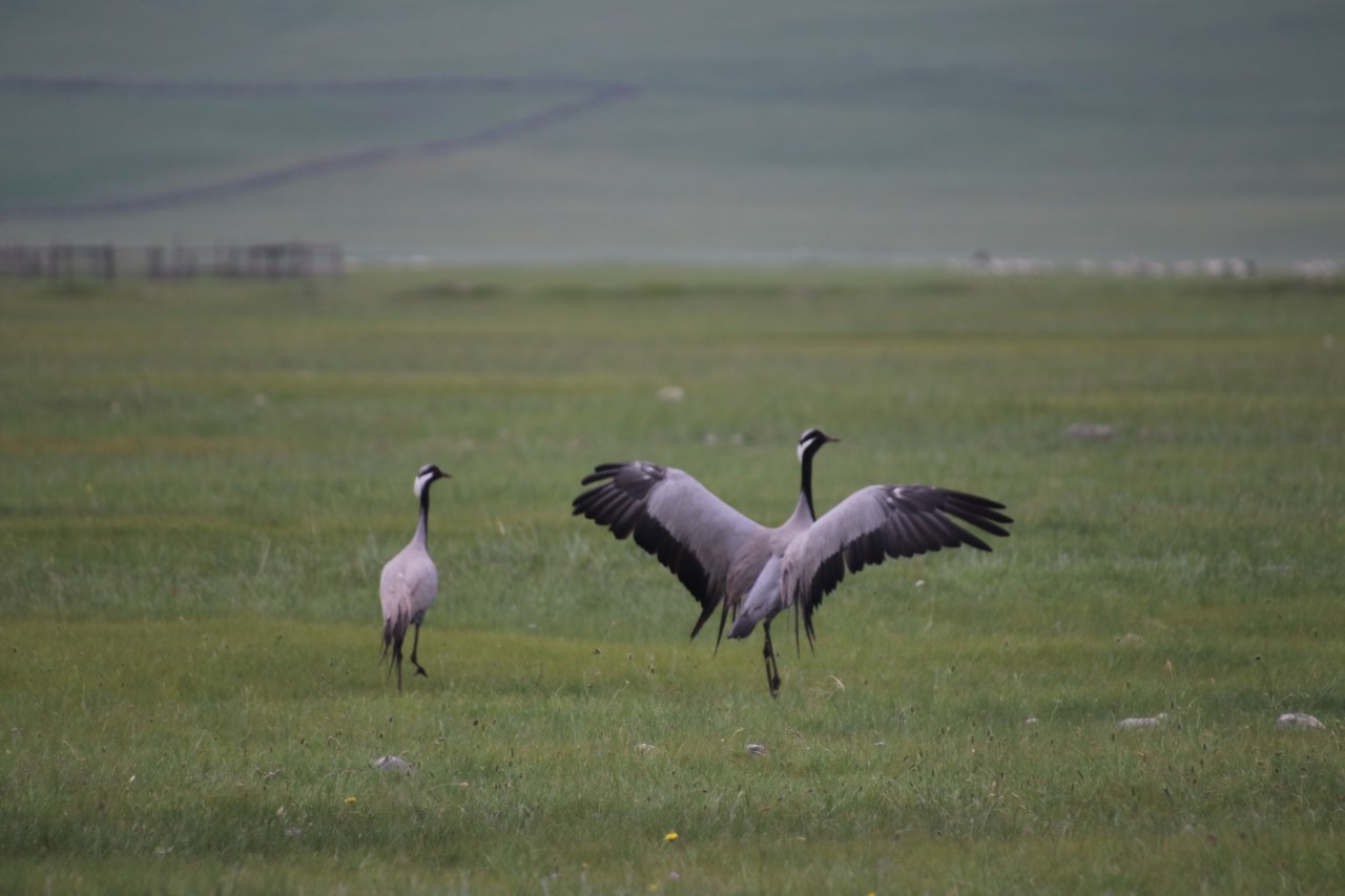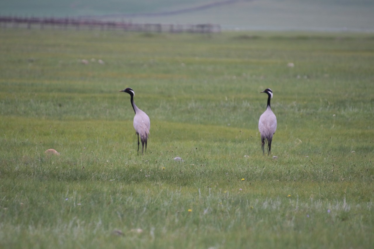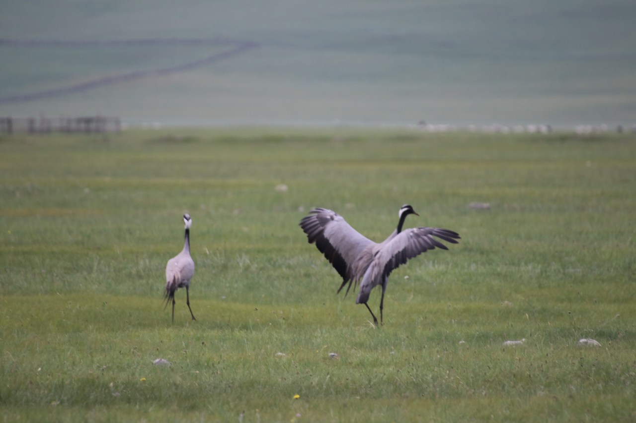 Au détour d’une autre piste, nous retrouvons ces dames picorant l’herbe, bien verte de la steppe, non loin d’un troupeau de moutons, qui eux-mêmes, broutent. Pas effrayées pour le moins, elles continuent leur bonhomme de chemin, à déguster des grains de blé, des vers ou des insectes de la prairie. Toujours regroupées par trois ou quatre. A croire qu’elles sont en couple. Et elles le sont réellement ! Il faut dire que les grues sont monogames et qu’elles restent unies pour la vie.