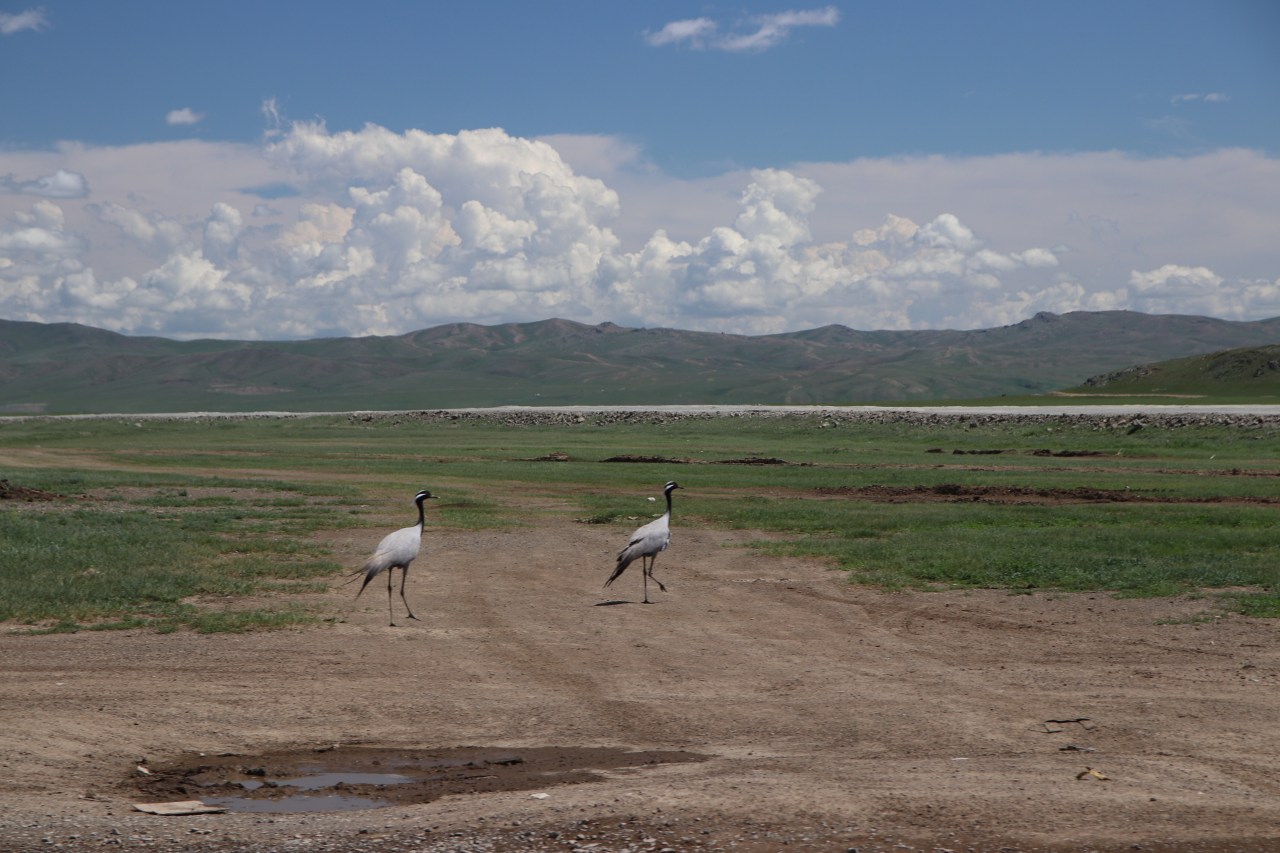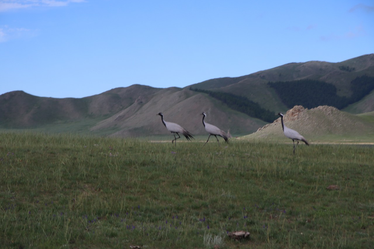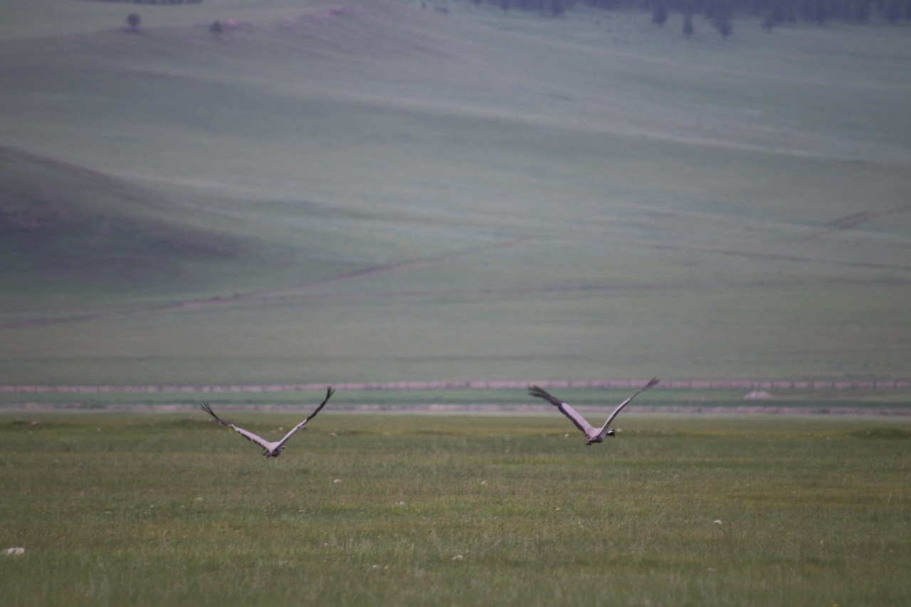 Nous avons à nouveau croisé leur chemin, en nous dirigeant vers le nord, près des lacs blanc et Nuur. Elles se dandinaient à plusieurs, comme si elles se faisaient la cour.  Leur port était altier et elles se détachaient des collines environnantes. Puis là aussi, elles prirent leur envol, gênées par notre présence. L’une d’entre elles donna le signal du départ. Puis le long d’une rivière, elles paissaient tranquille et se rassasiaient de verdure ou d’insectes. Notre bruit les effraya et elles s’envolèrent.