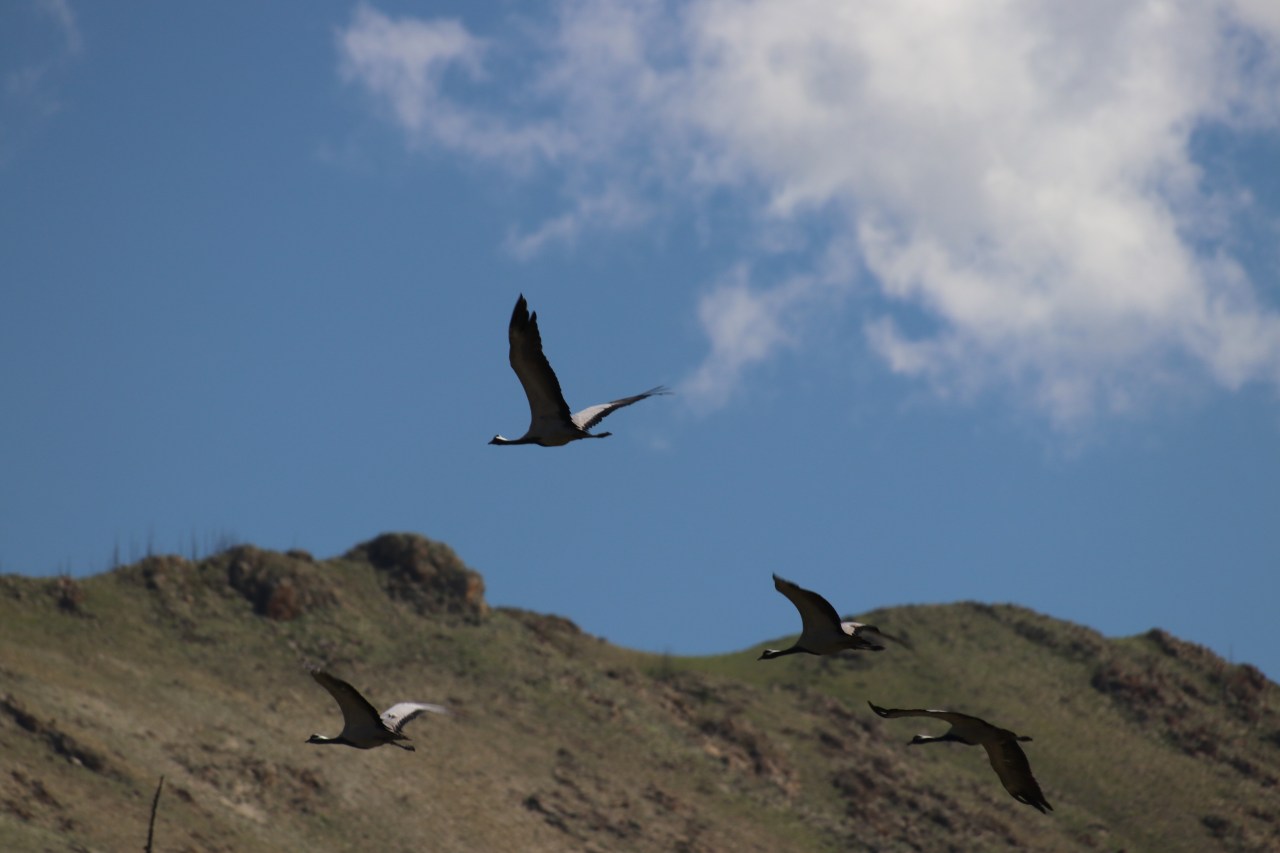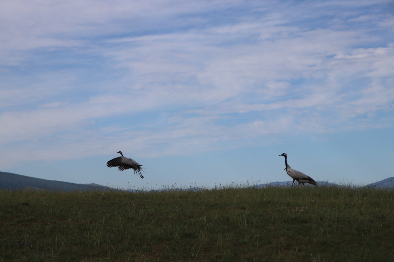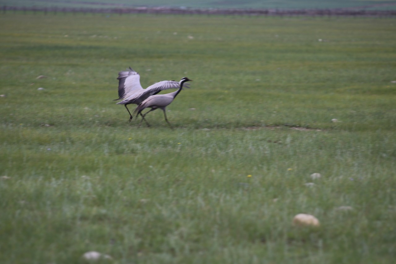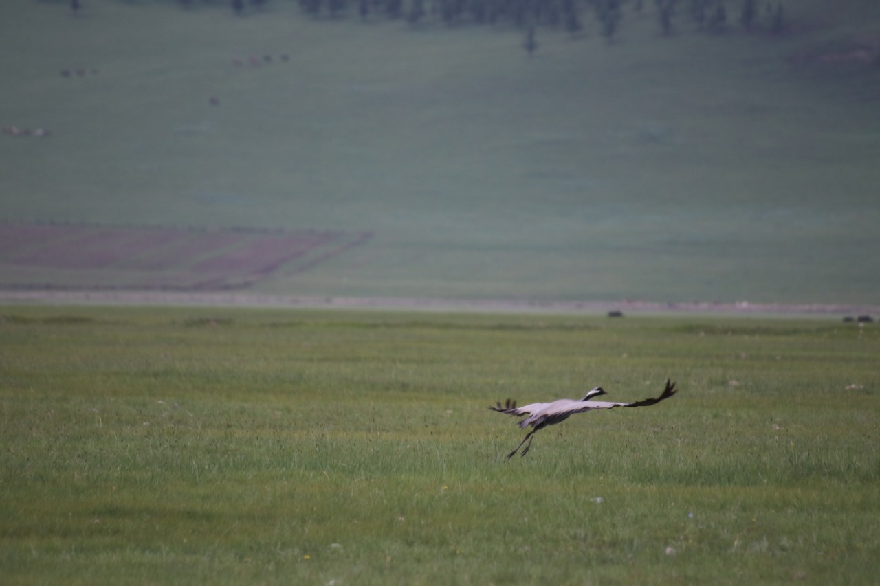 Nous avons à nouveau croisé leur chemin, en nous dirigeant vers le nord, près des lacs blanc et Nuur. Elles se dandinaient à plusieurs, comme si elles se faisaient la cour.  Leur port était altier et elles se détachaient des collines environnantes. Puis là aussi, elles prirent leur envol, gênées par notre présence. L’une d’entre elles donna le signal du départ. Puis le long d’une rivière, elles paissaient tranquille et se rassasiaient de verdure ou d’insectes. Notre bruit les effraya et elles s’envolèrent.