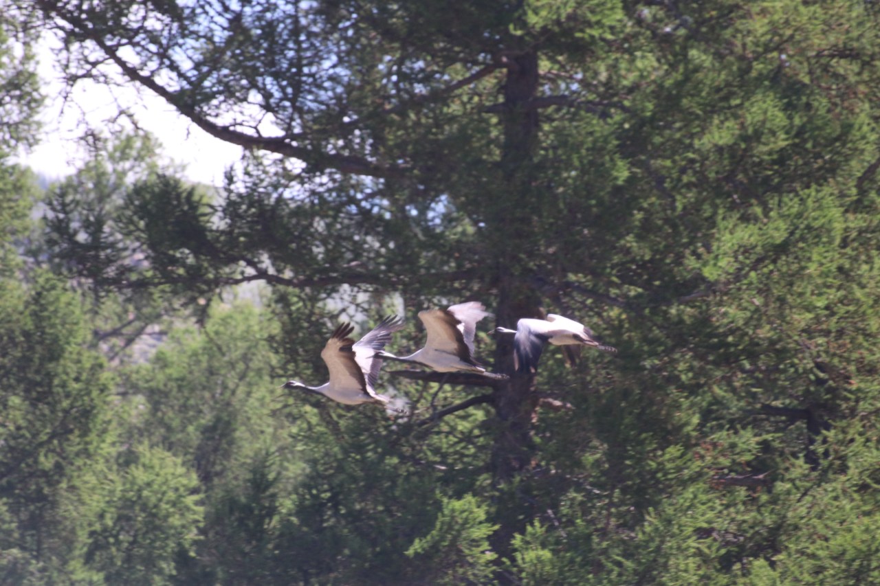 Le spectacle de cet envol et du vol des grues cendrées nous laissa bouche bée. Je n’ai pas pu les lâcher des yeux et j’ai suivi leur vol un bon moment. Il se détachait sur le fond des mélèzes nous environnant. Elles volaient en se suivant ou en parallèle ou décrivant un V horizontal. L’une donnant, à tour de rôle, la route à suivre.