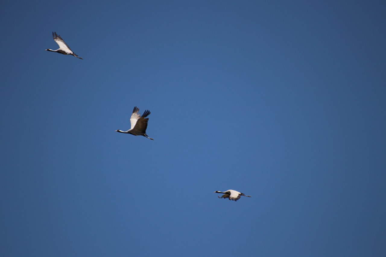 Et tout à coup, l’une d’elle prend peur, coure sur quelques mètres et ouvre ses ailes pour l’envol. La deuxième la suit dans cette nouvelle danse harmonieuse. Alors on découvre la robe grise cendrée et noire qui dessinent le pourtour de ses ailes. Et là le miracle opère : les grues se lancent dans une course effrénée pour s’envoler. Les échasses se plient, le corps bascule, le long cou bien droit. On dirait assister à une parade nuptiale. Puis le calme revient et les grues regardent le paysage et nous tournent royalement le dos, nous ignorant ! Et le spectacle recommence. L’une d’elles déploient ses ailes et s’envolent. Les échasses se croisent presque à l’arrière, les ailes se déploient et la grue décolle. Voir les ailes se déployer, plier et se mouvoir est juste magnifique. Les grues alors se fondent et se confondent au paysage. Elles adoptent presque la couleur de la colline. Un fin trait dans l’air nous permet de les reconnaitre. Mais nous pouvons les voir se détacher du sol et les suivre du regard. Chaque mouvement des ailes laisse perplexe : un temps, vers le haut,  les grues font une sorte de grand V ondulant ; un temps, elles les baissent et forment une sorte de coude. Et l’ondulation reprend et se reforme.