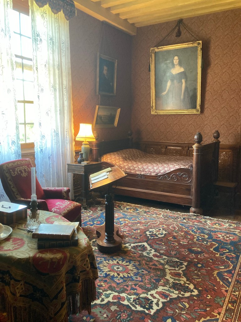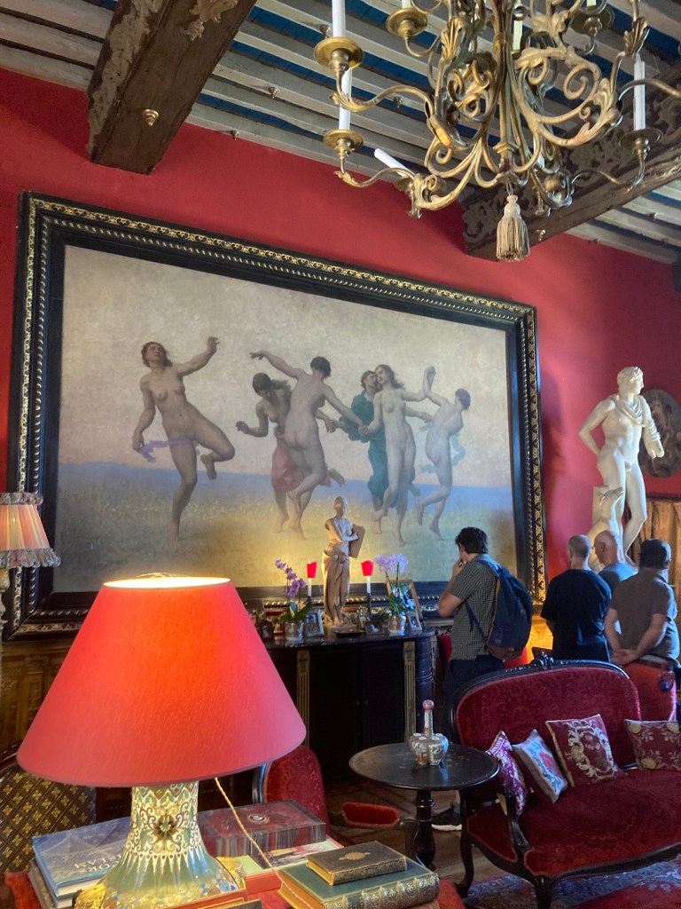 Tout d’abord l’escalier qui s’élève sur quatre niveaux et fait 21mètres de hauteur pour atteindre au 1er étage le salon bibliothèque où un mélange de style fait jour. Mais ce qui est remarquable c’est le plafond à la française avec des reliefs en papier maché et le tableau la ronde antique. Juste adjacente la chambre de Lamartine qui séjourna en ce lieu de manière régulière.