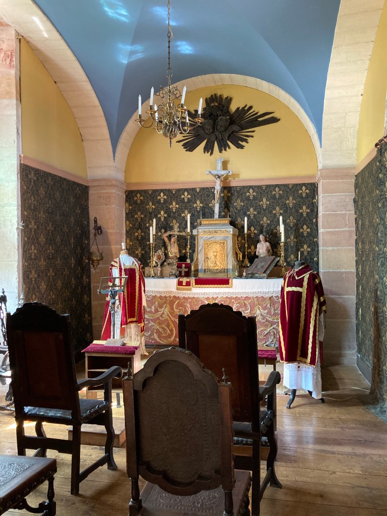 De là on traverse d’autres salles pour finir sur la chapelle pour finir sur un couloir menant à une salle à manger mais surtout nous permettant d’admirer le poêle en céramique bleue.