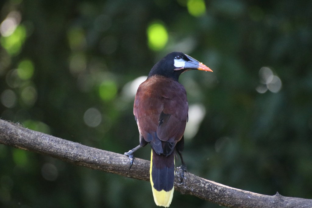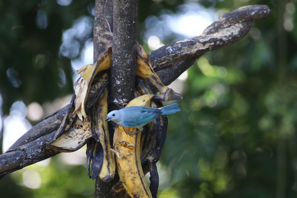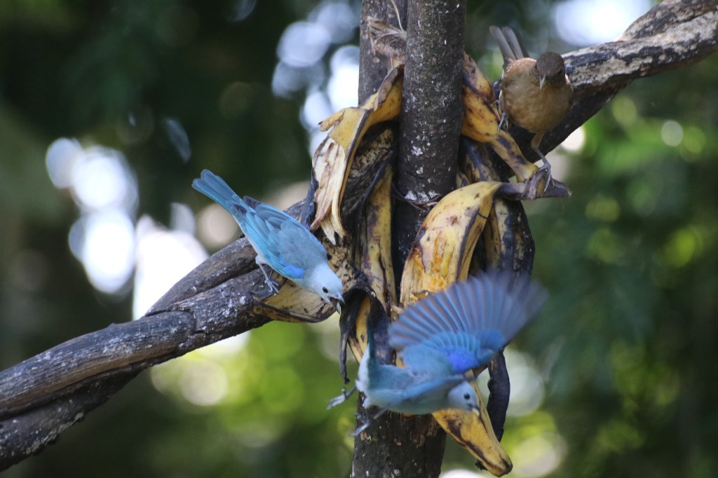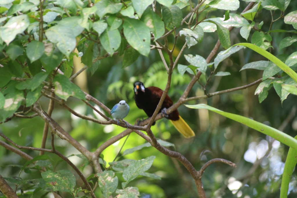 Puis des oiseaux bleus, Tangara évêque, arrivent et jouent des ailes mais se méfient des toucans ou des oiseaux noirs aux queues jaunes qui sont les cassiques huppés dit de Montezuma qui ont un chant enchanteur. Ils ressemblent à un gros merle avec des plumes jaunes. Leur chant me rappelait celui entendu en Nouvelle-Zélande.