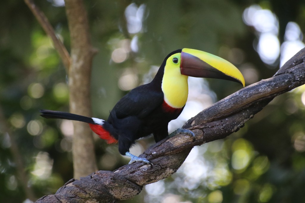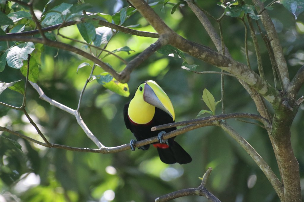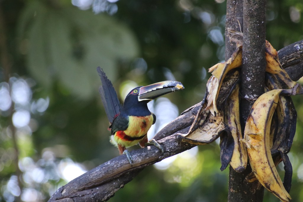 Tout d’abord les toucans au bec jaune dit toucan de chesnut et ceux au bec noir dit araçari à collier, avec des sortes de lames pour couper les fruits.