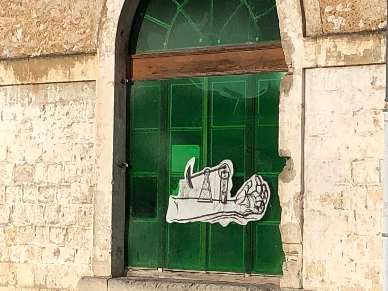 Et tout à côté un autre bâtiment qui accueille des associations où des collages font apparition sur des vitres vertes. Le bras d’un travailleur avec le forage d’un puit de pétrole marque les esprits.