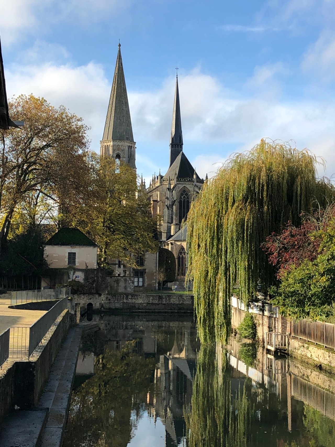 C’est une ville au passé florissant de la Renaissance qui a gardé son charme et qui est en rénovation. Le loir qui longe la ville donne un air champêtre et donne du caché à la ville. Le Loir se coupe en plusieurs cours qui enserrent la ville. On peut y voir des canards voguer, des barques attachées au rebord. Et surtout au centre de la ville un cours plus large longe les maisons et se jette presque dans la cathédrale et repart de l’autre côté de la ville. Avec l’automne et les feuilles jaunes, des reflets dans l’eau se forment, les arbres se mirent et le soleil éclaire l’eau.
