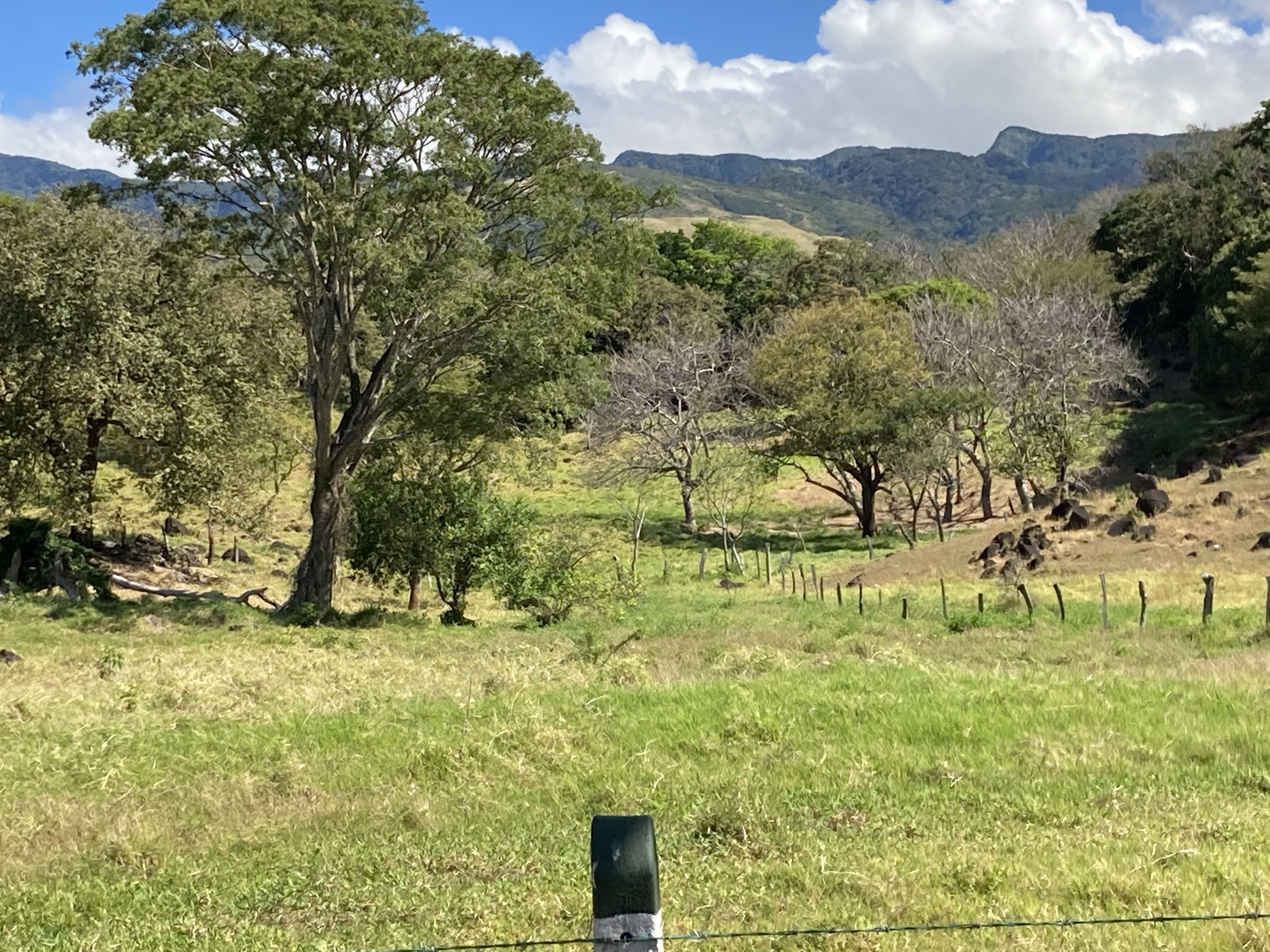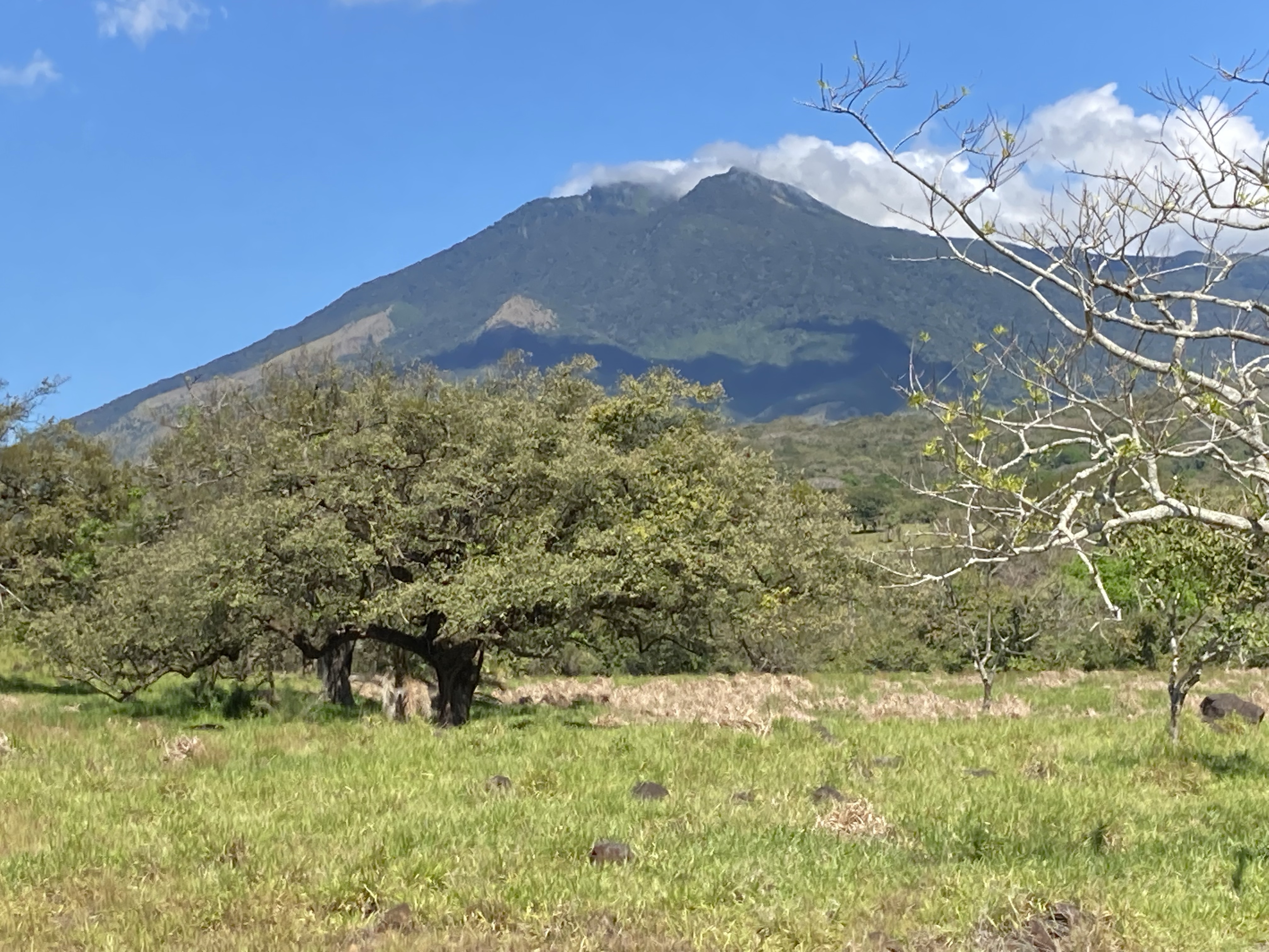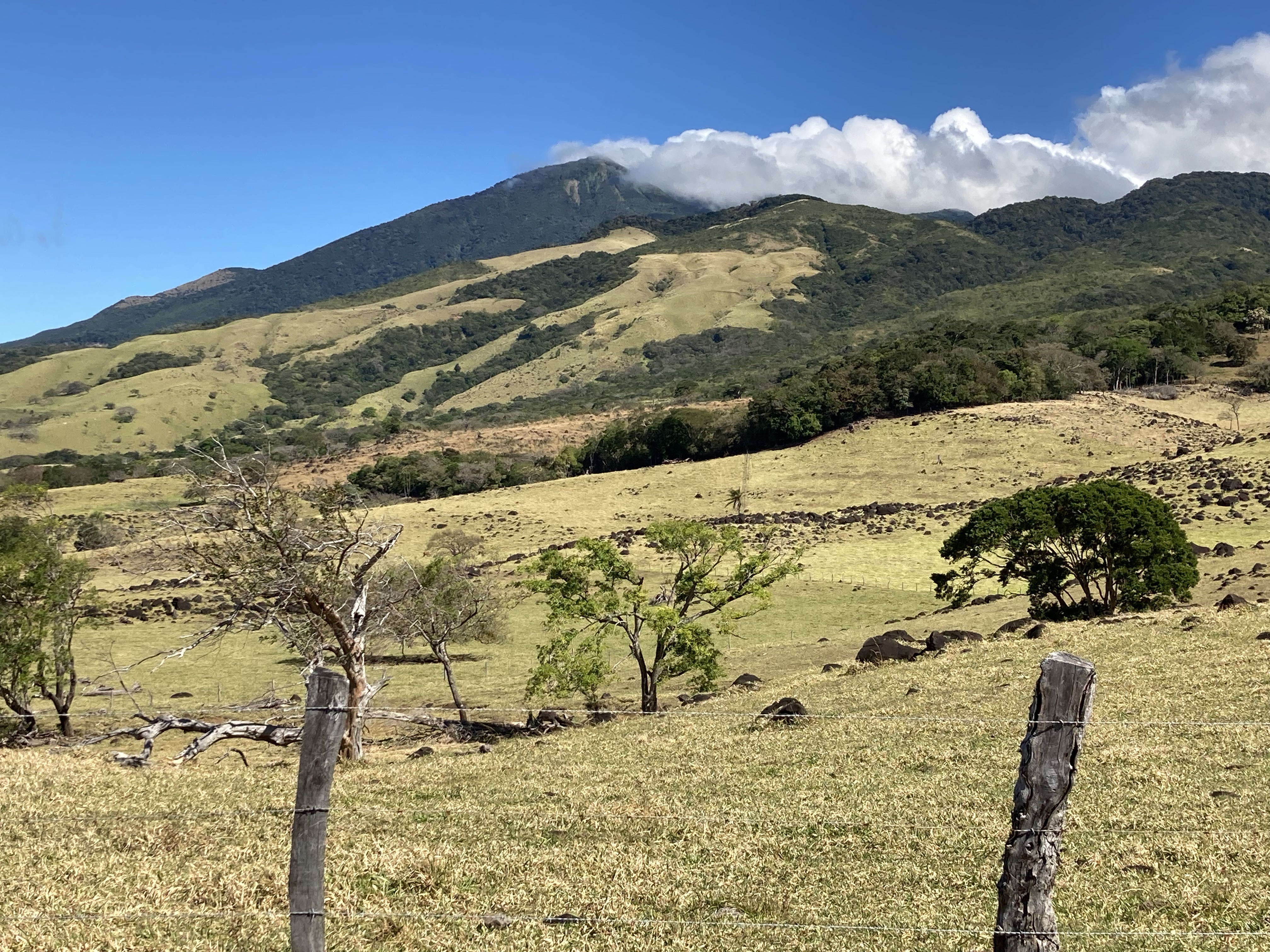 Les nuages lèchent les sommets des vallons et on dirait que la montagne fume. Ce n’est pas le cas car je crois que le volcan Miravalles est éteint. Il fait partie de cette chaine de volcans qui traversent le Costa Rica du sud au nord en remontant vers le Nicaragua.
