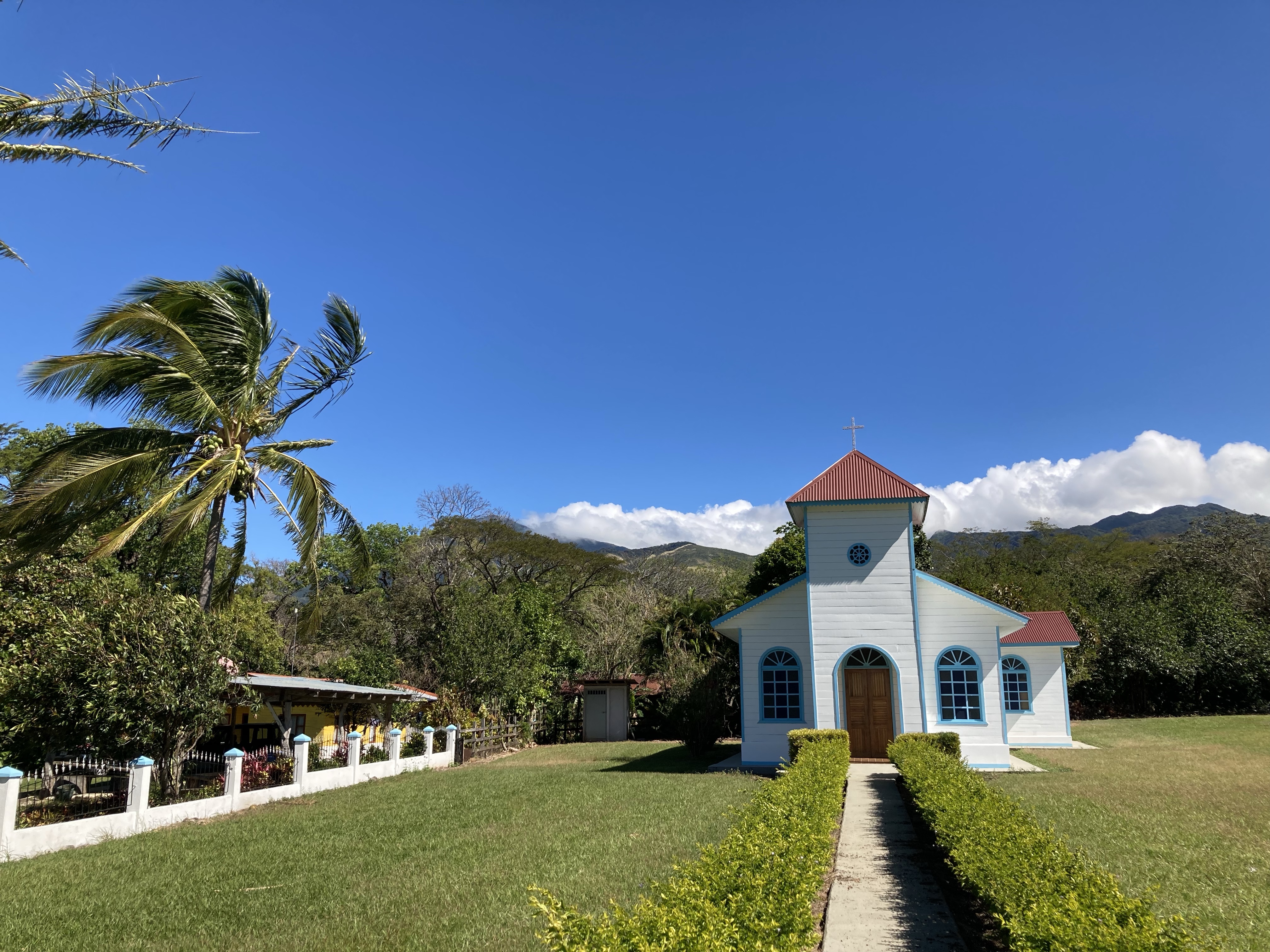 Un peu plus loin on croise un joli petit village où se trouve une église plantée sur un pâturage, couleur paille car il fait chaud. Je n’ai pas pu la visiter car elle était fermée. Elle est toute blanche et les fenêtres sont entourées de bleu ciel. Un endroit paradisiaque ! Au centre du village il y avait un pressoir dessous un hangar de taule et je ne sais pas à quoi il servait.