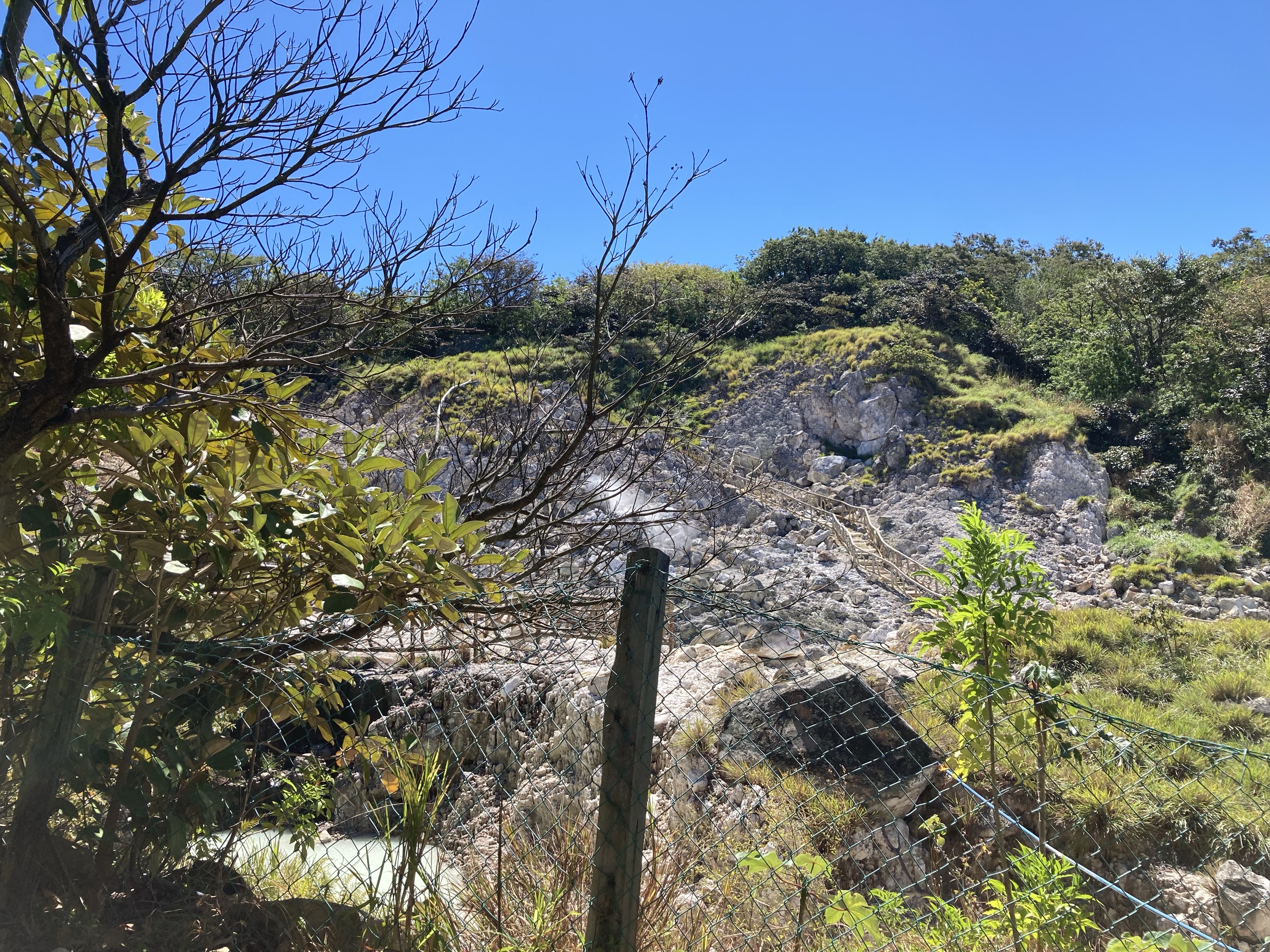 Puis reprenant la route après cet arrêt, la nature redevenait verdoyante et les arbres se faisaient plus fréquents. Les nuages blancs nous accompagnaient mais la chaleur était très prégnante. Continuant ma route vers Las Hornillas, j’ai traversé un pont où seule une voiture peut passer, j’ai croisé des maisons en bois blancs, des tuyaux en fer contenant les gaz des thermes, des fumerolles provenant des geysers, pour finir par arriver au bout d’une route sur les thermes recommandés par Yves de l’hôtel l’étoile Celeste.