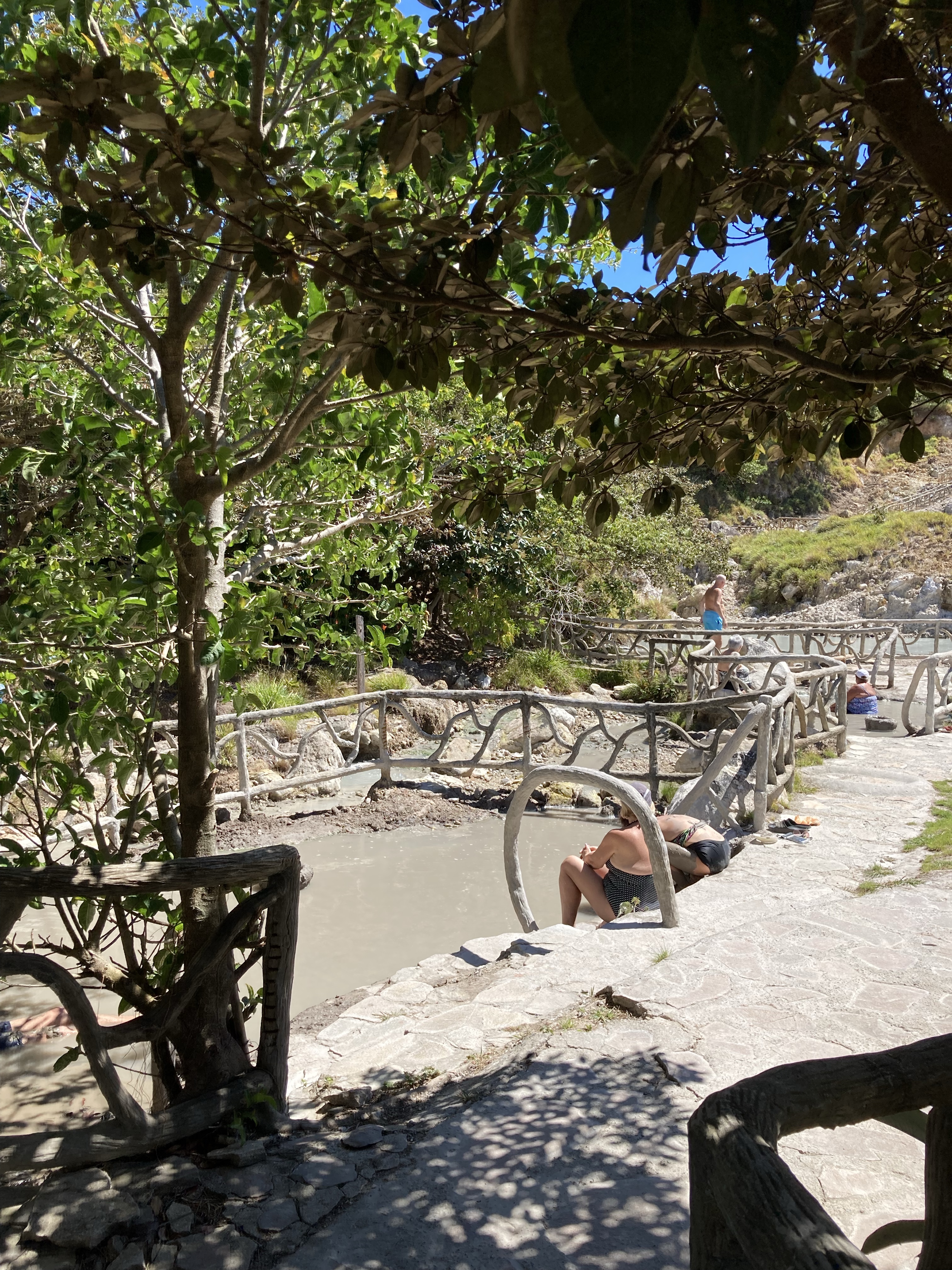 Le lieu est encaissé dans un cratère vivant ouvert, des vallons verts, recouverts d’arbres avec des chemins pour se promener mais le soleil tapait tellement fort que j’y ai renoncé. Tout autour il y a une rivière qui charrie de la boue et des éléments nutritifs pour les thermes. Plus la chaleur des thermes et de l’eau m’avait complètement ramolli. Un plongeon dans une eau très froide et les esprits revenaient.