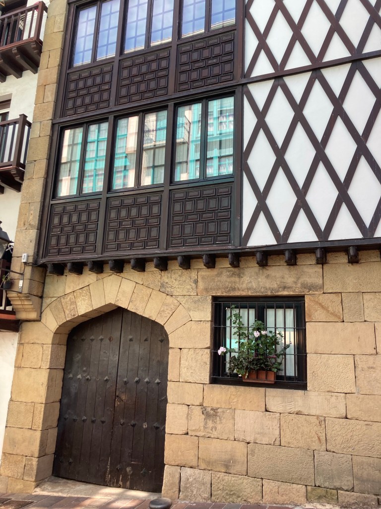 De très belles maisons à colombages et en pierre couleur de sable avec des portes ovales et des fenêtres en avancées dans les étages et des petites fenêtres avec des jolies fleurs blanches. Les portes en bois lourdes travaillées avec des clous ou bien des carrés alignés les uns au-dessus des autres.